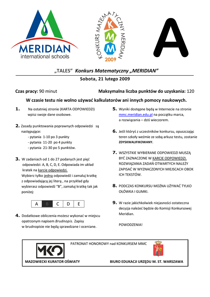 A „TALES” Konkurs Matematyczny „MERIDIAN” Sobota, 21 lutego 2009 Czas pracy: 90 minut Maksymalna liczba punktów do uzyskania: 120 W czasie testu nie wolno używać kalkulatorów ani innych pomocy naukowych. 1. Na ostatniej stronie (KARTA ODPOWIEDZI) wpisz swoje dane osobowe. 5. Wyniki dostępne będą w Internecie na stronie mmc.meridian.edu.pl na początku marca, a rozwiązania – dziś wieczorem. 2. Zasady punktowania poprawnych odpowiedzi są 6. Jeśli któryś z uczestników konkursu, opuszczając następujące: - pytania 1-10 po 3 punkty - pytania 11-20 po 4 punkty - pytania 21-30 po 5 punktów. teren szkoły weźmie ze sobą arkusz testu, zostanie ZDYSKWALIFIKOWANY. 7. WSZYSTKIE WYBIERANE ODPOWIEDZI MUSZĄ 3. W zadaniach od 1 do 27 podanych jest pięd odpowiedzi: A, B, C, D, E. Odpowiada im układ kratek na karcie odpowiedzi. Wybierz tylko jedną odpowiedź i zamaluj kratkę z odpowiadającą jej literą , na przykład gdy wybierasz odpowiedź “B”, zamaluj kratkę tak jak poniżej: A B C D E 4. Dodatkowe obliczenia możesz wykonad w miejscu opatrzonym napisem Brudnopis . Zapisy w brudnopisie nie będą sprawdzane i oceniane. BYD ZAZNACZONE W KARCIE ODPOWIEDZI. ROZWIĄZANIA ZADAO OTWARTYCH NALEŻY ZAPISAD W WYZNACZONYCH MIEJSCACH OBOK ICH TEKSTÓW. 8. PODCZAS KONKURSU MOŻNA UŻYWAD TYLKO OŁÓWKA I GUMKI. 9. W razie jakichkolwiek niejasności ostateczna decyzja należed będzie do Komisji Konkursowej Meridian. POWODZENIA! PATRONAT HONOROWY nad KONKURSEM MMC MAZOWIECKI KURATOR OŚWIATY BIURO EDUKACJI URZĘDU M. ST. WARSZAWA A 21 lutego 2009 MMC TALES 1. Jaka jest ostatnia cyfra liczby (A) 5 (B) 6 ? (D) 8 (C) 7 (E) 9 2. Wartośd wyrażenia (A)1 3. to (B) 2 (C) 20 (D) 60 (E)120 Kąt przy wierzchołku P ma 90: , a długośd odcinka PQ wynosi 8 cm. Jeśli trójkąt MPQ ma pole 24 cm2, to jego obwód (w cm) jest równy (A) 24 (B) 40 (C) 18 (D) 54 (E) 48 4. Pewnego dnia zauważyłem, że moja gazeta ma 24 strony, a strona 6 i 20 umieszczone są na tym samym podwójnym arkuszu. Które jeszcze strony są na tym samym arkuszu? (A) 7 i 19 (B) 5 i 21 (C) 5 i 19 (D) 7 i 21 (E) 8 i 22 5. ABCD i BGFE są prostokątami nałożonymi jak na rysunku. Pole ABCD to 80 cm2 , a pole BGFE to 60 cm2. Różnica pól czarnych obszarów ABED i BCEFG (w cm2) wynosi (A) 40 6. (B) 24 (C) 20 (D) 12 (E) nie wiadomo ile. 1000 punktów rozmieszczono równomiernie na okręgu i ponumerowano kolejno liczbami od 1 do 1000. Jaki numer ma punkt leżący naprzeciw punktu o numerze 657? (A) 156 (B) 157 (C) 158 (D) 159 (E) 160 7. Które z poniższych wyrażeo ma wartośd 2000? (A) 2|Strona (B) 2 3 53 (C) 3 2 54 (D) 2 4 53 (E) 23 54 A BRUDNOPIS 3|Strona MMC TALES 21 lutego 2009 A MMC TALES 8. Liczba (A) 0 9. jest najbliższa liczbie (B) 2 (C) ⅟₄ Od licznika i mianownika ułamka ułamek równy (A) 1 21 lutego 2009 (D) ⅟₂ (E) 1 odjęto tę samą liczbę naturalną i otrzymano . Jaką liczbę odejmowano? (B) 2 (C) 3 (D) 4 (E) 5 10. Jeśli 100 dzielimy przez liczbę naturalną x, reszta wynosi 2. Jeśli 198 dzielimy przez x reszta wynosi (A) 1 11. (B) 2 (C) 3 (D) 4 (E) 5 Która z poniższych nie jest liczbą pierwszą? (A) 22 – 2 + 1 (B) 23 – 22 + 2 – 1 (C) 24 – 23 + 22 – 2 + 1 (D) 25 – 24 + 23 – 22 + 2 – 1 (E) 26 – 25 + 24 – 23 + 22 – 2 + 1 12. Nauczyciel miał trzy torby cukierków, w jednej czekoladowe, w drugiej owocowe, a w trzeciej krówki. Każdy uczeo dostał pięd cukierków dwóch rodzajów. Każdy uczeo miał inny zestaw cukierków. Ilu, co najwyżej, uczniów mogło byd w klasie? (A) 10 (B) 12 (C) 15 (D) 18 (E) 60 13. Na rysunku ukośna linia dzieli pole trójkąta w stosunku 1 : 4. Jaki jest stosunek a:b? (A) 1:1 (B) 1:2 (C) 1:3 (D) 1:4 14. Reszta z dzielenia 32009 przez 5 wynosi (A) 0 (B) 1 (C) 2 (D) 3 4|Strona (E) 4 (E) 2:3 A BRUDNOPIS 5|Strona MMC TALES 21 lutego 2009 A 21 lutego 2009 MMC TALES 15. Ile liczb całkowitych spełnia nierównośd (A) 0 (B) 1 (C) 2 x 1 3 (D) 3 5 7 x 4 ? 5 (E) 4 16. W poprzednim tygodniu ośmiu wolontariuszy pracując po 40 godzin zbierało średnio 18 zł na godzinę. W tym tygodniu dwunastu wolontariuszy pracując po 32 godziny zebrało łącznie taką samą kwotę. Ile średnio na godzinę zbierali wolontariusze w tym tygodniu? A) 9 zł B) 12 zł C) 15 zł D) 21 zł E) 24 zł 17. Jeśli a d 2125 382 A) a, b, c, d 2126 382 5128 i 5129 , to pisząc w kolejności rosnącej otrzymamy 2129 381 5128 , b B) b, a, c, d 2127 381 5128 , c C) a, b, d, c D) b, c, d, a E) b, a, d, c 18. W trapezie prostokątnym krótsza podstawa ma długośd 8, a ramiona – 4 i 5. Jaki jest obwód tego trapezu? A) 27 B) 28 C) 29 D) 30 E) 32 19. Liczby 49, 29, 9, 40, 22, 15, 53, 33, 13, 47 połączono w pary tak, że suma w każdej parze jest taka sama. Która liczba jest w parze z liczbą 15? A) 33 B) 40 C) 47 D) 49 E) 53 20. Czterocyfrowa liczba 45*2 jest podzielna przez 12. Ile różnych wartości może przyjmowad *? A) 0 6|Strona B) 1 C) 2 D) 3 E) 4 A BRUDNOPIS 7|Strona MMC TALES 21 lutego 2009 A MMC TALES 21 lutego 2009 21. Jaś i Małgosia wybierają się do miasta odległego o 22,5 km. Mają jeden rower i muszą wyruszyd i przybyd na miejsce jednocześnie. Jaś wyjeżdża z prędkością 8 km/h, zostawia rower i idzie dalej z prędkością 5 km/h. Małgosia wyrusza pieszo z prędkością 4 km/h, a po dojściu do roweru jedzie na nim z prędkością 10 km/h. Przez ile minut rower nie będzie używany? A) 60 B) 75 C) 84 D) 94 E) 109 22. Ile jest takich liczb naturalnych x mniejszych niż 100, że 1 2 3 4 x też jest liczbą naturalną? A) 6 B) 7 C) 8 D) 9 E) 10 23. Jeśli , zaś a i b są dodatnimi liczbami całkowitymi, to jaką wartośd przyjmuje iloczyn ab? (A) 11 (B) 24 (C) 16 (D) 32 (E) 27 24. W sześcianie o krawędzi długości 2 środek jednej krawędzi P i dwa wierzchołki A i B połączono jak na rysunku. Pole trójkąta APB jest równe (A) 8 (B) 3 (C) 32 (D) 2 (E) 6 25. W trójkącie prostokątnym ABC przedstawionym na rysunku, AX=AD i CY=CD. Kąt XDY ma