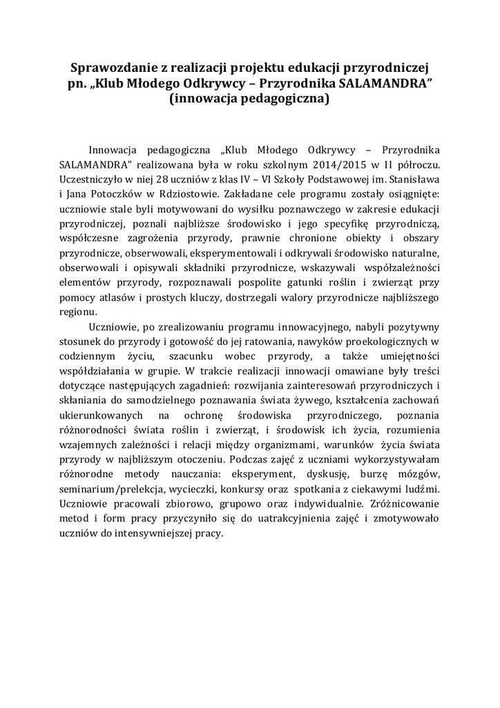 Sprawozdanie z realizacji projektu edukacji przyrodniczej pn. „Klub Młodego Odkrywcy – Przyrodnika SALAMANDRA” (innowacja pedagogiczna) Innowacja pedagogiczna „Klub Młodego Odkrywcy – Przyrodnika SALAMANDRA” realizowana była w roku szkolnym 2014/2015 w II półroczu. Uczestniczyło w niej 28 uczniów z klas IV – VI Szkoły Podstawowej im. Stanisława i Jana Potoczków w Rdziostowie. Zakładane cele programu zostały osiągnięte: uczniowie stale byli motywowani do wysiłku poznawczego w zakresie edukacji przyrodniczej, poznali najbliższe środowisko i jego specyfikę przyrodniczą, współczesne zagrożenia przyrody, prawnie chronione obiekty i obszary przyrodnicze, obserwowali, eksperymentowali i odkrywali środowisko naturalne, obserwowali i opisywali składniki przyrodnicze, wskazywali współzależności elementów przyrody, rozpoznawali pospolite gatunki roślin i zwierząt przy pomocy atlasów i prostych kluczy, dostrzegali walory przyrodnicze najbliższego regionu. Uczniowie, po zrealizowaniu programu innowacyjnego, nabyli pozytywny stosunek do przyrody i gotowość do jej ratowania, nawyków proekologicznych w codziennym życiu, szacunku wobec przyrody, a także umiejętności współdziałania w grupie. W trakcie realizacji innowacji omawiane były treści dotyczące następujących zagadnień: rozwijania zainteresowań przyrodniczych i skłaniania do samodzielnego poznawania świata żywego, kształcenia zachowań ukierunkowanych na ochronę środowiska przyrodniczego, poznania różnorodności świata roślin i zwierząt, i środowisk ich życia, rozumienia wzajemnych zależności i relacji między organizmami, warunków życia świata przyrody w najbliższym otoczeniu. Podczas zajęć z uczniami wykorzystywałam różnorodne metody nauczania: eksperyment, dyskusję, burzę mózgów, seminarium/prelekcja, wycieczki, konkursy oraz spotkania z ciekawymi ludźmi. Uczniowie pracowali zbiorowo, grupowo oraz indywidualnie. Zróżnicowanie metod i form pracy przyczyniło się do uatrakcyjnienia zajęć i zmotywowało uczniów do intensywniejszej pracy. Działania zawarte w harmonogramie innowacji zostały zrealizowane: 1. W marcu 2015r. Klub został zarejestrowany w Centrum Nauki Kopernik a w Warszawie i została rozpoczęta współpraca z Centrum. 2. 27 marca 2015 roku odbyło się pierwsze spotkanie Klubu Młodego Odkrywcy-Przyrodnika SALAMANDRA. Cykl spotkań Klubu rozpoczęła prelekcja ornitologa Pana profesora Tadeusza Zająca z Instytutu Ochrony Przyrody Polskiej Akademii Nauk w Krakowie. Uczniowie wysłuchali wykładu na temat dziko żyjących ptaków występujących na naszych podwórkach, w ogrodach i lasach. Klubowicze mieli możliwość poznać i nauczyć się rozpoznawać kilkanaście gatunków ptaków. Dowiedzieli się jakie są ich zachowania godowe, śpiew i strategie obronne, co im zagraża, jak również dowiedzieli się jak należy pomagać ptakom w zimie. Nauc zyli się jak powinny być zbudowane budki lęgowe dla odpowiednich gatunków ptaków oraz oglądały różne rodzaje obrączek służących do indywidualnego znakowania ptaków (inne dla sikor i inne dla odłów czy łabędzi). Podczas spotkania dzieci miały możliwość zobaczyć jak wygląda siatka ornitologiczna służąca do łapania ptaków i pomagały przy jej mocowaniu wśród zarośli wokół szkoły. Dowiedziały się również na czym polega praca naukowca/ornitologa i jak nim zostać. Korzystając z obecności tak znamienitego gościa z Polskiej Akademii Nauk w Krakowie została uroczyście odsłonięta tablica informująca, że nad Naszym Klubem patronat sprawuje Centrum Nauki Kopernik w Warszawie (jesteśmy pierwszym i jedynym Klubem Młodego Odkrywcy na Sądecczyźnie pod ich patronatem). Na zakończenie spotkania członkowie Klubu z rąk Pana profesora otrzymali legitymacje członkowskie Klubu Młodego Odkrywcy Przyrodnika SALAMANDRA. 3. W kwietniu 2015r. został ogłoszony konkurs „Przyjaciel Lasu”. 10 marca 2015 roku Jury w skład którego weszły pani Iwona Nowak oraz pani Marta Potoczek wybrało fi nalistów następujących kategorii: Konkurs rysunkowy "Bajkowy Las" Skierowany był on do dzieci w wieku przedszkolnym. W pracach konkursowych dzieci przedstawiły swoje wyobrażenie bajkowego lasu, jakie znają ze swoich ulubionych bajek i opowieści. W treści pracy można było umieścić elementy bajki np. postać ulubionego bohatera. Prace konkursowe można było wykonywać za pomocą dowolnej dwuwymiarowej techniki plastycznej (rysowanie, malowanie itp.), na wybranym materiale (papier, karton, płótno, itp.). Prace należało wykonać w formacie A4. W konkursie wzięło udział 8 przedszkolaków, wśród których: 1 miejsce zajęła: Zuzanna Pierzchała 2 miejsce zajęli: Bartosz Smajdor Filip Kądziołka 3 miejsce zajęła: Urszula Peciak Konkurs rysunkowy "Drzewa Naszych Lasów" Skierowany był on do uczniów klas I-III Szkół Podstawowych. Prace konkursowe na temat „Drzewa Naszych Lasów” należało wykonać w formie plakatu („gazetki”). Prace przedstawiają wybrany gatunek drzewa występujący na terenie Polski oraz przynajmniej jeden jego charakterystyczny szczegół (taki jak: owoce, liście, szyszki, nasiona). Pracę plastyczną można było wykonać na dowolnym materiale (papier, karton, płótno, itp.) i należało wykonać je w formacie A4. W konkursie wzięło udział 10 uczniów, wśród których: 1 miejsce zajęła: Patrycja Wróbel z kl. III 2 miejsce zajęły: Maria Potoczek z kl. I Patrycja Mróz z kl. II 3 miejsce zajęła: Oliwia Bodziony z kl. I Konkurs multimedialny "Przyjaciel Lasu" Skierowany był on do uczniów klas IV-VI Szkół Podstawowych oraz Gimnazjów. Na konkurs należało zgłaszać prace o następującej tematyce: „Kto jest przyjacielem lasu” - uczniowie klas IV - VI zaprezentowali kto w ich ocenie - jest przyjacielem lasu i dlaczego. Pracę należało przedstawić w formie prezentacji multimedialnej maksymalnie 10 sla