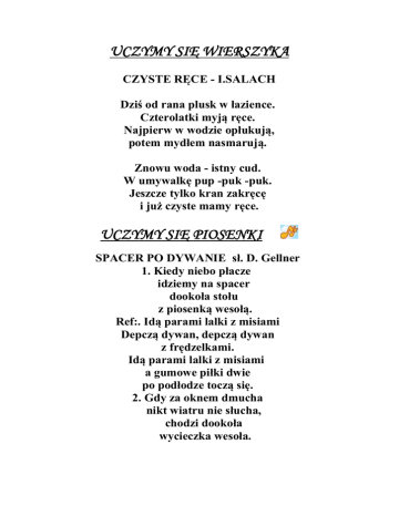 UCZYMY SIĘ WIERSZYKA CZYSTE RĘCE - I.SALACH Dziś od rana plusk w łazience. Czterolatki myją ręce. Najpierw w wodzie opłukują, potem mydłem nasmarują. Znowu woda - istny cud. W umywalkę pup -puk -puk. Jeszcze tylko kran zakręcę i już czyste mamy ręce. UCZYMY SIĘ PIOSENKI SPACER PO DYWANIE sł. D. Gellner 1. Kiedy niebo płacze idziemy na spacer dookoła stołu z piosenką wesołą. Ref:. Idą parami lalki z misiami Depczą dywan, depczą dywan z frędzelkami. Idą parami lalki z misiami a gumowe piłki dwie po podłodze toczą się. 2. Gdy za oknem dmucha nikt wiatru nie słucha, chodzi dookoła wycieczka wesoła.