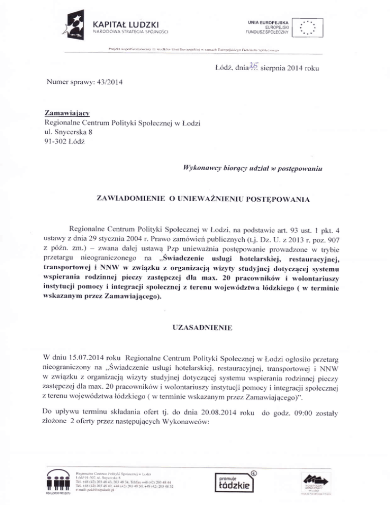 W dniu 15.07.2014 roku Regionalne Centrum Polityki Społecznej wŁodzi ogłosiłoprzetarg