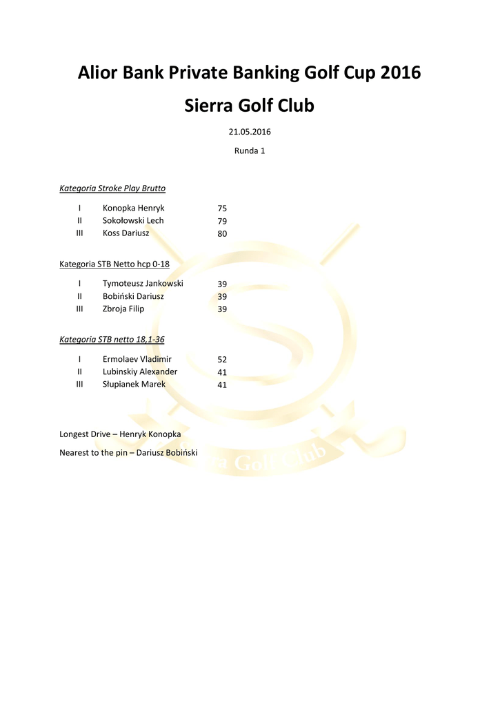 Alior Bank Private Banking Golf Cup 2016 Sierra Golf Club 21.05.2016 Runda 1 Kategoria Stroke Play Brutto I II III Konopka Henryk Sokołowski Lech Koss Dariusz 75 79 80 Kategoria STB Netto hcp 0-18 I II III Tymoteusz Jankowski Bobiński Dariusz Zbroja Filip 39 39 39 Kategoria STB netto 18,1-36 I II III Ermolaev Vladimir Lubinskiy Alexander Słupianek Marek Longest Drive – Henryk Konopka Nearest to the pin – Dariusz Bobiński 52 41 41