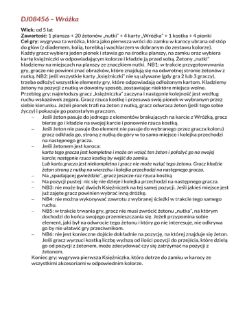 DJ08456 – Wróżka Wiek: od 5 lat Zawartość: 1 plansza + 20 żetonów „nutki” + 4 karty „Wróżka” + 1 kostka + 4 pionki Cel gry: wygrywa ta wróżka, która jako pierwsza wróci do zamku w karocy ubrana od stóp do głów (z diademem, kolią, torebką i wachlarzem w dobranym do zestawu kolorze). Każdy gracz wybiera jeden pionek i stawia go na środku planszy, na zamku oraz wybiera kartę księżniczki w odpowiadającym kolorze i kładzie ją przed sobą. Żetony „nutki” kładziemy na miejscach na planszy ze znaczkiem nutki. NB1: w trakcie przygotowywania gry, gracze nie powinni znać obrazków, które znajdują się na odwrotnej stronie żetonów z nutką. NB2: jeśli wszystkie karty „księżniczki” nie są używane (gdy gra 2 lub 3 graczy), trzeba odłożyć wszystkie elementy gry, które odpowiadają odłożonym kartom. Kładziemy żetony na pozycji z nutką w dowolny sposób, zostawiając niektóre miejsca wolne. Przebieg gry: najmłodszy gracz „księżniczka” zaczyna i następnie kolejność jest według ruchu wskazówek zegara. Gracz rzuca kostkę i przesuwa swój pionek w wybranym przez siebie kierunku. Jeżeli pionek trafi na żeton z nutką, gracz odwraca żeton (jeśli tego sobie życzy) i pokazuje go pozostałym graczom. Jeśli żeton pasuje do jednego z elementów brakujących na karcie z Wróżką, gracz bierze go i kładzie na swojej karcie i ponownie rzuca kostką. Jeśli żeton nie pasuje (bo element nie pasuje do wybranego przez gracza koloru) gracz odkłada go, stroną z nutką do góry w to samo miejsce i kolejka przechodzi na następnego gracza. Jeśli żetonem jest karoca: karta tego gracza jest kompletna i może on wziąć ten żeton i położyć go na swojej karcie; następnie rzuca kostką by wejść do zamku. Lub karta gracza jest niekompletna i gracz nie może wziąć tego żetonu. Gracz kładzie żeton stroną z nutką na wierzchu i kolejka przechodzi na następnego gracza. Na „spadającej gwieździe”, gracz jeszcze raz rzuca kostką Na pozycji pustej: nic się nie dzieje i kolejka przechodzi na następnego gracza. NB3: nie może być dwóch Księżniczek na tej samej pozycji. Jeśli jakieś miejsce jest już zajęte gracz powinien wybrać inną dróżkę. NB4: nie można wykonywać zawrotu z wybranej ścieżki w trakcie tego samego ruchu. NB5: w trakcie trwania gry, gracz nie musi zwrócić żetonu „nutka”, na którym dochodzi do końca swojego przemieszczania się. Jeżeli przypomina sobie element, jaki był na odwrocie tego żetonu i który go nie interesuje, nie odkrywa go by nie ułatwić gry przeciwnikom. NB6: nie jest konieczne dojście dokładnie na pozycję, na której znajduje się żeton. Jeśli gracz wyrzuci kostką liczbę wyższą od ilości pozycji do przejścia, które dzielą go od pozycji z żetonem, może zdecydować czy się zatrzymać na pozycji z żetonem. Koniec gry: wygrywa pierwsza Księżniczka, która dotrze do zamku w karocy ze wszystkimi akcesoriami w odpowiednim kolorze.
