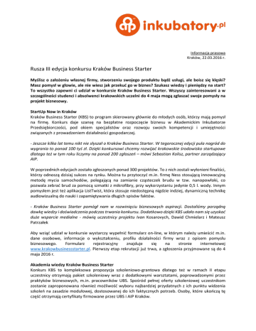 Informacja prasowa Kraków, 22.03.2016 r. Rusza III edycja konkursu Kraków Business Starter Myślisz o założeniu własnej firmy, stworzeniu swojego produktu bądź usługi, ale boisz się klęski? Masz pomysł w głowie, ale nie wiesz jak przekuć go w biznes? Szukasz wiedzy i pieniędzy na start? To wszystko zapewni ci udział w konkursie Kraków Business Starter. Wszyscy zainteresowani a w szczególności studenci i absolwenci krakowskich uczelni do 4 maja mogą zgłaszać swoje pomysły na projekt biznesowy. StartUp Now in Kraków Kraków Business Starter (KBS) to program skierowany głównie do młodych osób, którzy mają pomysł na firmę. Konkurs daje szansę na bezpłatne rozpoczęcie biznesu w Akademickim Inkubatorze Przedsiębiorczości, pod okiem specjalistów oraz rozwoju swoich kompetencji i umiejętności związanych z prowadzeniem działalności gospodarczej. - Jeszcze kilka lat temu nikt nie słyszał o Kraków Business Starter. W tegorocznej edycji pula nagród do wygrania to ponad 100 tyś zł. Dzięki konkursowi chcemy rozwijać krakowskie środowisko startupowe dlatego też w tym roku liczymy na ponad 200 zgłoszeń – mówi Sebastian Kolisz, partner zarządzający AIP. W poprzednich edycjach zostało zgłoszonych ponad 300 projektów. To z nich zostali wyłonieni finaliści, którzy odnoszą dzisiaj sukces na rynku. Można tu przytoczyć m.in. firmę Ness stosującą innowacyjną metodę mycia samochodów, polegającą na zamianie cząsteczek brudu w tzw. nanopowłoki, co pozwala zebrać brud za pomocą szmatki z mikrofibry, przy wykorzystaniu jedynie 0,5 l. wody. Innym pomysłem jest też aplikacja ListTwist, która stosuje niedostępną nigdzie indziej, dynamiczną technikę audiowizualną do nauki i zapamiętywania długich spisów faktów. - Kraków Business Starter pomógł nam w rozwinięciu biznesowych aspiracji. Dostaliśmy porządną dawkę wiedzy i doświadczenia podczas trwania konkursu. Dodatkowo dzięki KBS udało nam się uzyskać duże wsparcie medialne - mówią uczestnicy projektu Ivan Kosarovych, Dawid Chmielarz i Mateusz Patrzałek Aby wziąć udział w konkursie wystarczy wypełnić formularz on-line, w którym należy umieścić m.in. dane osobowe, informacje o wykształceniu, profilu działalności firmy wraz z opisem pomysłu biznesowego. Formularz rejestracyjny znajduje się na stronie internetowej www.krakowbusinessstarter.pl. Pierwszy etap rekrutacji już trwa, a zgłoszenia przyjmowane są do 4 maja 2016 r. Akademia wiedzy Kraków Business Starter Konkurs KBS to kompleksowa propozycja szkoleniowo-grantowa dlatego też w ramach II etapu uczestnicy otrzymają pakiet szkoleniowy wraz z dodatkowymi warsztatami, poprowadzonymi przez praktyków biznesowych, m.in. pracowników UBS. Spośród pełnej oferty szkoleniowej uczestnikom zostanie zaproponowana również możliwość wyboru najbardziej przydatnych z ich punktu widzenia szkoleń na zasadzie modułowej, dostosowanej do ich faktycznych potrzeb. Osoby, które ukończą tę część otrzymają certyfikaty firmowane przez UBS i AIP Kraków. Zderzenie z rzeczywistością Trzeci etap projektu to tzw. okres inkubacji trwający 6 miesięcy, podczas którego 10 uczestników konkursu będzie miało możliwość zweryfikować i przetestować swój pomysł na biznes. W ramach programu preinkubacji w AIP Kraków każda firma otrzyma: osobowość prawną do prowadzenia firmy dzięki czemu nie będą zmuszeni płacić składek ZUS, obsługę księgową oraz prawną, dostęp do przestrzeni biurowej, mentoring oraz możliwość uczestnictwa w wydarzeniach i spotkaniach networkingowych organizowanych przez AIP Kraków. Po okresie bezpłatnej inkubacji, 4 najlepsze projekty otrzymają nagrodę w wysokości 10 000 zł. Wyboru zwycięzców dokona Komisja Konkursowa składająca się z przedstawicieli AIP Kraków oraz Mecenasa działań AIP Kraków firmy UBS. - UBS jest instytucją finansową, która m.in. świadczy usługi przedsiębiorcom odnoszącym znaczące sukcesy na całym świecie. Powodzenie poprzednich edycji pozwala wierzyć, że dzięki Krakow Business Starter powstaną w Krakowie firmy, które odniosą podobne osiągnięcia. Ten program powstał w ramach naszej strategii odpowiedzialności społecznej biznesu, której jednym z głównych założeń jest działanie na rzecz społeczności lokalnej. Krakow Business Starter przyciąga utalentowanych studentów i absolwentów, którzy dzięki naszej pomocy nie boją się ryzykować i budować swoich zamierzeń biznesowych przyczyniając się do prężnego rozwoju miasta – podsumowuje Michał Stępień, General Manager UBS Kraków. Projekt realizowany jest przez Akademickie Inkubatory Przedsiębiorczości w Krakowie oraz Mecenasa działań AIP Kraków firmę UBS. Więcej informacji o konkursie możemy uzyskać na stronie projektu www.krakowbusinessstarter.pl. Inkubatory AIP (AIP) są praktyczną szkołą prowadzenia biznesu dla startupów. AIP umożliwiają przetestowanie pomysłów na rynku na preferencyjnych warunkach i bez konieczności rejestracji działalności gospodarczej lub spółki. AIP to także jedyny ekosystem w Polsce umożliwiający uzyskanie finansowania na rozwój w najprostszym modelu inwestycji – 100/15 czyli 100 000 zł za 15% udziałów w startupie. Dzięki tej innowacyjnej na skalę europejską sieci 50 inkubatorów, od 2004 roku AIP pomogło rozwinąć się ponad 10 000 początkującym przedsiębiorstwom, a obecnie pod swoimi skrzydłami ma 2112 startupów. Wśród nich znalazły się m.in.: Qpony.pl, MISBHV, Glov. Obecnie w AIP Kraków działa około 350 firm. Więcej informacji: www.inkubatory.pl Twitter: @inkubatorypl Facebook: inkubatorypl UBS istnieje od ponad 150 lat, działa w ponad 50 krajach (włączając najważniejsze ośrodki finansowe) i zatrudnia ok. 62 tysiące pracowników. Główne siedziby UBS znajdują się w Zurychu i Bazylei w Szwajcarii. Firma UBS świadczy usługi bankowości prywatnej oraz korporacy