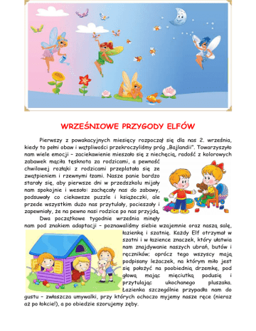 WRZEŚNIOWE PRZYGODY ELFÓW Pierwszy z powakacyjnych miesięcy rozpoczął się dla nas 2. września, kiedy to pełni obaw i wątpliwości przekroczyliśmy próg „Bajlandii”. Towarzyszyło nam wiele emocji – zaciekawienie mieszało się z niechęcią, radość z kolorowych zabawek mąciła tęsknota za rodzicami, a pewność chwilowej rozłąki z rodzicami przeplatała się ze zwątpieniem i rzewnymi łzami. Nasze panie bardzo starały się, aby pierwsze dni w przedszkolu mijały nam spokojnie i wesoło: zachęcały nas do zabawy, podsuwały co ciekawsze puzzle i książeczki, ale przede wszystkim dużo nas przytulały, pocieszały i zapewniały, że na pewno nasi rodzice po nas przyjdą. Dwa początkowe tygodnie września minęły nam pod znakiem adaptacji – poznawaliśmy siebie wzajemnie oraz naszą salę, łazienkę i szatnię. Każdy Elf otrzymał w szatni i w łazience znaczek, który ułatwia nam znajdywanie naszych ubrań, butów i ręczników; oprócz tego wszyscy mają podpisany leżaczek, na którym miło jest się położyć na poobiednią drzemkę, pod głową mając mięciutką podusię i przytulając ukochanego pluszaka. Łazienka szczególnie przypadła nam do gustu – zwłaszcza umywalki, przy których ochoczo myjemy nasze ręce (nieraz aż po łokcie!), a po obiedzie szorujemy zęby. W tym miesiącu ustaliliśmy najważniejsze zasady dotyczące bezpiecznego, komfortowego i przyjemnego spędzania czasu w przedszkolu: każdy Elf „podpisał się” pod obrazkami przedstawiającymi te ustalenia poprzez odciśnięcie swojego palca w farbie. Odtąd wielki plakat „Kontrakt grupy ELFY” zdobi drzwi naszej sali, a gdy ktoś zapomina o jakiejś zasadzie, zawsze może na niego zerknąć w celu przypomnienia jej sobie. Poznaliśmy już kilka fajnych zabaw – najbardziej do gustu przypadł nam „Balonik”, „Pajacyk” i „Stary niedźwiedź”. Z entuzjazmem masujemy plecy naszym kolegom i koleżankom przy piosence pt. „W kole”, ilustrujemy gestem wierszyk – wyliczankę pt. „Słoneczko świeci”, a także naśladujemy ruchy różnych zwierząt przy Walcu Es – dur op. 18 F. Chopina. Mieliśmy również przyjemność obejrzeć teatrzyk lalkowy, który przybył do naszego przedszkola z bajką pt. „Pinokio” - trzeba przyznać, że zachowywaliśmy się nad wyraz kulturalnie, za co nasze panie bardzo nas pochwaliły. Wiele frajdy sprawiają nam prace plastyczne – uwielbiamy malować farbami (czego efekty można podziwiać w szatni) i rysować; samodzielnie zrobiliśmy sobie wizytówki z imionami na krzesełka za pomocą kolorowych emblematów i kleju. Pod koniec września rozmawialiśmy sobie o samodzielności – nazywaliśmy przedmioty niezbędne do higieny osobistej, ćwiczyliśmy samodzielne ubieranie i rozbieranie się (niektórzy z nas już całkiem nieźle radzą sobie z tymi czynnościami) oraz staraliśmy się pięknie i kulturalnie spożywać posiłki. W połowie miesiąca poznaliśmy jeszcze jednego kolegę – kotka Cookie'go, który zawitał do nas z p. Kasią, aby rozmawiać i śpiewać z nami w języku angielskim. Musimy przyznać, że natychmiast skradł nasze serca i zaskarbił sobie naszą przyjaźń, więc cztery razy w tygodniu czekamy na niego z niecierpliwością, zaraz po skończeniu śniadania. I tak minął nam pierwszy miesiąc przygody z „Bajlandią”. Z niecierpliwością czekamy na kolejny, z nadzieją, że będzie obfity w pozytywne emocje i ciekawe niespodzianki:) Poznaliśmy piosenki: „W kole” Rysujemy z koła uśmiechnięte słońce, kolorowe kwiaty na zielonej łące. Potem wszystkie dzieci tańczyć chcą wesoło, więc chwytamy się za ręce i tańczymy wkoło: najpierw koło jest malutkie, ale bardzo okrąglutkie; potem rośnie, potem pęka i już kończy się piosenka. „Przedszkolaczek” 1. Jestem sobie przedszkolaczek, nie grymaszę i nie płaczę, na bębenku marsza gram, ram tam tam, ram tam, tam. 2. Mamy tu zabawek wiele, razem bawić się weselej, bo kolegów dobrych mam, ram tam tam, ram tam tam. „Myję zęby” Szczotka, pasta, kubek, ciepła woda − tak się zaczyna wielka przygoda. Myję zęby, bo wiem dobrze o tym: kto ich nie myje, ten ma kłopoty. Żeby zdrowe zęby mieć, trzeba tylko chcieć! Szczotko, szczotko, hej, szczoteczko, o, o, o; zatańcz ze mną, tańcz w kółeczko, o, o, o. W prawo, w lewo, w lewo, w prawo, o, o, o, po jedzeniu kręć się żwawo, o, o, o. Bo to bardzo ważna rzecz, żeby zdrowe zęby mieć! „Krasnoludki” My jesteśmy krasnoludki, hopsa sa; hopsa sa, pod grzybkami nasze budki, hopsa sa; hopsa sa. Jemy mrówki, żabie łapki, oj, tak, tak; oj, tak, tak a na głowach krasne czapki, to nasz znak; to nasz znak. Gdy ktoś zbłądzi, to trąbimy, trutu tu, trutu tu, gdy ktoś senny, to uśpimy, lulu lu, lulu lu. Gdy ktoś skrzywdzi krasnoludka, ojojoj; ojojoj, to zapłacze niezabudka, ajajaj, ajajjaj. „Idzie Jaś” Idzie Jaś, idzie Staś, idzie też Marysia. Wszyscy dziś grzeczni są i nie tylko dzisiaj. Tup, tup, tup, tup, tup, tup: daleko wędrują; hop, hop, hop, hop, hop, hop: lekko podskakują. „Jedzie pociąg” Jedzie pociąg z daleka, na nikogo nie czeka; konduktorze łaskawy, zawieź nas do Warszawy. Trudno, trudno to będzie, dużo dzieci jest wszędzie, a więc szybko wsiadajcie, do Warszawy ruszajcie. Poznaliśmy wierszyki: „Słoneczko świeci” Słoneczko świeci dla grzecznych dzieci, a dla niegrzecznych wcale nie świeci! Gwiazdki mrugają, rybki pływają, motylek poleciał w daleki świat. Pod lasem chateńka, a przy niej sarenka. Zajączek tam mały i drugi do pary; sosna jak wielkolud! Maleńki krasnolud pod grzybkiem się schował, zwierzątka rachował: dziesięć palców mam, każdy stoi sam. Czasem sobie porachuję, czy któregoś nie brakuje, czy je wszystkie mam, czy je wszystkie mam: pierwszy palec wielki; drugi wskazujący na figielki; trzeci palec to największy; czwarty palec trochę mniejszy; piąty palec to jest mały − 