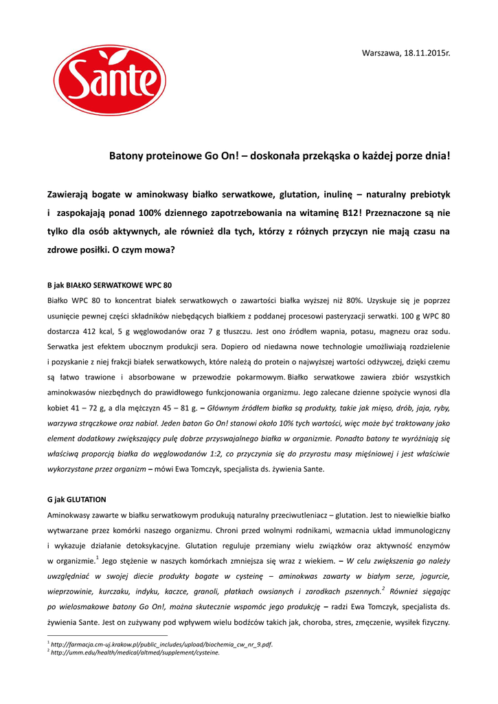 Warszawa, 18.11.2015r. Batony proteinowe Go On! – doskonała przekąska o każdej porze dnia! Zawierają bogate w aminokwasy białko serwatkowe, glutation, inulinę – naturalny prebiotyk i zaspokajają ponad 100% dziennego zapotrzebowania na witaminę B12! Przeznaczone są nie tylko dla osób aktywnych, ale również dla tych, którzy z różnych przyczyn nie mają czasu na zdrowe posiłki. O czym mowa? B jak BIAŁKO SERWATKOWE WPC 80 Białko WPC 80 to koncentrat białek serwatkowych o zawartości białka wyższej niż 80%. Uzyskuje się je poprzez usunięcie pewnej części składników niebędących białkiem z poddanej procesowi pasteryzacji serwatki. 100 g WPC 80 dostarcza 412 kcal, 5 g węglowodanów oraz 7 g tłuszczu. Jest ono źródłem wapnia, potasu, magnezu oraz sodu. Serwatka jest efektem ubocznym produkcji sera. Dopiero od niedawna nowe technologie umożliwiają rozdzielenie i pozyskanie z niej frakcji białek serwatkowych, które należą do protein o najwyższej wartości odżywczej, dzięki czemu są łatwo trawione i absorbowane w przewodzie pokarmowym. Białko serwatkowe zawiera zbiór wszystkich aminokwasów niezbędnych do prawidłowego funkcjonowania organizmu. Jego zalecane dzienne spożycie wynosi dla kobiet 41 – 72 g, a dla mężczyzn 45 – 81 g. – Głównym źródłem białka są produkty, takie jak mięso, drób, jaja, ryby, warzywa strączkowe oraz nabiał. Jeden baton Go On! stanowi około 10% tych wartości, więc może być traktowany jako element dodatkowy zwiększający pulę dobrze przyswajalnego białka w organizmie. Ponadto batony te wyróżniają się właściwą proporcją białka do węglowodanów 1:2, co przyczynia się do przyrostu masy mięśniowej i jest właściwie wykorzystane przez organizm – mówi Ewa Tomczyk, specjalista ds. żywienia Sante. G jak GLUTATION Aminokwasy zawarte w białku serwatkowym produkują naturalny przeciwutleniacz – glutation. Jest to niewielkie białko wytwarzane przez komórki naszego organizmu. Chroni przed wolnymi rodnikami, wzmacnia układ immunologiczny i wykazuje działanie detoksykacyjne. Glutation reguluje przemiany wielu związków oraz aktywność enzymów 1 w organizmie. Jego stężenie w naszych komórkach zmniejsza się wraz z wiekiem. – W celu zwiększenia go należy uwzględniać w swojej diecie produkty bogate w cysteinę – aminokwas zawarty w białym serze, jogurcie, 2 wieprzowinie, kurczaku, indyku, kaczce, granoli, płatkach owsianych i zarodkach pszennych. Również sięgając po wielosmakowe batony Go On!, można skutecznie wspomóc jego produkcję – radzi Ewa Tomczyk, specjalista ds. żywienia Sante. Jest on zużywany pod wpływem wielu bodźców takich jak, choroba, stres, zmęczenie, wysiłek fizyczny. 1 2 http://farmacja.cm-uj.krakow.pl/public_includes/upload/biochemia_cw_nr_9.pdf. http://umm.edu/health/medical/altmed/supplement/cysteine. Bez niego komórki podlegałyby nieustającemu utlenianiu i tym samym niszczeniu, organizm wykazywałby wówczas słabą odporność na zakażenia bakteryjne i wirusowe, a wątroba ulegałaby uszkodzeniu pod wpływem gromadzących się w niej toksyn. I jak INULINA Jako naturalny prebiotyk jest idealną pożywką dla dobroczynnych bakterii jelitowych, które wytwarzają ważne dla naszego zdrowia witaminy z grupy B i witaminę K oraz wspomagają wchłanianie ważnych dla kości minerałów –wapnia, cynku, magnezu, itp. Zdrowa flora bakteryjna jelit stanowi barierę dla chorobotwórczych bakterii, odciążając układ odpornościowy od nieustannej walki z mikroorganizmami, która osłabia cały organizm i czyni go podatnym na wiele chorób. – Jest to ważny składnik batonów proteinowych Go On! Sante dostępnych w czterech smakach (kakaowym, żurawinowym, waniliowym i orzechowym), które pełnią funkcję szybkiej przekąski o dużej zawartości białka i węglowodanów. Posiada około 30% słodyczy sacharozy. Jej indeks glikemiczny wynosi 14 i wyróżnia się niewielką 3 wartością energetyczną (1,5 kcal/1 g), dzięki temu mogą ją spożywać również diabetycy i osoby dbające o linię – mówi Ewa Tomczyk, specjalista ds. żywienia Sante. Ponadto obniża pH jelita grubego ograniczając zachodzące w nim pod wpływem beztlenowców procesy gnilne. Dzięki stymulowaniu pożytecznych bakterii jelitowych może być także pomocna dla osób, u których za sprawą wielu czynników, np. stresu, nieprawidłowej diety, siedzącego stylu życia lub antybiotykoterapii, zaszły niekorzystne zmiany w mikroflorze bakteryjnej jelit. W jak WITAMINA B12 Witamina B12 często nazywana „czerwoną witaminą” jest niezbędna do prawidłowego funkcjonowania mózgu i układu nerwowego, wytwarzania krwi, kwasów tłuszczowych i energii. Bierze aktywny udział w procesie metabolizmu zarówno przed, jak i po treningu. Zmniejsza uczucie zmęczenia i wzmacnia układ odpornościowy i pokarmowy. Nie jest syntetyzowana w organizmie, więc musi być dostarczana wraz z pożywieniem. Znajdziemy ją w produktach pochodzenia zwierzęcego, takich jak jajka, sery, ryby, mięso. – Witamina B12 zawarta w produktach nabiałowych jest szczególnie dobrze przyswajalna przez organizm – przypomina Ewa Tomczyk, specjalista ds. żywienia Sante – Osoby dorosłe powinny spożywać 2,4 µg witaminy B12 na dobę. Zapotrzebowanie to może się jednak różnić u poszczególnych osób. Batony Go On! Sante w czterech smakach zawierają całodzienną dawkę – od 2,65 µg do 2,9 µg, co stanowi ponad 100% dziennego zapotrzebowania, a baton Go On! Energy – 1,4 µg. Batony Go On! Sante to produkt zarówno dla osób aktywnych sportowo, jak i dla wszystkich szukających wartościowej przekąski w ciągu dnia. Bogate w białko serwatkowe WPC 80, glutation, inulinę i witaminę B12 pozwolą na utrzymanie formy przez cały dzień. W serii Go On! znajdzie się też coś dla miłośników kawy. Baton Go On! Energy wzbogacony w żeń – szeń i guaranę, zawiera kofeinę i ma dział