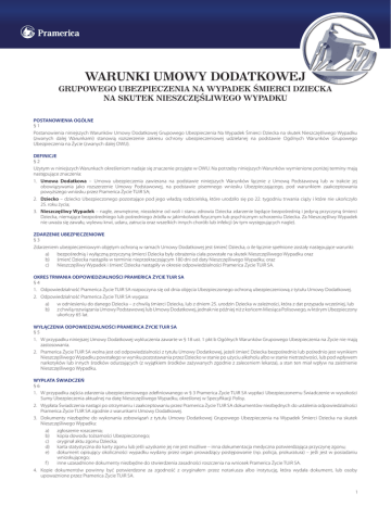 WARUNKI UMOWY DODATKOWEJ GRUPOWEGO UBEZPIECZENIA NA WYPADEK ÂMIERCI DZIECKA NA SKUTEK NIESZCZ¢ÂLIWEGO WYPADKU POSTANOWIENIA OGÓLNE §1 Postanowienia niniejszych Warunków Umowy Dodatkowej Grupowego Ubezpieczenia Na Wypadek Śmierci Dziecka na skutek Nieszczęśliwego Wypadku (zwanych dalej Warunkami) stanowią rozszerzenie zakresu ochrony ubezpieczeniowej udzielanej na podstawie Ogólnych Warunków Grupowego Ubezpieczenia na Życie (zwanych dalej OWU). DEFINICJE §2 Użytym w niniejszych Warunkach określeniom nadaje się znaczenie przyjęte w OWU. Na potrzeby niniejszych Warunków wymienione poniżej terminy mają następujące znaczenia: 1.Umowa Dodatkowa – Umowa ubezpieczenia zawierana na podstawie niniejszych Warunków łącznie z Umową Podstawową lub w trakcie jej obowiązywania jako rozszerzenie Umowy Podstawowej, na podstawie pisemnego wniosku Ubezpieczającego, pod warunkiem zaakceptowania powyższego wniosku przez Pramerica Życie TUiR SA; 2.Dziecko – dziecko Ubezpieczonego pozostające pod jego władzą rodzicielską, które urodziło się po 22. tygodniu trwania ciąży i które nie ukończyło 25. roku życia; 3.Nieszczęśliwy Wypadek – nagłe, zewnętrzne, niezależne od woli i stanu zdrowia Dziecka zdarzenie będące bezpośrednią i jedyną przyczyną śmierci Dziecka, niemające bezpośredniego lub pośredniego źródła w jakimkolwiek fizycznym lub psychicznym schorzeniu Dziecka. Za Nieszczęśliwy Wypadek nie uważa się zawału, wylewu krwi, udaru, zatrucia oraz wszelkich innych chorób lub infekcji (w tym występujących nagle). ZDARZENIE UBEZPIECZENIOWE §3 Zdarzeniem ubezpieczeniowym objętym ochroną w ramach Umowy Dodatkowej jest śmierć Dziecka, o ile łącznie spełnione zostały następujące warunki: a) bezpośrednią i wyłączną przyczyną śmierci Dziecka były obrażenia ciała powstałe na skutek Nieszczęśliwego Wypadku oraz b) śmierć Dziecka nastąpiła w terminie nieprzekraczającym 180 dni od daty Nieszczęśliwego Wypadku; oraz c) Nieszczęśliwy Wypadek i śmierć Dziecka nastąpiły w okresie odpowiedzialności Pramerica Życie TUiR SA. OKRES TRWANIA ODPOWIEDZIALNOŚCI PRAMERICA ŻYCIE TUiR SA §4 1. Odpowiedzialność Pramerica Życie TUiR SA rozpoczyna się od dnia objęcia Ubezpieczonego ochroną ubezpieczeniową z tytułu Umowy Dodatkowej. 2. Odpowiedzialność Pramerica Życie TUiR SA wygasa: a) w odniesieniu do danego Dziecka – z chwilą śmierci Dziecka, lub z dniem 25. urodzin Dziecka w zależności, która z dat przypada wcześniej, lub b)z chwilą rozwiązania Umowy Podstawowej lub Umowy Dodatkowej, jednak nie później niż z końcem Miesiąca Polisowego, w którym Ubezpieczony ukończy 65 lat. WYŁĄCZENIA ODPOWIEDZIALNOŚCI PRAMERICA ŻYCIE TUiR SA §5 1.W przypadku niniejszej Umowy Dodatkowej wykluczenia zawarte w § 18 ust. 1 pkt b Ogólnych Warunków Grupowego Ubezpieczenia na Życie nie mają zastosowania. 2.Pramerica Życie TUiR SA wolna jest od odpowiedzialności z tytułu Umowy Dodatkowej, jeżeli śmierć Dziecka bezpośrednio lub pośrednio jest wynikiem Nieszczęśliwego Wypadku powstałego w wyniku pozostawania przez Dziecko w stanie po użyciu alkoholu albo w stanie nietrzeźwości, lub pod wpływem narkotyków lub innych środków odurzających (z wyjątkiem środków zażywanych zgodnie z zaleceniem lekarza), a stan ten miał wpływ na zaistnienie Nieszczęśliwego Wypadku. WYPŁATA ŚWIADCZEŃ §6 1.W przypadku zajścia zdarzenia ubezpieczeniowego zdefiniowanego w § 3 Pramerica Życie TUiR SA wypłaci Ubezpieczonemu Świadczenie w wysokości Sumy Ubezpieczenia aktualnej na datę Nieszczęśliwego Wypadku, określonej w Specyfikacji Polisy. 2.Wypłata Świadczenia nastąpi po otrzymaniu i zaakceptowaniu przez Pramerica Życie TUiR SA dokumentów niezbędnych do ustalenia odpowiedzialności Pramerica Życie TUiR SA zgodnie z warunkami Umowy Dodatkowej. 3.Dokumenty niezbędne do wykonania zobowiązań z tytułu Umowy Dodatkowej Grupowego Ubezpieczenia na Wypadek Śmierci Dziecka na skutek Nieszczęśliwego Wypadku: a) zgłoszenie roszczenia; b) kopia dowodu tożsamości Ubezpieczonego; c) oryginał aktu zgonu Dziecka; d) karta statystyczna do karty zgonu lub jeśli uzyskanie jej nie jest możliwe – inna dokumentacja medyczna potwierdzająca przyczynę zgonu; e)dokument opisujący okoliczności wypadku wydany przez organ prowadzący postępowanie (np. policja, prokuratura) – jeśli jest w posiadaniu wnioskującego; f ) inne uzasadnione dokumenty niezbędne do stwierdzenia zasadności roszczenia na wniosek Pramerica Życie TUiR SA. 4.Kopie dokumentów powinny być potwierdzone za zgodność z oryginałem przez notariusza albo instytucję, która wydała dokument, lub osoby upoważnione przez Pramerica Życie TUiR SA. 1 POSTANOWIENIA KOŃCOWE §7 1.Wszelkie sprawy nieuregulowane niniejszymi Warunkami podlegają uregulowaniom OWU, Specyfikacji Polisy oraz właściwym przepisom obowiązującego prawa. 2.Niniejsze Warunki Umowy Dodatkowej Grupowego Ubezpieczenia na Wypadek Śmierci Dziecka na skutek Nieszczęśliwego Wypadku zostały zatwierdzone Uchwałą Nr 7/06/2011 Zarządu Pramerica Życie TUiR SA z dnia 29 czerwca 2011 r. i wchodzą w życie z dniem 1 sierpnia 2011 r. Prezes Zarządu Pramerica Życie TUiR SA Helena Gosk Członek Zarządu Pramerica Życie TUiR SA M-002-GB/OWU-ACHL/I Beata Andruszkiewicz 2