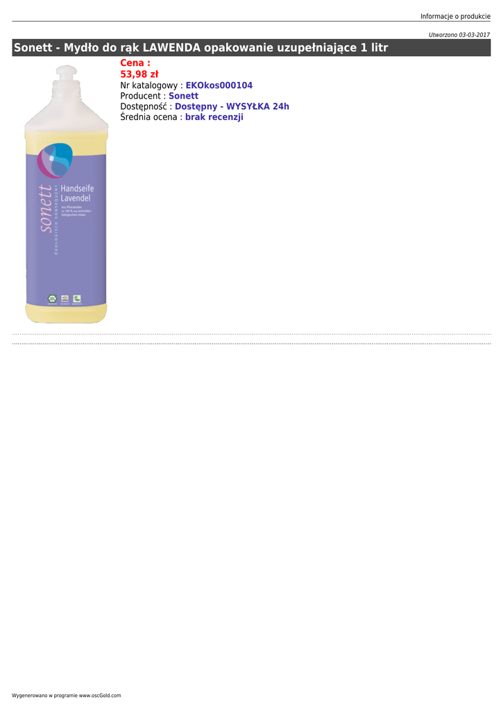 Informacje o produkcie Utworzono 03-03-2017 Sonett - Mydło do rąk LAWENDA opakowanie uzupełniające 1 litr Cena : 53,98 zł Nr katalogowy : EKOkos000104 Producent : Sonett Dostępność : Dostępny - WYSYŁKA 24h Średnia ocena : brak recenzji Wygenerowano w programie www.oscGold.com