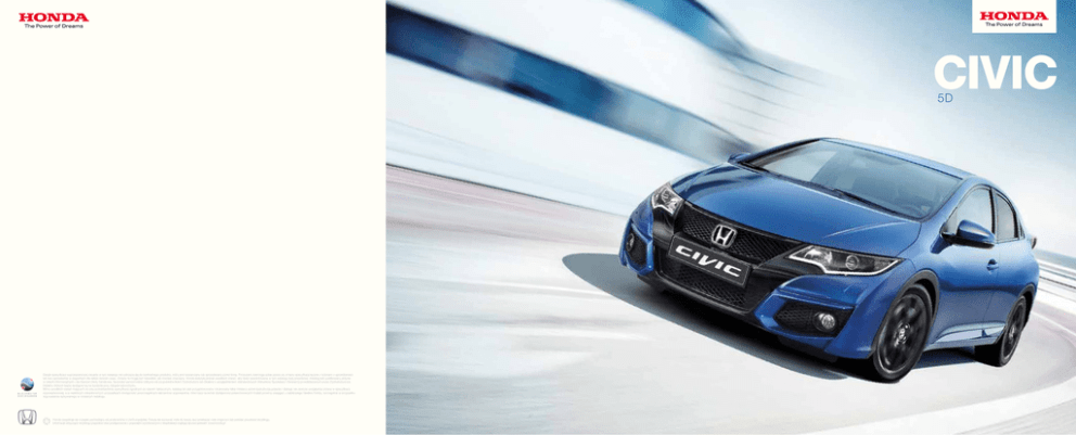 CIVIC 5D Detale specyfikacji wyposażeniowej zawarte w tym katalogu nie odnoszą się do konkretnego produktu, który jest dostarczany lub sprzedawany przez firmę. Producent zastrzega sobie prawo do zmiany specyfikacji łącznie z kolorami z uprzedzeniem lub bez uprzedzenia w dogodnym dla siebie okresie czasu. Zmiany te mogą być niewielkie, jak również znaczące. Honda dołożyła jednak wszelkich starań, aby treści prezentowane w tym katalogu były prawdziwe. Katalog jest publikowany jedynie w celach informacyjnych i nie stanowi oferty handlowej. Sprzedaż samochodów odbywa się za pośrednictwem Dystrybutora lub Dealera z uwzględnieniem standardowych Warunków Sprzedaży i Gwarancji przedstawianych przez Dystrybutora lub Dealera, których kopie dostępne są na życzenie przy zakupie samochodu. Mimo wszelkich starań mających na celu przedstawienie specyfikacji zgodnych ze stanem faktycznym, katalog ten jest przygotowywany i drukowany kilka miesięcy przed dystrybucją pojazdu i dlatego nie zawsze uwzględnia zmiany w specyfikacji wyposażeniowej, a w niektórych odosobnionych przypadkach dostępność poszczególnych elementów wyposażenia. Informacji na temat dostępności prezentowanych modeli prosimy zasięgać u najbliższego Dealera Hondy, szczególnie w przypadku wyposażenia opisywanego w niniejszym katalogu. Honda zaopatruje się w papier pochodzący od producentów z Unii Europejskiej. Proszę nie wyrzucać mnie do kosza, lecz przekazać mnie znajomym lub poddać procesowi recyklingu. Informacje dotyczące recyklingu pojazdów oraz postępowania z pojazdami wycofywanymi z eksploatacji znajdują się pod adresem www.honda.pl 01 : WSTĘP SPIS TREŚCI 03 STYLISTYKA NADWOZIA 07 STYLISTYKA WNĘTRZA 09 TECHNOLOGIA 11 KOMFORT WNĘTRZA 13 SYSTEM SIEDZEŃ „MAGIC SEATS” 15 OSIĄGI 17 TECHNOLOGIA EARTH DREAMS 19 BEZPIECZEŃSTWO 23 TWÓJ CIVIC 25 GAMA MODELOWA 36 TAPICERKA 37 KOLORY 39 OPCJE 43 SPECYFIKACJA 47 DNA HONDY CIVIC 49 THE POWER OF DREAMS NOWA HONDA CIVIC 5D ZAAWANSOWANA I SPORTOWA W Hondzie nieustannie dążymy do przekraczania kolejnych granic oraz tworzenia bardziej wydajnych samochodów z coraz to mocniejszymi silnikami, które dają ogromną przyjemność z jazdy. Nowa gama Hondy Civic jest doskonałym przykładem tego podejścia. Udoskonalony i przeprojektowany model odznacza się spektakularną stylizacją nadwozia – odzwierciedlającą osiągi i zaawansowane technologie, które zapewniają Ci łączność podczas jazdy – a także wysokim poziomem wykończenia wnętrza, dzięki któremu podróżujesz w komfortowych warunkach. Nowa Honda Civic oferuje też najbardziej zaawansowane systemy bezpieczeństwa, abyś czuł się komfortowo w każdej sytuacji drogowej. Na zdjęciu: Honda Civic 1,6 i-DTEC Sport w kolorze Brilliant Sporty Blue Metallic z 17-calowymi obręczami aluminiowymi. 03 : STYLISTYKA NADWOZIA WYGLĄD ODZWIERCIEDLAJĄCY DOSKONAŁE OSIĄGI Oto innowacyjna Honda Civic o bardziej agresywnej sylwetce. Nowy Civic Sport został opracowany przez ten sam zespół, który stworzył Hondę Civic Type R. Widać to już na pierwszy rzut oka. Nowa stylistyka osłony chłodnicy wkomponowana w sportowy przedni pas, a także tylny spoiler w kolorze nadwozia oraz sportowe, czarne obręcze aluminiowe o średnicy 17 cali - dodają nadwoziu oryginalności. Na zdjęciu: Honda Civic 1,6 i-DTEC Sport w kolorze Brilliant Sporty Blue Metallic z 17-calowymi obręczami aluminiowymi. 05 : STYLISTYKA NADWOZIA DROBNE ZMIANY ZNACZĄCA RÓŻNICA Każdy element nowej Hondy Civic, poczynając od jasnych świateł do jazdy dziennej LED wkomponowanych w reflektory, a kończąc na wyprofilowanym tylnym spoilerze, dodaje nadwoziu auta sportowego charakteru. Mocne jednostki napędowe zapewniają doskonałe osiągi, oferując wysoką wydajność oraz niższy poziom hałasu. W rezultacie powstał samochód, który nie tylko wygląda doskonale, ale też świetnie się prowadzi i daje dużą przyjemność z jazdy. Na zdjęciu: Honda Civic 1,8 i-VTEC Executive w kolorze Polished Metal Metallic. STYLISTYKA WNĘTRZA : 08 STYL, KOMFORT KONTROLA Kierowca jest dla nas najważniejszy, dlatego nowa gama modeli Hondy Civic została zaprojektowana z myślą o jego potrzebach. Dostęp do wszystkich elementów obsługi i panelu sterowania jest wyjątkowo łatwy. Najważniejsze dane dotyczące prędkości jazdy, prędkości obrotowej silnika oraz zużycia paliwa wyświetlane są tak, by ich odczytywanie nie rozpraszało uwagi kierowcy. Intuicyjny charakter wnętrza potęgują przyciski sterujące umiejscowione na kole kierownicy oraz nowy interfejs systemu audio. Masz więc pełną kontrolę nad samochodem, jego osiągami oraz funkcjami systemu informacyjno-rozrywkowego. Uzupełnieniem pieczołowicie wykończonego, a jednocześnie ergonomicznego kokpitu są chromowane elementy, które podkreślają sportowy charakter Hondy Civic, nawiązując do nowoczesnej stylizacji nadwozia. Na zdjęciu: Honda Civic 1,8 i-VTEC Executive z przekładnią automatyczną oraz systemem Honda CONNECT+. Więcej informacji na temat dostępności tych i innych elementów w poszczególnych modelach znajduje się na stronach 43-46. TECHNOLOGIA : 10 POZOSTAŃ W KONTAKCIE Opracowaliśmy innowacyjną i inteligentną technologię, która uprzyjemni Twoją każdą podróż. Civic został wyposażony w nowy system rozrywkowo-informacyjny Honda CONNECT, który pozwala Ci być w stałym kontakcie z Twoją ulubioną muzyką i z przyjaciółmi. Sterowanie jego funkcjami odbywa się za pomocą ekranu dotykowego. SPERSONALIZOWANY EKRAN GŁÓWNY† Spersonalizuj system Honda CONNECT, ustawiając swoje ulubione zdjęcia jako tapetę. Interfejs wyświetlacza można dostosować do indywidualnych potrzeb. Łączność w systemie Honda CONNECT odbywa się za pośrednictwem sieci Wifi* lub mobilnego routera Wifi. * Z korzystaniem z aplikacji mogą wiązać się opłaty wynikające z transferu danych lub roamingu. Więcej informacji na temat