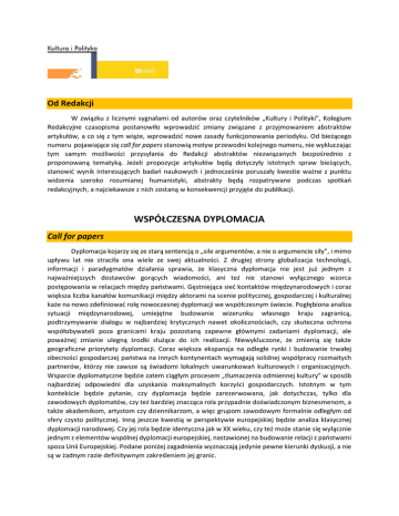 Od Redakcji W związku z licznymi sygnałami od autorów oraz czytelników „Kultury i Polityki”, Kolegium Redakcyjne czasopisma postanowiło wprowadzić zmiany związane z przyjmowaniem abstraktów artykułów, a co się z tym wiąże, wprowadzić nowe zasady funkcjonowania periodyku. Od bieżącego numeru pojawiające się call for papers stanowią motyw przewodni kolejnego numeru, nie wykluczając tym samym możliwości przysyłania do Redakcji abstraktów niezwiązanych bezpośrednio z proponowaną tematyką. Jeżeli propozycje artykułów będą dotyczyły istotnych spraw bieżących, stanowić wynik interesujących badań naukowych i jednocześnie poruszały kwestie ważne z punktu widzenia szeroko rozumianej humanistyki, abstrakty będą rozpatrywane podczas spotkań redakcyjnych, a najciekawsze z nich zostaną w konsekwencji przyjęte do publikacji. WSPÓŁCZESNA DYPLOMACJA Call for papers Dyplomacja kojarzy się ze starą sentencją o „sile argumentów, a nie o argumencie siły”, i mimo upływu lat nie straciła ona wiele ze swej aktualności. Z drugiej strony globalizacja technologii, informacji i paradygmatów działania sprawia, że klasyczna dyplomacja nie jest już jednym z najważniejszych dostawców gorących wiadomości, ani też nie stanowi wyłącznego wzorca postępowania w relacjach między państwami. Gęstniejąca sieć kontaktów międzynarodowych i coraz większa liczba kanałów komunikacji między aktorami na scenie politycznej, gospodarczej i kulturalnej każe na nowo zdefiniować rolę nowoczesnej dyplomacji we współczesnym świecie. Pogłębiona analiza sytuacji międzynarodowej, umiejętne budowanie wizerunku własnego kraju zagranicą, podtrzymywanie dialogu w najbardziej krytycznych nawet okolicznościach, czy skuteczna ochrona współobywateli poza granicami kraju pozostaną zapewne głównymi zadaniami dyplomacji, ale poważnej zmianie ulegną środki służące do ich realizacji. Niewykluczone, że zmienią się także geograficzne priorytety dyplomacji. Coraz większa ekspansja na odległe rynki i budowanie trwałej obecności gospodarczej państwa na innych kontynentach wymagają solidnej współpracy rozmaitych partnerów, którzy nie zawsze są świadomi lokalnych uwarunkowań kulturowych i organizacyjnych. Wsparcie dyplomatyczne będzie zatem ciągłym procesem „tłumaczenia odmiennej kultury” w sposób najbardziej odpowiedni dla uzyskania maksymalnych korzyści gospodarczych. Istotnym w tym kontekście będzie pytanie, czy dyplomacja będzie zarezerwowana, jak dotychczas, tylko dla zawodowych dyplomatów, czy też bardziej znacząca rola przypadnie doświadczonym biznesmenom, a także akademikom, artystom czy dziennikarzom, a więc grupom zawodowym formalnie odległym od sfery czysto politycznej. Inną jeszcze kwestią w perspektywie europejskiej będzie analiza klasycznej dyplomacji narodowej. Czy jej rola będzie identyczna jak w XX wieku, czy też może stanie się wyłącznie jednym z elementów wspólnej dyplomacji europejskiej, nastawionej na budowanie relacji z państwami spoza Unii Europejskiej. Podane poniżej zagadnienia wyznaczają jedynie pewne kierunki dyskusji, a nie są w żadnym razie definitywnym zakreśleniem jej granic. Polityka wewnętrzna i jej implikacje w polityce zagranicznej – czy istnieje kompromis w realizowaniu wspólnej polityki zagranicznej, niezależnie od koalicji sprawującej władzę w państwie? Gdzie istnieje granica takiego kompromisu? Wizerunek państwa a dyplomacja – jakie są najbardziej skuteczne metody tworzenia wizerunku kraju w różnych obszarach kulturowych? Jak jest granica tworzenia mitu politycznego na użytek zewnętrzny? Dyplomacja narodowa a dyplomacja unijna – gdzie istnieje obszar synergii, a gdzie możliwe pole konfliktów? Prawa człowieka a interes narodowy – jak znaleźć odpowiednią równowagę w wyznaczaniu priorytetów polityki zagranicznej? Czy zbyt wyraźna obrona interesów narodowych kosztem obrony praw człowieka nie zmniejsza wiarygodności państwa? Ekonomizacja polityki zagranicznej – czy to przyszły dogmat czy tylko jedna z opcji w prowadzeniu polityki państwa? Polityka tworzenia i likwidacji placówek dyplomatycznych – czy rozwijanie a nawet tylko podtrzymywanie sieci placówek dyplomatycznych w Unii Europejskiej nie jest przeżytkiem wobec mnogości kontaktów wzajemnych na wielu szczeblach? Czy nie warto kierować zasobów dyplomatycznych, wzorem Brytyjczyków, poza granicę Unii, gdzie będą bardziej potrzebne w realizacji ekspansji gospodarczej i politycznej? Geografia współczesnej dyplomacji – które rejony świata staną się głównym polem rozgrywki dyplomatycznej? Gdzie klasyczna dyplomacja ma do odegrania swoją szczególną rolę, a gdzie staje się finansowym balastem? Dyplomacja i nowoczesne technologie – jakie są rzeczywiste możliwości zastosowania najnowszych technologii w procesie realizacji zadań dyplomatycznych? Czy fenomen „Wikileaks” nie podważa istoty klasycznej dyplomacji, w której poufność przekazanej informacji jest gwarancją zaufania między partnerami? Dyplomacja wielostronna – jaka będzie jej rola w globalnym świecie? Czy jej skuteczność będzie nadal ograniczana przez partykularne interesy? Zgłoszenia tematów wraz ze streszczeniem w formacie RTF i DOC (1800 – 2000 znaków) prosimy przesyłać do dnia 15 marca 2015 r. drogą elektroniczną na adres [email protected] lub [email protected]. „Kultura i Polityka” „Kultura i Polityka” to zeszyty naukowe wydawane w trybie półrocznym przez Wyższą Szkołę Europejską im. ks. Józefa Tischnera. Celem pisma jest promowanie, a także rozpowszechnianie najnowszych idei oraz badań na polu szeroko rozumianej współczesnej humanistyki, a w szczególności badań w dziedzinie stosunków międzynarodowych, socjologii i lingwistyki. Użycie w tytule spójnika „i” jest zamierzone: chcemy wskazać na naukową doniosłość, a także subtelnoś