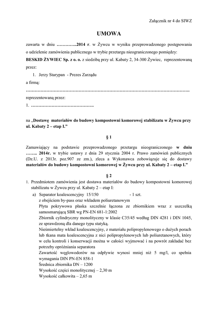Załącznik nr 4 do SIWZ UMOWA zawarta w dniu …………..2014 r. w Żywcu w wyniku przeprowadzonego postępowania o udzielenie zamówienia publicznego w trybie przetargu nieograniczonego pomiędzy: BESKID ŻYWIEC Sp. z o. o. z siedzibą przy ul. Kabaty 2, 34-300 Żywiec, reprezentowaną przez: 1. Jerzy Starypan - Prezes Zarządu a firmą: …………………………………………………………………………………………………. reprezentowaną przez: 1. ……………………………………. na „Dostawę materiałów do budowy kompostowni komorowej stabilizatu w Żywcu przy ul. Kabaty 2 – etap I.” §1 Zamawiający na podstawie przeprowadzonego przetargu nieograniczonego w dniu …….. 2014r. w trybie ustawy z dnia 29 stycznia 2004 r. Prawo zamówień publicznych (Dz.U. z 2013r. poz.907 ze zm.), zleca a Wykonawca zobowiązuje się do dostawy materiałów do budowy kompostowni komorowej w Żywcu przy ul. Kabaty 2 – etap I.” §2 1. Przedmiotem zamówienia jest dostawa materiałów do budowy kompostowni komorowej stabilizatu w Żywcu przy ul. Kabaty 2 – etap I: a) Separator koalescencyjny 15/150 - 1 szt. z obejściem by-pass oraz wkładem poliuretanowym Płyta pokrywowa płaska szczelnie łączona ze zbiornikiem wraz z uszczelką samosmarującą SBR wg PN-EN 681-1:2002 Zbiornik cylindryczny monolityczny w klasie C35/45 według DIN 4281 i DIN 1045, ze sprawdzoną dla danego typu statyką. Nieśmiertelny wkład koalescencyjny, z materiału polipropylenowego o dużych porach lub tkana mata koalescencyjna z nici polipropylenowych lub poliuretanowych, który w celu kontroli i konserwacji można w całości wyjmować i na powrót zakładać bez potrzeby opróżniania separatora Zawartość węglowodorów na odpływie wynosi mniej niż 5 mg/l, co spełnia wymagania DIN PN-EN 858-1 Średnica zbiornika DN – 1200 Wysokość części monolitycznej – 2,30 m Wysokość całkowita – 2,65 m 2 Wbudowane przez producenta, trwałe uszczelki wargowe typu Forsheda (jakość NBR- olejoodporne), pasujące do rur z tworzyw sztucznych (np. PE-HD, PP, PCV), umożliwiające przegubowe przyłącze rurowe – dostępne również inne typy przyłącza. Właz klasy D400 b) Osadnik szlamu - 1 szt. Płyta pokrywowa płaska szczelnie łączona ze zbiornikiem połączeniem śrubowym wraz z uszczelką o przekroju kołowym NBR. Zbiornik cylindryczny monolityczny w klasie C35/45 według DIN 4281 i DIN 1045, ze sprawdzoną dla danego typu statyką. Średnica zbiornika DN – 2500 Wysokość części monolitycznej – 3,0 m Wysokość całkowita – 3,75 m Wbudowane przez producenta, trwałe uszczelki wargowe typu Forsheda (jakość NBR - olejoodporne), pasujące do rur z tworzyw sztucznych (np. PE-HD, PP, PCV), umożliwiające przegubowe przyłącze rurowe – dostępne również inne typy przyłącza. Właz klasy D400 c) Zbiornik wody technologicznej - 1 szt. Płyta pokrywowa płaska szczelnie łączona ze zbiornikiem połączeniem śrubowym wraz z uszczelką o przekroju kołowym NBR. Zbiornik cylindryczny monolityczny w klasie C35/45 według DIN 4281 i DIN 1045, ze sprawdzoną dla danego typu statyką Średnica zbiornika DN – 2500 Wysokość części monolitycznej – 3,0 m Wysokość całkowita – 3,75 m Wbudowane przez producenta, trwałe uszczelki wargowe typu Forsheda (jakość NBR- olejoodporne), pasujące do rur z tworzyw sztucznych (np. PE-HD, PP, PCV), umożliwiające przegubowe przyłącze rurowe – dostępne również inne typy przyłącza. Właz klasy D400 d) Separator koalescencyjny - 1 szt. Płyta pokrywowa płaska szczelnie łączona ze zbiornikiem wraz z uszczelką samosmarującą SBR wg PN-EN 681-1:2002. Zbiornik cylindryczny monolityczny w klasie C35/45 według DIN 4281 i DIN 1045, ze sprawdzoną dla danego typu statyką. Nieśmiertelny wkład koalescencyjny, z materiału polipropylenowego o dużych porach lub tkana mata koalescencyjna z nici polipropylenowych lub poliuretanowych, który w celu kontroli i konserwacji można w całości wyjmować i na powrót zakładać bez potrzeby opróżniania separatora. Zawartość węglowodorów na odpływie wynosi mniej niż 5 mg/l, co spełnia wymagania DIN PN-EN 858-1 Średnica zbiornika DN – 1200 Wysokość części monolitycznej – 2,86 m Wysokość całkowita – 3,0 m 3 Wbudowane przez producenta, trwałe uszczelki wargowe typu Forsheda (jakość NBR - olejoodporne), pasujące do rur z tworzyw sztucznych (np. PE-HD, PP, PCV), umożliwiające przegubowe przyłącze rurowe – dostępne również inne typy przyłącza. Właz klasy D400 e) Studzienki betonowe monolityczne DN 1000 - 5 szt. Płyta pokrywowa płaska szczelnie łączona ze zbiornikiem wraz z uszczelką samosmarującą SBR wg PN-EN 681-1:2002 Zgodnie z normą PN-EN 1917:2004 Zbiornik cylindryczny monolityczny w klasie C40/50 według DIN 4281 i DIN 1045, ze sprawdzoną dla danego typu statyką. Wbudowane przez producenta, trwałe uszczelki wargowe typu Forsheda (jakość NBR - olejoodporne), pasujące do rur z tworzyw sztucznych (np. PE-HD, PP, PCV), umożliwiające przegubowe przyłącze rurowe – dostępne również inne typy przyłącza. f) Obudowa Pompowni DN 1000 - 1 szt. Płyta pokrywowa płaska szczelnie łączona ze zbiornikiem wraz z uszczelką samosmarującą SBR wg PN-EN 681-1:2002 Zgodnie z normą PN-EN 1917:2004 Zbiornik cylindryczny monolityczny w klasie C40/50 według DIN 4281 i DIN 1045, ze sprawdzoną dla danego typu statyką. Średnica zbiornika DN – 1000 Wysokość części monolitycznej – 1,60 m Wysokość całkowita – 2,86 m Wbudowane przez producenta, trwałe uszczelki wargowe typu Forsheda (jakość NBR - olejoodporne), pasujące do rur z tworzyw sztucznych (np. PE-HD, PP, PCV), umożliwiające przegubowe przyłącze rurowe – dostępne również inne typy przyłącza. g) Pompa z wyposażeniem NURT 40 PZM 1,9/ZP, P=1,90 kW z wirnikiem zamkniętym – 1 szt. h) Właz żeliwny lekki DN 600. Typ BEGU przygotowany do wmurowan