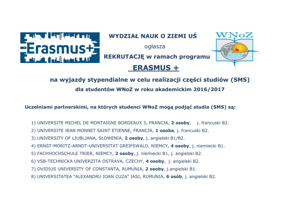 WYDZIAŁ NAUK O ZIEMI UŚ ogłasza R REKRUTACJĘ w ramach programu ERASMUS + na wyjazdy stypendialne w celu realizacji części studiów (SMS) dla studentów WNoZ w roku akademickim 2016/2017 Uczelniami partnerskimi, na których studenci WNoZ mogą podjąć studia (SMS) są: 1) UNIVERSITE MICHEL DE MONTAIGNE BORDEAUX 3, FRANCJA, 2 osoby, j. francuski B2. 2) UNIVERSITE JEAN MONNET SAINT ETIENNE, FRANCJA, 1 osoba, j. francuski B2. 3) UNIVERSITY OF LJUBLJANA, SŁOWENIA, 2 osoby, j. angielski B1/B2. 4) ERNST-MORITZ-ARNDT-UNIVERSITAT GREIFSWALD, NIEMCY, 4 osoby, j. niemiecki B1. 5) FACHHOCHSCHULE TRIER, NIEMCY, 2 osoby, j. niemiecki B1, j. angielski B2. 6) VSB-TECHNICKA UNIVERZITA OSTRAVA, CZECHY, 4 osoby, j. angielski B2. 7) OVIDIUS UNIVERSITY OF CONSTANTA, RUMUNIA, 2 osoby, j.angielski B1. 8) UNIVERSITATEA "ALEXANDRU IOAN CUZA" IASI, RUMUNIA, 6 osób, j. angielski B2. 9) DOKUZ EYLUL UNIVERSITY, TURCJA, 2 osoby, j angielski B2. 10) PANEPISTIMIO PATRON (PATRAS), GRECJA, 2 osoby, j. angielski B2. 11) COMENIUS UNIVERSITY IN BRATISLAVA, SŁOWACJA, 1 osoba, j.angielski B2. 12) UNIVERSITY OF OSTRAVA, CZECHY, 2 osoby, j. angielski B2. Kryteria kwalifikacji kandydatów: - wyniki w nauce; znajomość języka obcego; rozmowa kwalifikacyjna, podczas której kandydat przedstawia swoje zainteresowania naukowe oraz motywację do odbycia studiów zagranicznych. Wymagane dokumenty (w języku polskim): Kandydat powinien wypełnić obowiązujący w Uniwersytecie Śląskim formularz aplikacyjny (dotyczący wyjazdu stypendialnego na studia (SMS) w roku akademickim 2015/2016), który jest dostępny na stronie internetowej: www.erasmus.us.edu.pl. Formularz należy wypełnić elektronicznie i odesłać klikając przycisk "WYŚLIJ", a następnie wydrukować i podpisać. Do formularza należy dołączyć: zaświadczenie z wyliczoną średnią z dotychczasowego przebiegu studiów potwierdzoną przez Dziekanat. opinię obecnego promotora pracy dyplomowej czy magisterskiej. informacje dotyczące znajomości języków obcych (egzamin maturalny, ocena – lektorat j. obcego, certyfikaty, zaświadczenie o ukończeniu kursów i inne). Sposób opisu teczki: IMIĘ I NAZWISKO, rok studiów i tryb, adres e-mail, numer telefonu komórkowego, WYJAZD w celu realizacji części studiów (SMS) 2016-2017 Zgłoszenia kandydatów w terminie od 8.04.2016 do 18.04.2016 przyjmuje oraz bliższych informacji udziela Koordynator Programu na WNoZ - dr hab. Jolanta Burda (pok. 1623; [email protected]). Szczegółowe informacje dotyczące programu znajdują się na stronach www.erasmus.us.edu.pl i www.krsg.us.edu.pl/ceepus. Rozmowa kwalifikacyjna Kandydatów z Wydziałową Komisją Rekrutacyjną odbędzie się 20 kwietnia 2016, godz. 9:00 w sali 1617. Rekrutacji Kandydatów dokona Komisja Rekrutacyjna w składzie: dr hab. Jolanta Burda – Koordynator Programu Erasmus+ na WNoZ dr hab. Irina Gałuskina – Członek Komisji dr Beata Woskowicz-Ślęzak – Członek Komisji Wyniki rekrutacji zostaną ogłoszone 21 kwietnia 2016 r. Lista studentów zakwalifikowanych do wyjazdu zostanie wywieszona po obradach Komisji na tablicy ogłoszeń WNoZ (obok Dziekanatu), a następnie przekazana wraz z protokołem posiedzenia Komisji Rekrutacyjnej do Biura Erasmus+ Uniwersytetu Śląskiego. Uwaga: zakwalifikowanie kandydata do wyjazdu nie jest równoznaczne z gwarancją wyjazdu! Liczba miejsc wyjazdowych przyznawana jest na szczeblu centralnym Uczelni. Koordynator Programu Erasmus+ na WNoZ dr hab. Jolanta Burda [email protected]