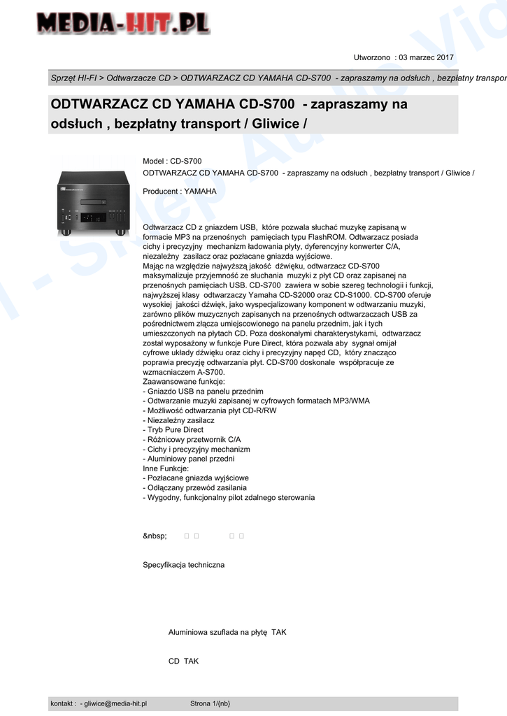 o i d d i V Utworzono : 03 marzec 2017 Sprzęt HI-FI > Odtwarzacze CD > ODTWARZACZ CD YAMAHA CD-S700 - zapraszamy na odsłuch , bezpłatny transpor ODTWARZACZ CD YAMAHA CD-S700 - zapraszamy na odsłuch , bezpłatny transport / Gliwice / p le Model : CD-S700 u A ODTWARZACZ CD YAMAHA CD-S700 - zapraszamy na odsłuch , bezpłatny transport / Gliwice / Producent : YAMAHA l p k S Odtwarzacz CD z gniazdem USB, które pozwala słuchać muzykę zapisaną w formacie MP3 na przenośnych pamięciach typu FlashROM. Odtwarzacz posiada cichy i precyzyjny mechanizm ładowania płyty, dyferencyjny konwerter C/A, niezależny zasilacz oraz pozłacane gniazda wyjściowe. Mając na względzie najwyższą jakość dźwięku, odtwarzacz CD-S700 maksymalizuje przyjemność ze słuchania muzyki z płyt CD oraz zapisanej na przenośnych pamięciach USB. CD-S700 zawiera w sobie szereg technologii i funkcji, najwyższej klasy odtwarzaczy Yamaha CD-S2000 oraz CD-S1000. CD-S700 oferuje wysokiej jakości dźwięk, jako wyspecjalizowany komponent w odtwarzaniu muzyki, zarówno plików muzycznych zapisanych na przenośnych odtwarzaczach USB za pośrednictwem złącza umiejscowionego na panelu przednim, jak i tych umieszczonych na płytach CD. Poza doskonałymi charakterystykami, odtwarzacz został wyposażony w funkcje Pure Direct, która pozwala aby sygnał omijał cyfrowe układy dźwięku oraz cichy i precyzyjny napęd CD, który znacząco poprawia precyzję odtwarzania płyt. CD-S700 doskonale współpracuje ze wzmacniaczem A-S700. Zaawansowane funkcje: - Gniazdo USB na panelu przednim - Odtwarzanie muzyki zapisanej w cyfrowych formatach MP3/WMA - Możliwość odtwarzania płyt CD-R/RW - Niezależny zasilacz - Tryb Pure Direct - Różnicowy przetwornik C/A - Cichy i precyzyjny mechanizm - Aluminiowy panel przedni Inne Funkcje: - Pozłacane gniazda wyjściowe - Odłączany przewód zasilania - Wygodny, funkcjonalny pilot zdalnego sterowania Specyfikacja techniczna Aluminiowa szuflada na płytę TAK CD TAK kontakt : - [email protected] Strona 1/{nb} o i d d i V Utworzono : 03 marzec 2017 Sprzęt HI-FI > Odtwarzacze CD > ODTWARZACZ CD YAMAHA CD-S700 - zapraszamy na odsłuch , bezpłatny transpor ODTWARZACZ CD YAMAHA CD-S700 - zapraszamy na odsłuch , bezpłatny transport / Gliwice / l p k S p le CD-R TAK u A CD-RW TAK Gniazdo USB TAK Liczba płyt w szufladzie 1 MP3 TAK Pasmo przenoszenia 2 Hz - 50 000 Hz Pobór mocy 16 W Pobór mocy w stanie gotowości 0 W Stosunek sygnału do szumu 110 dB Waga w kg 6,2 Windows WMA TAK Wyjście analogowe cinch TAK Wyjście cyfrowe koaksjalne TAK kontakt : - [email protected] Strona 2/{nb} o i d d i V Utworzono : 03 marzec 2017 Sprzęt HI-FI > Odtwarzacze CD > ODTWARZACZ CD YAMAHA CD-S700 - zapraszamy na odsłuch , bezpłatny transpor ODTWARZACZ CD YAMAHA CD-S700 - zapraszamy na odsłuch , bezpłatny transport / Gliwice / p le u A Wyjście cyfrowe optyczne TAK l p k S Wymiary w mm (Sz x W x G) 435 x 96 x 300 Zakres dynamiki 100 dB Cena : 1.999,00 zł Brutto ( 1.625,20 zł Netto) Dostępność: Produkt dostępny w naszym sklepie od 21 wrzesień 2011 kontakt : - [email protected] Strona 3/{nb}