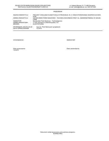 EELBO PIOTR MARKOWSKI BIURO PROJEKTOWE INSTALACJI ELEKTROENERGETYCZNYCH ul. Księcia Borysa 13, 71-480 Szczecin, e-mail: [email protected], tel. 602-337-640 PRZEDMIAR NAZWA INWESTYCJI : ADRES INWESTYCJI : INWESTOR ADRES INWESTORA BRANŻA : : : PROJEKT ZASILANIA KLIMATYZACJI ATRIUM BUD. B I C ORAZ STEROWANIA OKAPEM KUCHENNYM SZCZECIŃSKI PARK NAUKOWO - TECHNOLOGICZNEGO PRZY UL. NIEMIERZYŃSKIEJ W SZCZECINIE Szczeciński Park Naukowo - Technologiczny 71-441 Szczecin ul.Niemierzyńska 17a ELEKTRYCZNA SPORZĄDZIŁ KALKULACJE : DATA OPRACOWANIA : mgr inż. Piotr Markowski (projektant) 12.2015 WYKONAWCA : INWESTOR : Data opracowania 12.2015 Data zatwierdzenia Dokument został opracowany przy pomocy programu NORMA PRO OGÓLNA CHARAKTERYSTYKA OBIEKTU 1. Zakres prac Zakres niniejszego opracowania obejmuje: wyprowadzenie przycisku sterowania wentylatorem W14 zainstalowanym na dachu bud. C do pomieszczenia kuchni, Uzgodniono z użytkownikiem iż przycisk należy zamontować na okapie w pobliżu przycisku włączenia oświetlenia okapu. W tym celu należy zainstalować włącznik jednobiegunowy n/t 230V/16A oraz ułożyć przewód YDY3x2.5mm o łącznej długości 45m. Przewód należy ułożyć na istniejących korytach kablowych. Przycisk należy podłączyć pod cewkę stycznika zgodnie z załączonym schematem. Zasilanie jednostki zewnętrznej klimatyzacji oraz klimatyzatorów kanałowych zgodnie z PT branży sanitarnej, dla pomieszczenia atrium bud. B. Szczegóły zgodnie z załączonym schematem i rzutem. Przewody zasilające należy układać na istniejących korytach kablowych podejścia wykonać w rurach ochronnych typu BE odpornych na UV. PW celu ochrony projektowanej jednostki klimatyzacji należy postawić maszt instalacji odgromowej o wysokości H-4m, na stopie betonowej. Zasilanie jednostek należy wykonać z istniejącej rozdzielnicy RKL-B zgodnie z załączonym schematem. Zasilanie jednostki zewnętrznej klimatyzacji oraz klimatyzatorów kanałowych zgodnie z PT branży sanitarnej, dla pomieszczenia atrium bud. C. Szczegóły zgodnie z załączonym schematem i rzutem. Przewody zasilające należy układać na istniejących korytach kablowych podejścia wykonać w rurach ochronnych typu BE odpornych na UV. Zasilanie jednostek należy wykonać z istniejącej rozdzielnicy RKLC zgodnie z załączonym schematem. 2. Ochrona od porażeń prądem elektrycznym Z punktu widzenia ochrony przeciwporażeniowej sieć odbiorcza będzie pracować w układzie TN-S z osobnymi przewodami ochronnymi PE i przewodem neutralnymi N. Rozdział przewodu PEN na przewód PE i N w rozdzielnicy głównej budynku RG, punkt rozdziału należy uziemić. Dla wszystkich tablic rozdzielczych projektuje się system prądu przemiennego 5-przewodowy (L1,L2,L3, N i PE). Jako środek ochrony dodatkowej przed dotykiem zastosowano szybkie samoczynne wyłączenie zasilania. Dodatkowo w obwodach gniazd zastosowano wyłączniki przeciwporażeniowe różnicowoprądowe o znamionowym prądzie różnicowym 0,03A. 3. Przejścia pożarowe Przejścia przez strefy pożarowe kabli, przewodów, koryt kablowych, przewodów w rurach palnych jak i niepalnych wykonać przy użyciu produktów np. prod. Hitli, które spełniają wymagane kryteria szczelności i izolacyjności ogniowej. Przy montażu ściśle przestrzegać wymagań aprobaty technicznej i instrukcji producenta w celu zachowania odporności ogniowej podanej przez producenta danego wyrobu. 4. Wytyczne i uzgodnienia międzybranżowe Otworowanie i lokalizacją urządzeń i osprzętu elektrycznego uzgodniona z branżowymi projektami wykonawczymi Wytyczono trasy główne kablowe na obiekcie Przewidziano otwory montażowe dla rozdzielnic piętrowych, uzgodniono lokalizację i wielkość z branżą architektoniczną i konstrukcyjną. 5. Obliczenia techniczne Spadki napięć na instalacjach wewnętrznych zgodnie z normą. Czasy wyłączenia prądów zwarciowych dla przyjęte średnic przewodów zachowane. Urządzenia dobrane na prądy zwarciowe. 6. Uwagi końcowe całość instalacji wykonać zgodnie z obowiązującymi normami i przepisami z zachowaniem przepisów BHP. instalacje elektryczne układać po wykonaniu głównych robót budowlany zamiennych. wykonać pomiar rezystancji uziemienia po wykonaniu instalacji dokonać niezbędnych pomiarów, dla każdego punktu zasilania (np. punktów oświetlenia, gniazd, wypustów zasilania) osobno: Pomiar impedancji pętli zwarcia Sprawdzenie ciągłości przewodów Pomiar rezystancji izolacji przewodów Badanie wyłączników różnicowo-prądowych Pomiar natężenia oświetlenia podstawowego i awaryjnego spadki napięcia oraz prądy zwarciowe zgodnie z normą -2- Norma PRO Wersja 4.46 Nr seryjny: 32504 PRZEDMIAR Lp. Podstawa Opis i wyliczenia 1 INSTALACJE ELEKTRYCZNE 1 KNNR 5 Rury winidurowe o śr.do 20 mm układane n.t. na podłożu innym niż beton d.1 0103-05 STE1_WEW 60 2 KNNR 5 Przewody kabelkowe o łącznym przekroju żył do 7.5 mm2 - Przewód YDYd.1 0205-01 ST- 450/750 V 3x2,5mm2 E1_WEW 45 j.m. m m 5 KNNR 5 Przewody izolowane jednożyłowe o przekroju do 120 mm2 wciągane do kana- m d.1 0201-10 łów zamkniętych - YKY 0,6/1kV 3x1,5mm2 uwaga p.tablicą 129 m 8 KNNR 5 d.1 0404-04 9 KNNR 5 d.1 0404-04 2 10 KNNR 5 d.2 0601-02 11 KNNR 5 d.2 0615-06 Montaż przycisku jednobiegunowego 1P 230V/16A szt. 1 szt. Doposażenie rozdzielnicy RW-C zgodnie ze schematem szt. 1 szt. Doposażenie rozdzielnicy RKL-C zgodnie ze schematem szt. 1 szt. Doposażenie rozdzielnicy RKL-B zgodnie ze schematem szt. 1 szt. INSTALACJA ODGROMOWA I WYRÓWNAWCZA Przewody instalacji odgromowej nienaprężane poziome mocowane na wspor- m nikach 10 m Maszt odgromowy h=4m kpl. 1 kpl. 3 POMIARY 12 KNNR 5 Badania i pomiary instalacji uziemiającej (pierwszy pomiar) d.3 1304-01 STE1_WEW 1 szt. szt. 14 KNNR 5 Sprawdzenie samoczynnego wyłączania zasilania (pierwsza próba) d.3 1305-01 STE1_WEW 1 prób. 15 KNNR 5 Sprawdzenie samoczynnego wyłączania zasilania (następna próba)