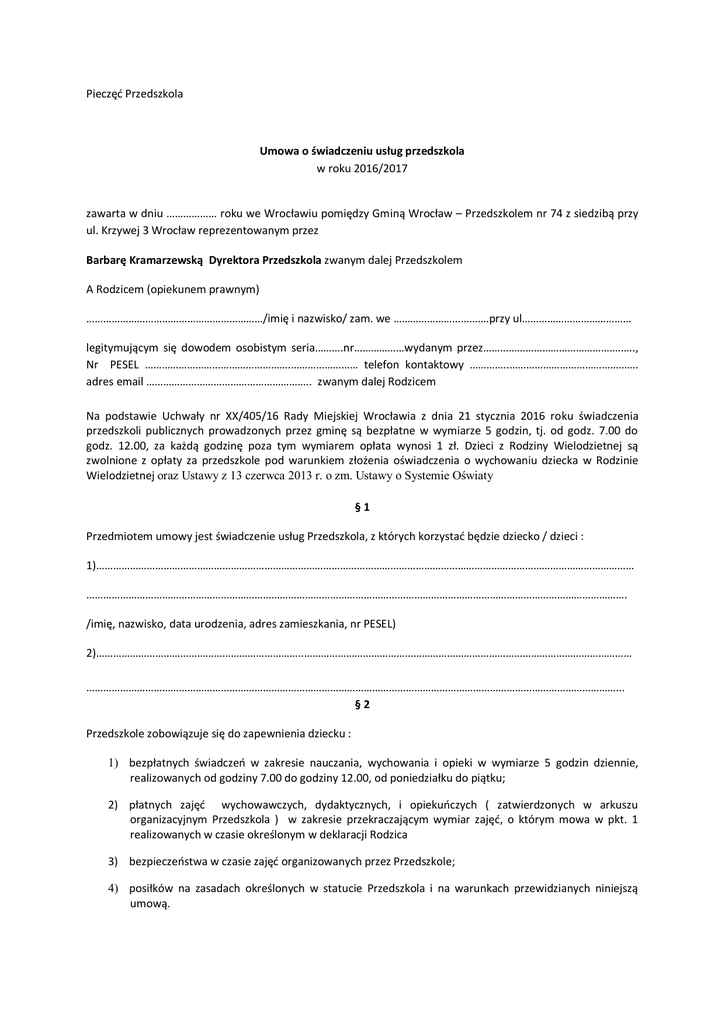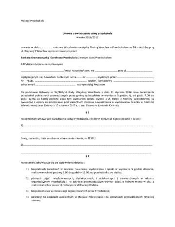 Pieczęć Przedszkola Umowa o świadczeniu usług przedszkola w roku 2016/2017 zawarta w dniu ……………… roku we Wrocławiu pomiędzy Gminą Wrocław – Przedszkolem nr 74 z siedzibą przy ul. Krzywej 3 Wrocław reprezentowanym przez Barbarę Kramarzewską Dyrektora Przedszkola zwanym dalej Przedszkolem A Rodzicem (opiekunem prawnym) ………………………………………………………/imię i nazwisko/ zam. we …………………………….przy ul………………………………… legitymującym się dowodem osobistym seria……….nr………………wydanym przez………………………………………….….., Nr PESEL …………………………………………….…………………… telefon kontaktowy …………..………………………………………. adres email ………………………………………………….. zwanym dalej Rodzicem Na podstawie Uchwały nr XX/405/16 Rady Miejskiej Wrocławia z dnia 21 stycznia 2016 roku świadczenia przedszkoli publicznych prowadzonych przez gminę są bezpłatne w wymiarze 5 godzin, tj. od godz. 7.00 do godz. 12.00, za każdą godzinę poza tym wymiarem opłata wynosi 1 zł. Dzieci z Rodziny Wielodzietnej są zwolnione z opłaty za przedszkole pod warunkiem złożenia oświadczenia o wychowaniu dziecka w Rodzinie Wielodzietnej oraz Ustawy z 13 czerwca 2013 r. o zm. Ustawy o Systemie Oświaty §1 Przedmiotem umowy jest świadczenie usług Przedszkola, z których korzystać będzie dziecko / dzieci : 1)………………………………………………………………………………………………………………………………………………………………………… …………………………………………………………………………………………………………………………………………………………………………. /imię, nazwisko, data urodzenia, adres zamieszkania, nr PESEL) 2)………………………………………………………………..……………………………………………………………………………………………………… ………………………………………………………………………………………………………………………………………………………………………... §2 Przedszkole zobowiązuje się do zapewnienia dziecku : 1) bezpłatnych świadczeń w zakresie nauczania, wychowania i opieki w wymiarze 5 godzin dziennie, realizowanych od godziny 7.00 do godziny 12.00, od poniedziałku do piątku; 2) płatnych zajęć wychowawczych, dydaktycznych, i opiekuńczych ( zatwierdzonych w arkuszu organizacyjnym Przedszkola ) w zakresie przekraczającym wymiar zajęć, o którym mowa w pkt. 1 realizowanych w czasie określonym w deklaracji Rodzica 3) bezpieczeństwa w czasie zajęć organizowanych przez Przedszkole; 4) posiłków na zasadach określonych w statucie Przedszkola i na warunkach przewidzianych niniejszą umową. §3 Rodzic oświadcza, że dziecko będzie przebywało w Przedszkolu w godzinach od …………. do ……………. §4 1. Dziecko korzystać będzie z : trzech posiłków (śniadanie, obiad, podwieczorek). 2. Rodzaj i godziny wydawania posiłków określa statut Przedszkola oraz zasady korzystania ze stołówki Przedszkola. §5 Rodzic zobowiązuje się do: 1) zapoznania się z treścią statutu Przedszkola i przestrzegania jego postanowień, 2) współpracy z Przedszkolem w szczególności w zakresie spraw związanych z przebiegiem procesu wychowawczo-dydaktycznego, którego uczestnikiem jest jego dziecko, 3) przyprowadzania do Przedszkola zdrowego dziecka i niezwłocznego powiadomienia w przypadku choroby zakaźnej. 4) powiadomienia Przedszkola o terminie nieobecności dziecka, nie później niż w drugim dniu nieobecności, 5) wniesienia pisemnego usprawiedliwienia w terminie 7 dni, po zakończeniu nieobecności dziecka powyżej 30 dni kalendarzowych, spowodowanych sytuacją zdrowotną, 6) terminowego wnoszenia opłat z tytułu korzystania przez dziecko ze świadczeń Przedszkola, 7) przyprowadzania i terminowego odbierania dziecka z Przedszkola przez Rodziców lub przez osobę wskazaną przez nich w pisemnym upoważnieniu, wystawionym w obecności dyrektora lub nauczyciela Przedszkola. §6 1. Rodzic zobowiązuje się wnosić na rzecz Przedszkola, z tytułu świadczonych usług opłatę miesięczną składającą się z: 1) odpłatności pokrywającej koszty surowców zużytych do przygotowania posiłków w kwocie 7zł (słownie- siedem zł) za każdy dzień pobytu dziecka w przedszkolu 2) odpłatności za świadczenia wymienione § 2 pkt 2 oraz w zadeklarowanym czasie w & 3 niniejszej umowy w kwocie 1 zł (słownie: jeden złotych) za każdą godzinę ponad wymiar zajęć, o którym mowa w &2 pkt. 1 2. Łączna opłata miesięczna do wniesienia której zobowiązany jest Rodzic, stanowi iloczyn dni roboczych przypadających w danym miesiącu i odpłatności wynikającej z sumy należności, o których mowa w ust. 1. 3. Opłatę za świadczenia wymienione § 2 pkt 2 ustala się za czas zadeklarowany przez rodzica w § 3 niniejszej umowy. §7 1. Rodzic zobowiązuje się do wniesienia opłaty miesięcznej, o której mowa w § 6 ust. 2 do 15 –go dnia każdego miesiąca, z góry, przelewem na rachunek bankowy nr 91 1020 5226 0000 6602 0417 0601 lub w Kasie ZOJM-u Wrocław ul. Namysłowska 8. 2. Termin płatności oznacza dzień wpływu należności na ww. rachunek bankowy lub wpłaty do kasy . 3. W razie nieobecności dziecka w Przedszkolu, opłata miesięczna ulega proporcjonalnemu obniżeniu, odpowiednio do liczby dni nieobecności. Rozliczenie następuje poprzez obniżenie opłaty w kolejnym miesiącu. 4. Po zakończeniu umowy o świadczeniu usług przedszkola, ewentualną nadpłatę Przedszkole przekaże na podany rachunek bankowy Rodzica: …………………………………………………………