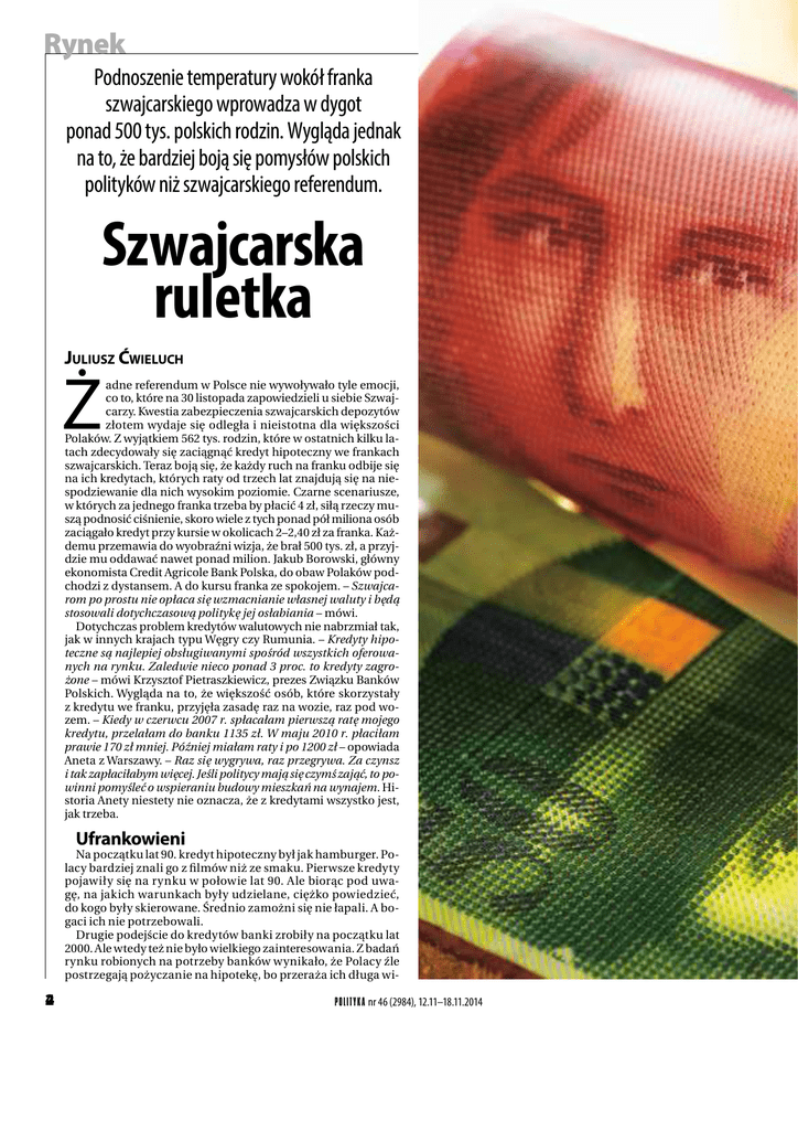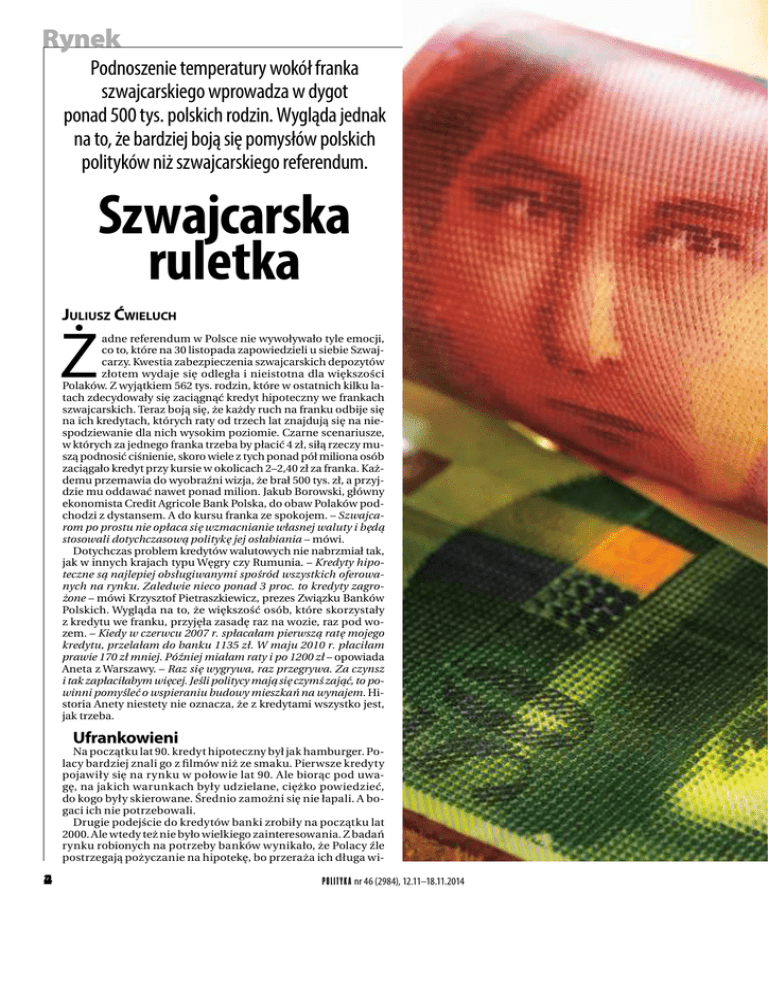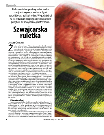 Rynek Podnoszenie temperatury wokół franka szwajcarskiego wprowadza w dygot ponad 500 tys. polskich rodzin. Wygląda jednak na to, że bardziej boją się pomysłów polskich polityków niż szwajcarskiego referendum. Szwajcarska ruletka JULIUSZ ĆWIELUCH Ż adne referendum w Polsce nie wywoływało tyle emocji, co to, które na 30 listopada zapowiedzieli u siebie Szwajcarzy. Kwestia zabezpieczenia szwajcarskich depozytów złotem wydaje się odległa i nieistotna dla większości Polaków. Z wyjątkiem 562 tys. rodzin, które w ostatnich kilku latach zdecydowały się zaciągnąć kredyt hipoteczny we frankach szwajcarskich. Teraz boją się, że każdy ruch na franku odbije się na ich kredytach, których raty od trzech lat znajdują się na niespodziewanie dla nich wysokim poziomie. Czarne scenariusze, w których za jednego franka trzeba by płacić 4 zł, siłą rzeczy muszą podnosić ciśnienie, skoro wiele z tych ponad pół miliona osób zaciągało kredyt przy kursie w okolicach 2–2,40 zł za franka. Każdemu przemawia do wyobraźni wizja, że brał 500 tys. zł, a przyjdzie mu oddawać nawet ponad milion. Jakub Borowski, główny ekonomista Credit Agricole Bank Polska, do obaw Polaków podchodzi z dystansem. A do kursu franka ze spokojem. – Szwajcarom po prostu nie opłaca się wzmacnianie własnej waluty i będą stosowali dotychczasową politykę jej osłabiania – mówi. Dotychczas problem kredytów walutowych nie nabrzmiał tak, jak w innych krajach typu Węgry czy Rumunia. – Kredyty hipoteczne są najlepiej obsługiwanymi spośród wszystkich oferowanych na rynku. Zaledwie nieco ponad 3 proc. to kredyty zagrożone – mówi Krzysztof Pietraszkiewicz, prezes Związku Banków Polskich. Wygląda na to, że większość osób, które skorzystały z kredytu we franku, przyjęła zasadę raz na wozie, raz pod wozem. – Kiedy w czerwcu 2007 r. spłacałam pierwszą ratę mojego kredytu, przelałam do banku 1135 zł. W maju 2010 r. płaciłam prawie 170 zł mniej. Później miałam raty i po 1200 zł – opowiada Aneta z Warszawy. – Raz się wygrywa, raz przegrywa. Za czynsz i tak zapłaciłabym więcej. Jeśli politycy mają się czymś zająć, to powinni pomyśleć o wspieraniu budowy mieszkań na wynajem. Historia Anety niestety nie oznacza, że z kredytami wszystko jest, jak trzeba. Ufrankowieni Na początku lat 90. kredyt hipoteczny był jak hamburger. Polacy bardziej znali go z filmów niż ze smaku. Pierwsze kredyty pojawiły się na rynku w połowie lat 90. Ale biorąc pod uwagę, na jakich warunkach były udzielane, ciężko powiedzieć, do kogo były skierowane. Średnio zamożni się nie łapali. A bogaci ich nie potrzebowali. Drugie podejście do kredytów banki zrobiły na początku lat 2000. Ale wtedy też nie było wielkiego zainteresowania. Z badań rynku robionych na potrzeby banków wynikało, że Polacy źle postrzegają pożyczanie na hipotekę, bo przeraża ich długa wi- 2 4 P OLI T Y K A nr 46 (2984), 12.11–18.11.2014 zja spłaty kredytu i mają wrażenie, że to nie jest na ich kieszeń. – Z tym pierwszym nic nie dało się zrobić. Ale z drugim poszło łatwiej. Wystarczyło przekonać ludzi, że tak ciężko pracują, że musi ich być stać na mieszkanie. I to chwyciło – opowiada Marek, który uważa się za jednego z ojców tego marketingowego sukcesu, ale niekoniecznie chciałby się tym chwalić pod nazwiskiem. Złotówka była jednak słabą walutą do rozkręcania kredytowego boomu, bo Narodowy Bank Polski trzymał wysokie stopy. – Biorąc kredyt we franku szwajcarskim i odpowiednio negocjując, można było dostać oprocentowanie na poziomie około jednego procenta. Ten sam kredyt w złotych oprocentowany był na poziomie około 5 proc. – mówi Bolesław Meluch ze Związku Banków Polskich. Moda na franka szwajcarskiego zaczęła się na krótko przed wejściem Polski do Unii Europejskiej, kiedy Polacy masowo rzucili się na zakupy mieszkań. – Ludziom żyło się coraz lepiej. Chcieli mieć własne mieszkania. Bez pomocy banków byłoby to niemożliwe – dodaje prezes Pietraszkiewicz. Frank niósł w sobie obietnicę stabilności. Bankowcy powtarzali to jak mantrę, nawet wtedy, kiedy jego kurs leciał na łeb, na szyję. Ale mało kto podnosił ten argument, że skoro mocno spada, to może również mocno iść w górę. Zaletą franka było również niskie oprocentowanie. W zasadzie słuchając doradców finansowych, trudno było wskazać jakieś wady tej waluty. Banki dosyć szybko podzieliły się na te frankowe i niefrankowe. W efekcie ten sam klient w jednym banku mógł zaciągać kredyt wart nawet 500 tys. zł, a w innym ledwo łapał się na 250 tys. Rynek bardzo mocno „poszerzali” pośrednicy w udzielaniu kredytów, którzy dostawali prowizję od wielkości przyznanego kredytu. W czasie obliczania zdolności kredytowej dochodziło do prawdziwych cudów. Ludziom znikały samochody (nie ma samochodu, nie ma kosztów utrzymania), apetyty (przecież dwie osoby spokojnie wyżyją za 600 zł), a nawet małżeństwa (długi męża niepotrzebnie państwa obciążają, przecież nikt nie będzie sprawdzał, kto mieszka w lokalu). Ludzie, którzy jeszcze dwa lata wcześniej z trudem dostawali 20 tys. zł kredytu, nagle mieli zdolność na poziomie 520 tys. zł. – To było jak amok. Wszyscy na rynku zaczęli się ścigać, kto da więcej – wspomina Mariusz, który zatrudniony był jako pośrednik w udzielaniu kredytów. © GETTY Urządzeni do końca życia Portfel kredytów we franku szwajcarskim rósł tak szybko, że już w marcu 2006 Komisja Nadzoru Bankowego (dziś to Komisja Nadzoru Finansowego) rekomendowała bankom w pierwszej kolejności udzielanie kredytów w złotych. A klient przed zawarciem umowy zobowiązywany był do podpisania oświadczenia, że ma świadomość ryzyka zaciągania kredytu w walucie obcej. – Moja umowa kredytowa miała 25 stron tekstu głównego i 17 stron załączników. Pamięta