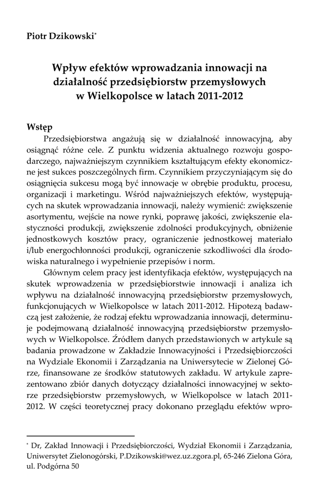 Piotr Dzikowski* Wpływ efektów wprowadzania innowacji na działalność przedsiębiorstw przemysłowych w Wielkopolsce w latach 2011-2012 Wstęp Przedsiębiorstwa angażują się w działalność innowacyjną, aby osiągnąć różne cele. Z punktu widzenia aktualnego rozwoju gospodarczego, najważniejszym czynnikiem kształtującym efekty ekonomiczne jest sukces poszczególnych firm. Czynnikiem przyczyniającym się do osiągnięcia sukcesu mogą być innowacje w obrębie produktu, procesu, organizacji i marketingu. Wśród najważniejszych efektów, występujących na skutek wprowadzania innowacji, należy wymienić: zwiększenie asortymentu, wejście na nowe rynki, poprawę jakości, zwiększenie elastyczności produkcji, zwiększenie zdolności produkcyjnych, obniżenie jednostkowych kosztów pracy, ograniczenie jednostkowej materiało i/lub energochłonności produkcji, ograniczenie szkodliwości dla środowiska naturalnego i wypełnienie przepisów i norm. Głównym celem pracy jest identyfikacja efektów, występujących na skutek wprowadzenia w przedsiębiorstwie innowacji i analiza ich wpływu na działalność innowacyjną przedsiębiorstw przemysłowych, funkcjonujących w Wielkopolsce w latach 2011-2012. Hipotezą badawczą jest założenie, że rodzaj efektu wprowadzania innowacji, determinuje podejmowaną działalność innowacyjną przedsiębiorstw przemysłowych w Wielkopolsce. Źródłem danych przedstawionych w artykule są badania prowadzone w Zakładzie Innowacyjności i Przedsiębiorczości na Wydziale Ekonomii i Zarządzania na Uniwersytecie w Zielonej Górze, finansowane ze środków statutowych zakładu. W artykule zaprezentowano zbiór danych dotyczący działalności innowacyjnej w sektorze przedsiębiorstw przemysłowych, w Wielkopolsce w latach 20112012. W części teoretycznej pracy dokonano przeglądu efektów wpro- Dr, Zakład Innowacji i Przedsiębiorczości, Wydział Ekonomii i Zarządzania, Uniwersytet Zielonogórski, [email protected], 65-246 Zielona Góra, ul. Podgórna 50 * 160 Piotr Dzikowski wadzania innowacji oraz podstawowych zagadnień związanych z innowacją i działalnością innowacyjną przedsiębiorstw. 1. Działalność innowacyjna przedsiębiorstwa Zgodnie z założeniami tradycyjnej teorii innowacji, proces innowacyjny ma charakter liniowy. Nieliniowość i systemowość innowacji zostały uwypuklone przez szkołę ewolucyjną i neoshumpeterowską, w której proces innowacyjny na poziomie przedsiębiorstwa jest postrzegany, jako układ wzajemnie powiązanych aktywności. Rezultatem tego interaktywnego procesu jest innowacja [Świadek, 2008, s. 9-10]. Występuje wiele różnych definicji dotyczących innowacji, ale najważniejsze są: (1) ujęcie innowacji jako procesu lub (2) jako rezultatu jego wykonania [Dolińska, 2010, s. 13]. W pierwszym znaczeniu zgodnie z poglądem A. Stawasza, definiujemy proces innowacyjny, który obejmuje powstanie pomysłu, prace badawczo-rozwojowe i projekt, produkcję i upowszechnienie [Stawasz, 1999, s. 24-25]. Zgodnie z drugą koncepcją, innowacja jako rezultat odnosi się do jakiegokolwiek dobra, usługi lub pomysłu, który jest postrzegany przez odbiorcę jako nowy [Pomykalski, 2001, s. 17]. Do celów niniejszego opracowania przyjęto definicję innowacji sformułowaną przez ekspertów OECD, zgodnie z którą, za innowację rozumie się wdrożenie nowego lub znacząco udoskonalonego produktu (wyrobu, usługi) lub procesu, nowej metody marketingowej lub nowej metody organizacyjnej w praktyce gospodarczej, organizacji miejsca pracy lub stosunkach z otoczeniem [OECD, 2008]. Istnieje wiele rodzajów innowacji [Janasz, Kozioł, 2007, s. 19]. Wyróżnia się innowacje społeczne, dotyczące stosunków międzyludzkich i innowacje techniczne, dotyczące zmian w technice i technologii [Ileczko, 1979, s. 499-512]. Innowacje techniczne dzielą się na trzy grupy: innowacje produktowe, procesowe i organizacyjne [Moszczyński, 1994, s. 10]. Wprowadzanie na rynek nowych lub istotnie ulepszonych produktów to innowacja produktowa. Innowacja procesowa dotyczy sposobu wytwarzania lub zastosowania istniejących dóbr. Celem innowacji organizacyjnej jest podniesienie sprawności działania organizacji [Janasz, Kozioł, 2007, s. 20]. Wyróżnia się trzy stopnie nowości innowacji: produkty i procesy nowe na skalę światową, produkty i procesy nowe w skali kraju lub branży oraz produkty i procesy nowe tylko dla danego przedsiębiorstwa [Janasz, Kozioł-Nadolna, 2011, s. 18]. Innowacje to skutek prowadzonej przez przedsiębiorstwo działalności innowacyjnej obejmującej wszelkie Wpływ efektów wprowadzania innowacji na działalność… 161 działania naukowe, techniczne, organizacyjne, finansowe i komercyjne, które prowadzą lub mają w zamierzeniu prowadzić do wdrażania innowacji [GUS, 2010]. Podstawowe rodzaje działalności innowacyjnej to: (a) działalność badawczo-rozwojowa (B+R), (b) zakup gotowej wiedzy w postaci patentów, licencji, usług technicznych, (c) nabycie innowacyjnych maszyn i urządzeń niezbędnych do wytworzenia nowych procesów i produkcji nowych wyrobów [Janasz, Kozioł-Nadolna, 2011, s. 19]. Działalność innowacyjna wymaga nakładów na: (a) prace badawczo rozwojowe, dotyczące przede wszystkim innowacji w obrębie produktów i procesów, (b) technologie niematerialne (prawa do korzystania z patentów i wynalazków nieopatentowanych, licencje, know how, znaki towarowe,), (c) zakup zaawansowanych maszyn, urządzeń, sprzętu lub oprogramowania komputerowego, a także gruntów i budynków (w tym ulepszeń i napraw), (d) szkolenia personelu i marketing nowych oraz ulepszonych produktów (e) pozostałe działania obejmujące prace projektowe, planowanie i testowanie nowych produktów i usług, procesy produkcyjne i metody dostarczania [Dwojacki, Hlousek, 2008, s. 49]. Ważną rolę w nadawaniu kształtu i tempa procesów innowacyjnych odgrywa współpraca przedsiębiorstw z zewnętrzny