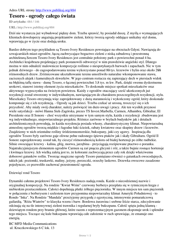 Adres URL strony http://www.publikuj.org/484 Tesoro - ogrody całego świata ID artykułu: 484 / 146 URL: http://www.publikuj.org/484 Dziś nie wystarcza już wybudować piękny dom. Trzeba sprawić, by posiadał duszę. Z myślą o wymagających klientach deweloperzy angażują projektantów zieleni, którzy tworzą ogrody oddające unikalny styl domu, wprawiają go w życie oraz dodają uroku. Bardzo dobrym tego przykładem są Tesoro Ivory Residences powstające na obrzeżach Gdyni. Nawiązują do szwajcarskich miast-ogrodów, łączą zachwycające bogactwo zieleni z niską zabudową i przestronną architekturą.Sercem Tesoro Ivory Residences jest centralnie położony park o powierzchni ponad 4 ha. Architekci krajobrazu projektujący park postanowili odtworzyć w nim prawdziwie angielski styl. Dlatego można w nim odnaleźć malownicze kompozycje roślinne o niespotykanych barwach i zapachach. Nic w tym jednak dziwnego - do zagospodarowania terenu wykorzystano ponad 80 tys. krzewów i bylin oraz około 200 różnorodnych drzew. Zróżnicowane ukształtowanie terenu umożliwiło naturalne wkomponowanie stawu, zacisznych alejek i kameralnych skwerków. W jego centrum roztacza się zapierający dech w piersiach widok na błękitną taflę stawu - dumę Tesoro, o łącznej powierzchni 3,8 tys. m kw. Park, dzięki swemu dyskretnemu urokowi, stanowi istotny element życia mieszkańców. To doskonałe miejsce spotkań mieszkańców oraz aktywnego wypoczynku na świeżym powietrzu. Każdy z ogrodów otaczający sześć ukończonych już rezydencji został stworzony w indywidualnym, nawiązującym do charakteru poszczególnych rezydencji, stylu. Mieszkańcy Tesoro otrzymują więc zaprojektowany z dużą starannością i wykończony ogród, który doskonale komponuje się z ich rezydencją. - Ogrody są jak dzieci. Trzeba czekać aż urosną, troszczyć się o ich przyszłość. Aby miały swój charakter, należy poświęcić im dużo uwagi i pracy. Ale ten wysiłek przynosi wiele satysfakcji - mówi Hanna Siek-Zagórska, prezes TS Invest.Marbella, Carmen, Alhambra, Gibraltar, El Presidente oraz Il Sonore - choć wszystkie utrzymane w tym samym stylu, każda z rezydencji zbudowana jest wg indywidualnego, niepowtarzalnego projektu. Różnice zarówno w bryłach budynków jak i detalach architektonicznych powodują, że każda rezydencja posiada własny, charakterystyczny klimat. Niepowtarzalną atmosferę ogrodów tworzą miękkie i łagodne łuki ścieżek, rabaty kwiatowe oraz skupiny drzew i krzewów. Znajdziemy w nich orientalne rośliny śródziemnomorskie, bukszpany, juki czy agawy. Inspiracją dla ogrodów Tesoro były zarówno gaje oliwne pełne radosnego śpiewu ptaków jak i skały Gibraltaru. Ogród Il Sonore zaprojektowany został tak, by cieszyć różnorodnością koloru od białej hortensji po żółte rudbekie. Silnie owocujące krzewy - kalina, głóg, morwa, jarzębina - przyciągają rozśpiewane ptactwo o poranku. Najatrakcyjniejszym elementem ogrodów Carmen są zaś pnącza glicynii i róż, a także bujnie rosnące hortensje i kwitnące krzewy. Ich wielką zaletą jest to, że kolorami zachwycają przez cały rok dzięki właściwemu doborowi gatunków roślin. Tworząc magiczne ogrody Tesoro pamiętano również o gatunkach owocodajnych, takich jak: poziomki, truskawki, maliny, jeżyny, porzeczki, orzechy laskowe. Drzewka owocowe zasadzono pojedynczo, co pozwoliło zachować przestronność ogrodu. Dziewięć rond Tesoro Dynamiki całemu projektowi Tesoro Ivory Residences nadają ronda. Każde o niecodziennej nazwie i oryginalnej kompozycji. Na rondzie "Kwiat Wiśni" czerwony berberys przeplata się w rytmicznym kręgu z niebieskim przetacznikiem. Całości dopełniają płatki żółtego pięciornika. W innym miejscu ten sam pięciornik w połączeniu z berberysem i szelestem traw przypomina niepowtarzalny klimat Ameryki Południowej - to Rondo "Inka". Na Rondzie "Mandala" przeżyjemy przygodę z egzotyczną, intensywnie pomarańczową gailardią. "Róża Wiatrów" to klasyka wzoru i barw. Bordowa żurawina i srebrne liście starca, zdecydowanie odcinają się na tle intensywnej zieleni trawnika i regularnej bryły bukszpanu. Całość spięta jedną klamrą dziewiątym rondem przy bramie głównej, które razem z reprezentacyjnym gazonem eksponuje urok i splendor tego miejsca. Toczące się kule bukszpanu wprawiają całe założenie w ruch sprawiając, że emanuje ono energią. BC MFD Media Communications ul. Kruczkowskiego 6 C lok. 13 Strona 1 / 2 00-412 Warszawa tel. 022 403 50 91 www.bcmfd.pl Aktywacja: 25/11/08 09:54, odsłony: 749 Strona 2 / 2