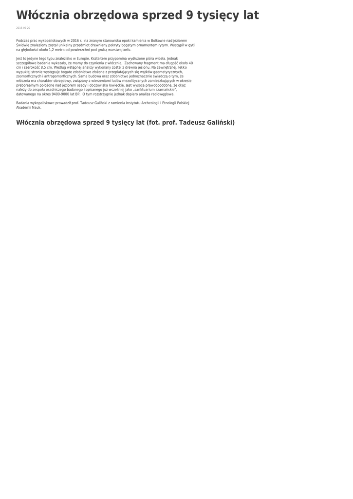 Włócznia obrzędowa sprzed 9 tysięcy lat 2016-09-20 Podczas prac wykopaliskowych w 2016 r. na znanym stanowisku epoki kamienia w Bolkowie nad jeziorem Świdwie znaleziony został unikalny przedmiot drewniany pokryty bogatym ornamentem rytym. Wystąpił w gytii na głębokości około 1,2 metra od powierzchni pod grubą warstwą torfu. Jest to jedyne tego typu znalezisko w Europie. Kształtem przypomina wydłużone pióra wiosła. Jednak szczegółowe badania wykazały, że mamy do czynienia z włócznią. Zachowany fragment ma długość około 40 cm i szerokość 8,5 cm. Według wstępnej analizy wykonany został z drewna jesionu. Na zewnętrznej, lekko wypukłej stronie występuje bogate zdobnictwo złożone z przeplatających się wątków geometyrycznych, zoomorficznych i antropomorficznych. Sama budowa oraz zdobnictwo jednoznacznie świadczą o tym, że włócznia ma charakter obrzędowy, związany z wierzeniami ludów mezolitycznych zamieszkujących w okresie preborealnym położone nad jeziorem osady i obozowiska łowieckie. Jest wysoce prawdopodobne, że okaz należy do zespołu osadniczego badanego i opisanego już wcześniej jako „sanktuarium szamańskie”, datowanego na okres 9400-9000 lat BP. O tym rozstrzygnie jednak dopiero analiza radiowęglowa. Badania wykopaliskowe prowadził prof. Tadeusz Galiński z ramienia Instytutu Archeologii i Etnologii Polskiej Akademii Nauk. Włócznia obrzędowa sprzed 9 tysięcy lat (fot. prof. Tadeusz Galiński)