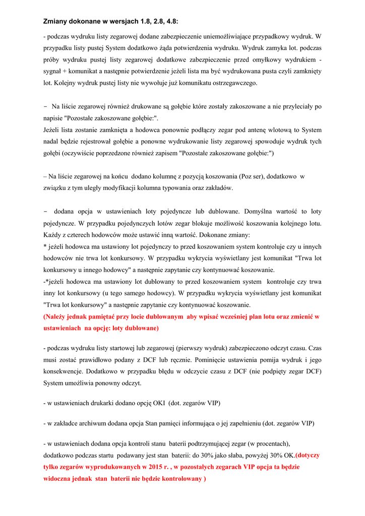 Zmiany dokonane w wersjach 1.8, 2.8, 4.8: - podczas wydruku listy zegarowej dodane zabezpieczenie uniemożliwiające przypadkowy wydruk. W przypadku listy pustej System dodatkowo żąda potwierdzenia wydruku. Wydruk zamyka lot. podczas próby wydruku pustej listy zegarowej dodatkowe zabezpieczenie przed omyłkowy wydrukiem sygnał + komunikat a następnie potwierdzenie jeżeli lista ma być wydrukowana pusta czyli zamknięty lot. Kolejny wydruk pustej listy nie wywołuje już komunikatu ostrzegawczego. - Na liście zegarowej również drukowane są gołębie które zostały zakoszowane a nie przyleciały po napisie "Pozostałe zakoszowane gołębie:". Jeżeli lista zostanie zamknięta a hodowca ponownie podłączy zegar pod antenę wlotową to System nadal będzie rejestrował gołębie a ponowne wydrukowanie listy zegarowej spowoduje wydruk tych gołębi (oczywiście poprzedzone również zapisem "Pozostałe zakoszowane gołębie:") – Na liście zegarowej na końcu dodano kolumnę z pozycją koszowania (Poz ser), dodatkowo w związku z tym uległy modyfikacji kolumna typowania oraz zakładów. - dodana opcja w ustawieniach loty pojedyncze lub dublowane. Domyślna wartość to loty pojedyncze. W przypadku pojedynczych lotów zegar blokuje możliwość koszowania kolejnego lotu. Każdy z czterech hodowców może ustawić inną wartość. Dokonane zmiany: * jeżeli hodowca ma ustawiony lot pojedynczy to przed koszowaniem system kontroluje czy u innych hodowców nie trwa lot konkursowy. W przypadku wykrycia wyświetlany jest komunikat "Trwa lot konkursowy u innego hodowcy" a następnie zapytanie czy kontynuować koszowanie. -*jeżeli hodowca ma ustawiony lot dublowany to przed koszowaniem system kontroluje czy trwa inny lot konkursowy (u tego samego hodowcy). W przypadku wykrycia wyświetlany jest komunikat "Trwa lot konkursowy" a następnie zapytanie czy kontynuować koszowanie. (Należy jednak pamiętać przy locie dublowanym aby wpisać wcześniej plan lotu oraz zmienić w ustawieniach na opcję: loty dublowane) - podczas wydruku listy startowej lub zegarowej (pierwszy wydruk) zabezpieczono odczyt czasu. Czas musi zostać prawidłowo podany z DCF lub ręcznie. Pominięcie ustawienia pomija wydruk i jego konsekwencje. Dodatkowo w przypadku błędu w odczycie czasu z DCF (nie podpięty zegar DCF) System umożliwia ponowny odczyt. - w ustawieniach drukarki dodano opcję OKI (dot. zegarów VIP) - w zakładce archiwum dodana opcja Stan pamięci informująca o jej zapełnieniu (dot. zegarów VIP) - w ustawieniach dodana opcja kontroli stanu baterii podtrzymującej zegar (w procentach), dodatkowo podczas startu podawany jest stan baterii: do 30% jako słaba, powyżej 30% OK.(dotyczy tylko zegarów wyprodukowanych w 2015 r. , w pozostałych zegarach VIP opcja ta będzie widoczna jednak stan baterii nie będzie kontrolowany )