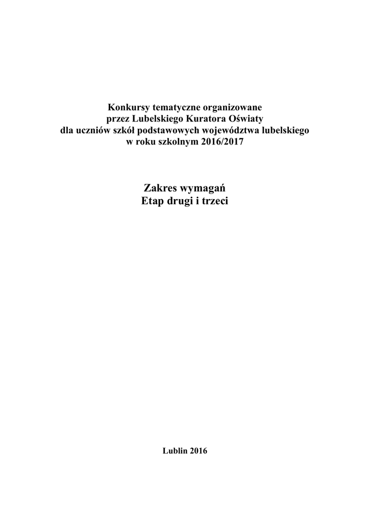 Konkursy tematyczne organizowane przez Lubelskiego Kuratora Oświaty dla uczniów szkół podstawowych województwa lubelskiego w roku szkolnym 2016/2017 Zakres wymagań Etap drugi i trzeci Lublin 2016 1. WOJEWÓDZKI KONKURS POLONISTYCZNY 1.1. Cele edukacyjne Pogłębianie zainteresowania polską literaturą, tradycją narodowa i ich udziałem w kulturze europejskiej. Rozbudzanie zamiłowania do refleksyjnego i twórczego odbioru dzieł literackich i innych tekstów kultury. Doskonalenie umiejętności czytania ze zrozumieniem na różnych poziomach tekstów literackich, popularnonaukowych, publicystycznych, użytkowych. Rozwijanie sprawności pisania z troską o poprawność redagowanego tekstu w każdym z jego aspektów. Doskonalenie umiejętności posługiwania się językiem jako nośnikiem wartości, a także narzędziem komunikacji oraz wyrażania myśli i uczuć. 1.2. Szczegółowy opis treści programowych obowiązujących na poszczególnych etapach konkursu I. Drugi etap konkursu (90 minut, liczba punktów: 40) Wymagania szczegółowe z podstawy programowej I. Odbiór wypowiedzi i wykorzystanie zawartych w nich informacji. 1. Czytanie i słuchanie. Uczeń: 2) określa temat i główną myśl tekstu; 3) identyfikuje nadawcę i odbiorcę wypowiedzi (autora, narratora, czytelnika, słuchacza); 4) identyfikuje wypowiedź jako tekst informacyjny, literacki, reklamowy. 5) rozpoznaje formy gatunkowe (zaproszenie, życzenia i gratulacje, zawiadomienie i ogłoszenie, instrukcję, w tym przepis); 6) odróżnia zawarte w tekście informacje ważne od informacji drugorzędnych; 7) wyszukuje w tekście informacje wyrażone wprost i pośrednio (ukryte); 8) rozumie dosłowne i przenośne znaczenie wyrazów w wypowiedzi; 9) wyciąga wnioski wynikające z przesłanek zawartych w tekście (w tym rozpoznaje w nim prawdę lub fałsz); 10) dostrzega relacje między częściami składowymi wypowiedzi (tytuł, wstęp, rozwinięcie, zakończenie, akapity). 2. Samokształcenie i docieranie do informacji. Uczeń korzysta z informacji zawartych w encyklopedii, słowniku ortograficznym, słowniku języka polskiego (małym lub podręcznym), słowniku wyrazów bliskoznacznych. 3. Świadomość językowa. Uczeń: 1) rozpoznaje podstawowe funkcje składniowe wyrazów użytych w wypowiedziach (podmiot, orzeczenie, dopełnienie, przydawka, okolicznik); 2) rozpoznaje w tekście zdania pojedyncze nierozwinięte i rozwinięte, pojedyncze i złożone (współrzędnie i podrzędnie), równoważniki zdań – i rozumie ich funkcje; 3) rozpoznaje w wypowiedziach podstawowe części mowy (rzeczownik, czasownik, przymiotnik, przysłówek, liczebnik, zaimek, przyimek, spójnik) i wskazuje różnice między nimi; 4) rozpoznaje w tekście formy przypadków, liczb, osób, czasów i rodzajów gramatycznych – rozumie ich funkcje w wypowiedzi; 5) rozpoznaje znaczenie niewerbalnych środków komunikowania się (gest, wyraz twarzy, mimika, postawa ciała). II. Analiza i interpretacja tekstów kultury. Uczeń zna teksty literackie i inne teksty kultury wskazane przez nauczyciela. 1. Wstępne rozpoznanie. Uczeń: 1) nazywa swoje reakcje czytelnicze (np. wrażenia, emocje); 2) konfrontuje sytuację bohaterów z własnymi doświadczeniami; 3) wyraża swój stosunek do postaci. 2. Analiza. Uczeń: 1) dostrzega swoistość artystyczną dzieła; 2) odróżnia fikcję artystyczną od rzeczywistości; 3) odróżnia realizm od fantastyki; 4) rozpoznaje w tekście literackim: porównanie, przenośnię, epitet, wyraz dźwiękonaśladowczy i objaśnia ich role; 5) rozpoznaje: wers, zwrotkę (strofę), rym, rytm, refren; odróżnia wiersz rymowany i nierymowany (biały); 9) omawia akcję, wyodrębnia wątki i wydarzenia; 10) charakteryzuje i ocenia bohaterów; 11) identyfikuje: opowiadanie, powieść, baśń, legendę, mit, bajkę, fraszkę, wiersz, przysłowie, komiks. 3. Interpretacja. Uczeń: 1) odbiera teksty kultury na poziomie dosłownym i przenośnym; 2) objaśnia morał bajki oraz samodzielnie formułuje przesłanie baśni. 4. Wartości i wartościowanie. Uczeń odczytuje wartości pozytywne i ich przeciwieństwa wpisane w teksty kultury (np. przyjaźń – wrogość, miłość – nienawiść, prawda – kłamstwo, wierność – zdrada). III. Tworzenie wypowiedzi. 1. Mówienie i pisanie. Uczeń: 1) tworzy spójne teksty na tematy poruszane na zajęciach – związane z otaczającą rzeczywistością i poznanymi tekstami kultury; 2) dostosowuje sposób wyrażania się do oficjalnej i nieoficjalnej sytuacji komunikacyjnej oraz do zamierzonego celu; 3) formułuje pytania do tekstu; 4) świadomie posługuje się różnymi formami językowymi; 5) tworzy wypowiedzi pisemne w następujących formach gatunkowych: […] proste sprawozdanie (np. z wycieczki, z wydarzeń sportowych), opis postaci, przedmiotu, krajobrazu, ogłoszenie, zaproszenie, prosta notatka; 6) stosuje w wypowiedzi pisemnej odpowiednią kompozycję i układ graficzny zgodny z wymogami danej formy gatunkowej (w tym wydziela akapity); 7) sporządza plan odtwórczy wypowiedzi (ramowy i szczegółowy). 2. Świadomość językowa. Uczeń: 1) rozróżnia i poprawnie zapisuje zdania oznajmujące, pytające i rozkazujące; 2) przekształca zdania złożone w pojedyncze i odwrotnie, a także zdania w równoważniki zdań i odwrotnie – odpowiednio do przyjętego celu; 3) stosuje poprawne formy gramatyczne wyrazów odmiennych; 4) poprawnie stopniuje przymiotniki i przysłówki i używa ich we właściwych kontekstach; 7) operuje słownictwem z określonych kręgów tematycznych (na tym etapie skoncentrowanym przede wszystkim wokół tematów: dom, rodzina, szkoła i nauka, środowisko przyrodnicze i społeczne). Zagadnienia spoza podstawy Wymagane umiejętności programowej Dedykacja, podziękowanie, przeprosiny, Dokonuje gramatyczno-stylistycznych komplement, odmowa, polecenia, powitania, przekształceń tekstów w zależności od celu pożegnania, prośby, przedstawianie się, w
