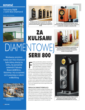 REPORTAŻ Kolumny B&W z serii 800 Diamond UTekst i zdjęcia: Filip Kulpa W nowej serii 800 nie ma już modelu 801. Powód? Poprzednik był zbyt trudny w aplikacji w nie najlepszych pomieszczeniach (czytaj: na ogół sprawdzał się gorzej niż 802D) Teraz nawet 805-ki mają diamentową kopułkę. Podczas demonstracji wypadły nadspodziewanie dobrze w porównaniu z modelem 802. Szczególnie z subwooferem DB1 ZA KULISAMI DIAMENTOWEJ Niedawna premiera nowej serii 800 Diamond była dobrą okazją ku temu, by ponownie odwiedzić fabrykę Bowers&Wilkins. Kolumny z tej szczytowej serii powstają w całości w Worthing SERII 800 Obecne 804-ki wykorzystują głośnik średniotonowy FST. Dzięki błyszczącym obrączkom wokół membran wyglądają efektowniej niż kiedyś. Kosztują jednak niemało: 26 tysięcy złotych abryka przy Dale Road, położona niecały kilometr, w linii prostej, od południowego wybrzeża Wielkiej Brytanii i około 16 km na zachód od klimatycznego Brighton, produkuje od dobrych kilku miesięcy zestawy głośnikowe serii 800 Diamond. Po raz pierwszy pokazano je na CES 2010 w styczniu br. Kolumny nie wszędzie dotarły równocześnie. Przeszkodą okazały się ograniczone możliwości produkcyjne – tym bardziej, że niewiele wcześniej podjęto decyzję o zamknięciu duńskiej fabryki obudów i przeniesieniu całego parku maszynowego do głównej fabryki – właśnie w Worthing. W związku z tym B&W początkowo nie było w stanie zagwarantować podaży, która pokryłaby globalne zapotrzebowanie na serię 800. Nie zapominajmy, że są to najpopularniejsze kolumny głośnikowe high-end na świecie. F EWOLUCJA ZAMIAST REWOLUCJI Hala produkcyjno-montażowa serii 800. Porządek i bardzo skrupulatna kontrola jakości 52 AUDIO VIDEO Gdyby doszukiwać się jakiejś analogii przemysłowej, strategię B&W, w odniesieniu do swoich kluczowych produktów, można by porównać z tą z grupy Volkswagena. Wielu obserwatorów zarzuca szefostwu tego giganta motoryzacyjnego nadmierny konserwatyzm, jeśli chodzi o stylistykę. Golf ewoluuje powoli, dzięki czemu nawet kosmita, powracający na Ziemię po 20 (ziemskich) latach nie miałby trudności z odgadnięciem, że Golf VI to nadal Golf. Wizytówką serii pozostanie model 800 stojący na dużym postumencie zawierającym wielką, choć wcale nieskomplikowaną zwrotnicę (patrz fot. na str. 54) Nowe zaciski głośnikowe zostały zainspirowane złączami NextGen firmy WBT. Użycie miedzi spowodowało podobno słyszalną poprawę jakości brzmienia A jednak auto to pozostaje wzorem w swojej klasie, co wynika z jego ogólnego dopracowania i bardzo dobrej techniki. Trochę podobnie jest z serią 800 (dawniej nazywaną Nautilus), która wprawdzie wygląda o wiele lepiej niż Golf, ale przecież znamy ją już od 1998 roku i od tego czasu wizualnie prawie się nie zmieniła. W zasadzie trudno mieć o to pretensje, bo projekt wzorniczy wydaje się ponadczasowy (choć nie tak, jak w przypadku legendarnych „ślimaków” – notabene wciąż produkowanych!). Wprowadzenie kopułki diamentowej do kilku modeli (2005) było okazją do zmiany tego i owego (głównie filtrów), ale szkielet konstrukcji: głowy z laminatu (od modelu 802 wzwyż), rurki za tweeterami, kratownica Matrix i ścianki ze sklejek, pozostał taki sam. Co zatem wnosi seria 800 Diamond? W istocie wiele elementów naraz, które sumarycznie mają dawać inny, znacznie lepszy produkt. Zmiany są właściwie wyłącznie „podskórne”, jeśli nie liczyć srebrnych pierścieni wokół zawieszeń głośników czy robionych na zamówienie terminali głośnikowych wykonanych z miedzi OFC (zamiast mosiądzu). Główne modyfikacje dotyczą układów napędowych. Głośniki basowe (7-calowe w modelu 804, 8-calowe w 802 i 10-calowe w 800) otrzymały podwójne magnesy neodymowe umieszczone jeden za drugim. Zabieg ten ma linearyzować pole magnetyczne w szczelinie, a więc redukować zniekształcenia nieliniowe przy du- Jedną z różnic dzielących porządne fabryki europejskie od chińskich jest pilnie przestrzeganie norm BHP żych amplitudach wychylenia membran. Membrany z Rohacellu – ekstremalnie sztywnego sandwicza (patrz zdjęcia), złożonego z włókien węglowych i pianki, wykorzystywanego m.in. w przemyśle lotniczym i superautach – pozostały bez zmian. Udoskonalenie przetworników nie spowodowało zmiany podstawowych parametrów (pasmo, efektywność), lecz wpłynęły na poprawę odtwarzania niskich tonów – ich barwy, plastyki, impulsywności (tak twierdzi B&W). Również kopułki diamentowe mogą pochwalić się nowym napędem. W tym wypadku są aż 4 magnesy. Dwa z nich mają formę pierścieni znajdujących się za obrzeżami kopułki. Przypomnijmy, bo to istotne, że membrany są wykonane z diamentu syntetycznego w procesie CVD (chemical vapor deposition – napylanie chemiczne). Producentem jest firma Element Six – specjalista od supermateriałów ściernych i właśnie sztucznego diamentu. Przy okazji powyższych modyfikacji dokonano tuningu zwrotnic, zachowując jednak – tam gdzie się da – minimalistyczne filtry 1. rzędu (6 dB/okt). Tak filtrowane są pasma w torze tweeterów, natomiast cięcia w niższych pasmach są zwykle 2. rzędu. W krytycznych miejscach zastosowano najlepsze i najdroższe kondensatory Mundorfa z serii Supreme (Silver, Gold Oil). Gdy patrzymy na nową serię 800, na usta ciśnie się pytanie, dlaczego po 12 latach produkcji nie zdecydowano się na jakieś udoskonalenia obudów. Zapytany o to Mike Gough, trener produktowy i były akustyk-in- Nowe głośniki basowe mają podwójne neodymowe magnesy. Wyglądają dziwnie, ale zysk jest ponoć znaczący Sprzęt, który robi wrażenie na nie-inżynierach mechaniki precyzyjnej. Pozwala mierzyć każdą odległość, kształt, wymiary dowolnej bryły z dokładnością do setnych części milimetra. Skan nanoszony jest do pamięci komputera i porównywany z wzorcem. Jeśli ten wzorcowy kosz n
