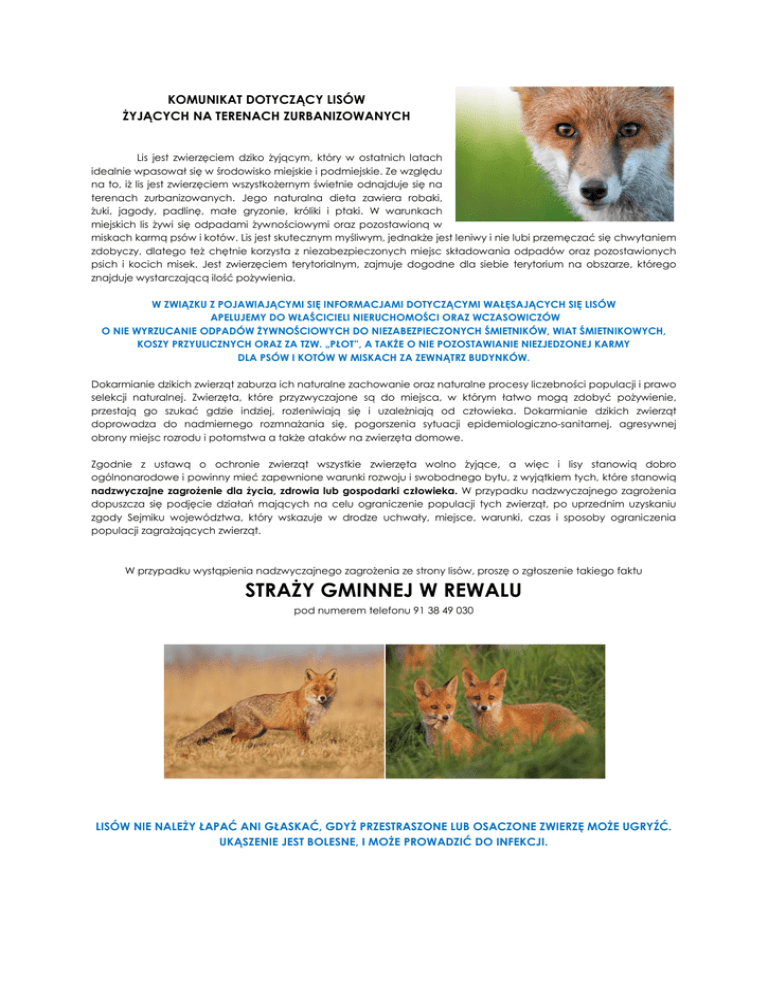 KOMUNIKAT DOTYCZĄCY LISÓW ŻYJĄCYCH NA TERENACH ZURBANIZOWANYCH Lis jest zwierzęciem dziko żyjącym, który w ostatnich latach idealnie wpasował się w środowisko miejskie i podmiejskie. Ze względu na to, iż lis jest zwierzęciem wszystkożernym świetnie odnajduje się na terenach zurbanizowanych. Jego naturalna dieta zawiera robaki, żuki, jagody, padlinę, małe gryzonie, króliki i ptaki. W warunkach miejskich lis żywi się odpadami żywnościowymi oraz pozostawioną w miskach karmą psów i kotów. Lis jest skutecznym myśliwym, jednakże jest leniwy i nie lubi przemęczać się chwytaniem zdobyczy, dlatego też chętnie korzysta z niezabezpieczonych miejsc składowania odpadów oraz pozostawionych psich i kocich misek. Jest zwierzęciem terytorialnym, zajmuje dogodne dla siebie terytorium na obszarze, którego znajduje wystarczającą ilość pożywienia. W ZWIĄZKU Z POJAWIAJĄCYMI SIĘ INFORMACJAMI DOTYCZĄCYMI WAŁĘSAJĄCYCH SIĘ LISÓW APELUJEMY DO WŁAŚCICIELI NIERUCHOMOŚCI ORAZ WCZASOWICZÓW O NIE WYRZUCANIE ODPADÓW ŻYWNOŚCIOWYCH DO NIEZABEZPIECZONYCH ŚMIETNIKÓW, WIAT ŚMIETNIKOWYCH, KOSZY PRZYULICZNYCH ORAZ ZA TZW. „PŁOT”, A TAKŻE O NIE POZOSTAWIANIE NIEZJEDZONEJ KARMY DLA PSÓW I KOTÓW W MISKACH ZA ZEWNĄTRZ BUDYNKÓW. Dokarmianie dzikich zwierząt zaburza ich naturalne zachowanie oraz naturalne procesy liczebności populacji i prawo selekcji naturalnej. Zwierzęta, które przyzwyczajone są do miejsca, w którym łatwo mogą zdobyć pożywienie, przestają go szukać gdzie indziej, rozleniwiają się i uzależniają od człowieka. Dokarmianie dzikich zwierząt doprowadza do nadmiernego rozmnażania się, pogorszenia sytuacji epidemiologiczno-sanitarnej, agresywnej obrony miejsc rozrodu i potomstwa a także ataków na zwierzęta domowe. Zgodnie z ustawą o ochronie zwierząt wszystkie zwierzęta wolno żyjące, a więc i lisy stanowią dobro ogólnonarodowe i powinny mieć zapewnione warunki rozwoju i swobodnego bytu, z wyjątkiem tych, które stanowią nadzwyczajne zagrożenie dla życia, zdrowia lub gospodarki człowieka. W przypadku nadzwyczajnego zagrożenia dopuszcza się podjęcie działań mających na celu ograniczenie populacji tych zwierząt, po uprzednim uzyskaniu zgody Sejmiku województwa, który wskazuje w drodze uchwały, miejsce, warunki, czas i sposoby ograniczenia populacji zagrażających zwierząt. W przypadku wystąpienia nadzwyczajnego zagrożenia ze strony lisów, proszę o zgłoszenie takiego faktu STRAŻY GMINNEJ W REWALU pod numerem telefonu 91 38 49 030 LISÓW NIE NALEŻY ŁAPAĆ ANI GŁASKAĆ, GDYŻ PRZESTRASZONE LUB OSACZONE ZWIERZĘ MOŻE UGRYŹĆ. UKĄSZENIE JEST BOLESNE, I MOŻE PROWADZIĆ DO INFEKCJI.