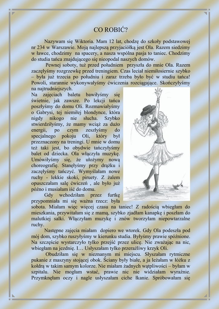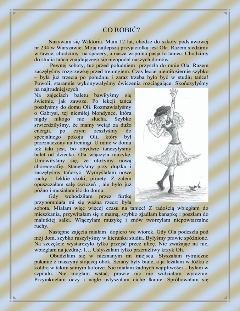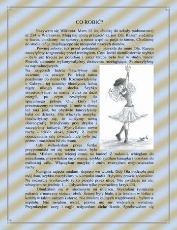 CO ROBIĆ? Nazywam się Wiktoria. Mam 12 lat, chodzę do szkoły podstawowej nr 234 w Warszawie. Moją najlepszą przyjaciółką jest Ola. Razem siedzimy w ławce, chodzimy na spacery, a nasza wspólna pasja to taniec. Chodzimy do studia tańca znajdującego się nieopodal naszych domów. Pewnej soboty, tuż przed południem przyszła do mnie Ola. Razem zaczęłyśmy rozgrzewkę przed treningiem. Czas leciał niemiłosiernie szybko – była już trzecia po południu i zaraz trzeba było być w studiu tańca! Powoli, starannie wykonywałyśmy ćwiczenia rozciągające. Skończyłyśmy na najtrudniejszych. Na zajęciach baletu bawiłyśmy się świetnie, jak zawsze. Po lekcji tańca poszłyśmy do domu Oli. Rozmawiałyśmy o Gabrysi, tej niemiłej blondynce, która nigdy nikogo nie słucha. Szybko stwierdziłyśmy, że mamy wciąż za dużo energii, po czym zeszłyśmy do specjalnego pokoju Oli, który był przeznaczony na treningi. U mnie w domu też taki jest, bo obydwie tańczyłyśmy balet od dziecka. Ola włączyła muzykę. Umówiłyśmy się, że ułożymy nową choreografię. Stanęłyśmy przy drążku i zaczęłyśmy tańczyć. Wymyślałam nowe ruchy - lekkie skoki, piruety. Z żalem opuszczałam salę ćwiczeń , ale było już późno i musiałam iść do domu. Gdy wchodziłam przez furtkę przypomniała mi się ważna rzecz: była sobota. Miałam więc więcej czasu na taniec! Z radością wbiegłam do mieszkania, przywitałam się z mamą, szybko zjadłam kanapkę i poszłam do malutkiej salki. Włączyłam muzykę i znów tworzyłam niepowtarzalne ruchy. Następne zajęcia miałam dopiero we wtorek. Gdy Ola podeszła pod mój dom, szybko ruszyłyśmy w kierunku studia. Byłyśmy prawie spóźnione. Na szczęście wystarczyło tylko przejść przez ulicę. Nie zważając na nic, wbiegłam na jezdnię. I… Usłyszałam tylko przeraźliwy krzyk Oli. Obudziłam się w nieznanym mi miejscu. Słyszałam rytmiczne pukanie z maszyny stojącej obok. Ściany były białe, a ja leżałam w łóżku z kołdrą w takim samym kolorze. Nie miałam żadnych wątpliwości – byłam w szpitalu. Nie mogłam wstać, prawie nic nie widziałam wyraźnie. Przymknęłam oczy i nagle usłyszałam ciche łkanie. Spróbowałam się rozejrzeć. To moja mama płakała a tata otoczył ją ramieniem. Za dziwną szklaną ścianą spostrzegłam także Olę i jej rodziców. Chciałam zerwać się na nogi, powiedzieć mamie, że nic się nie stało, jednak zanim to uczyniłam, poczułam przeszywający ból w lewej nodze. Opadłam z powrotem na twardą poduszkę. Po kilku minutach do sali wszedł lekarz i chyba kazał rodzicom wyjść, bo zaraz opuścili pomieszczenie. Obok mnie usiadła pielęgniarka i zaczęła coś do mnie mówić. Gdy przenosiła mnie na wózek inwalidzki, z przerażeniem spojrzałam, że amputowano mi nogę. Po prostu tam nie było mojej lewej nogi… Rozpłakałam się straszliwie. Do salki wbiegła mama, tata i Ola. Mama stała nade mną, przyjaciółka zawisła mi na szyi, a tata tylko to obserwował. Po dwóch dniach przyszedł psycholog , który porozmawiał z rodzicami. W ogóle cała rodzina nam bardzo pomagała. Po miesiącu leżenia w szpitalu lekarz oznajmił, że mogę wrócić do domu. Podał rodzicom mały stosik kartek. Po czym skierował nas do windy. W domu odwiedzała mnie Ola. Wyżalałam się jej, że nigdy już nie będę mogła tańczyć. Próbowała mnie pocieszyć. Ale co mogło mi poprawić nastrój? Oczywiście, że nic. Teraz nie będę mogła tańczyć. Nie wiem co mam robić. Odebrano mi moją największą pasję i nigdy jej nie odzyskam. *** Wiktoria straciła swoją największą pasję. Czy warto było? Czy nie lepiej byłoby się spóźnić?