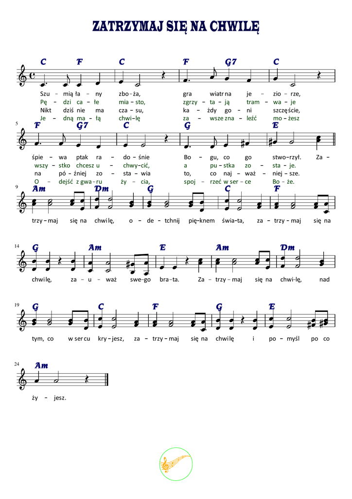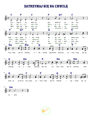 ZATRZYMAJ SIĘ NA CHWILĘ C F C mią ła dzi ca dziś nie dną ma ny łe ma łą zbo ża, mia sto, cza su, chwi lę Szu Pę Nikt Je 5 F śpie wszy na O 9 wa ptak stko chcesz pó źniej dejść z gwa Am trzy maj 14 C do śnie chwy cić, sta wia ży cia, Bo a to, spoj gu, pu co rzeć o de tchnij pię knem E u waż C bra ta. Za F ży świa ta, za trzy maj trzy maj się na nad chwi lę, E w ser cu za trzy maj się na po myśl C się na jesz. Za Dm kry jesz, F G Am stwo rzył. sta je. niej sze. Bo że. Am swe go go zo waż ce C się na co stka naj w ser G chwi lę, zio rze, wa je szczę ście, mo żesz E ra u zo ru je tram ni leźć G G tym, co wiatr na ta ją żdy go wsze zna za 24 gra zgrzy ka za Am chwi lę, G C 19 Dm G7 G7 F chwilę i po co