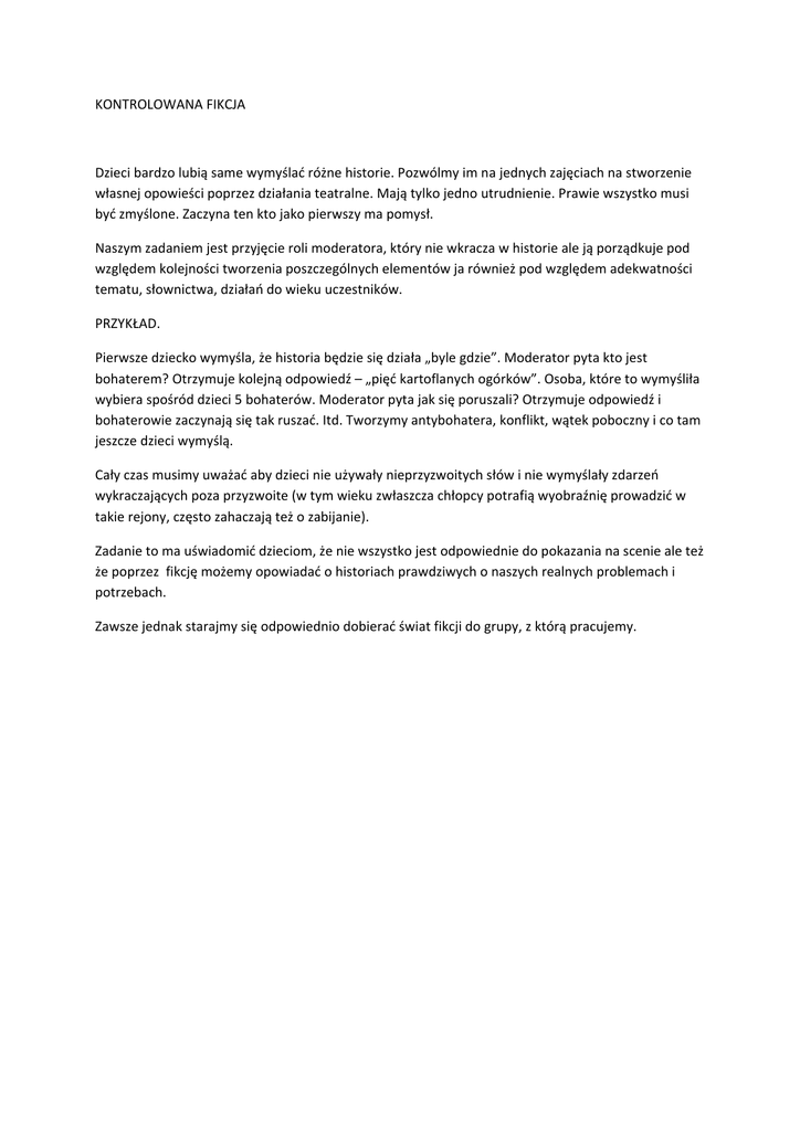KONTROLOWANA FIKCJA Dzieci bardzo lubią same wymyślać różne historie. Pozwólmy im na jednych zajęciach na stworzenie własnej opowieści poprzez działania teatralne. Mają tylko jedno utrudnienie. Prawie wszystko musi być zmyślone. Zaczyna ten kto jako pierwszy ma pomysł. Naszym zadaniem jest przyjęcie roli moderatora, który nie wkracza w historie ale ją porządkuje pod względem kolejności tworzenia poszczególnych elementów ja również pod względem adekwatności tematu, słownictwa, działań do wieku uczestników. PRZYKŁAD. Pierwsze dziecko wymyśla, że historia będzie się działa „byle gdzie”. Moderator pyta kto jest bohaterem? Otrzymuje kolejną odpowiedź – „pięć kartoflanych ogórków”. Osoba, które to wymyśliła wybiera spośród dzieci 5 bohaterów. Moderator pyta jak się poruszali? Otrzymuje odpowiedź i bohaterowie zaczynają się tak ruszać. Itd. Tworzymy antybohatera, konflikt, wątek poboczny i co tam jeszcze dzieci wymyślą. Cały czas musimy uważać aby dzieci nie używały nieprzyzwoitych słów i nie wymyślały zdarzeń wykraczających poza przyzwoite (w tym wieku zwłaszcza chłopcy potrafią wyobraźnię prowadzić w takie rejony, często zahaczają też o zabijanie). Zadanie to ma uświadomić dzieciom, że nie wszystko jest odpowiednie do pokazania na scenie ale też że poprzez fikcję możemy opowiadać o historiach prawdziwych o naszych realnych problemach i potrzebach. Zawsze jednak starajmy się odpowiednio dobierać świat fikcji do grupy, z którą pracujemy.