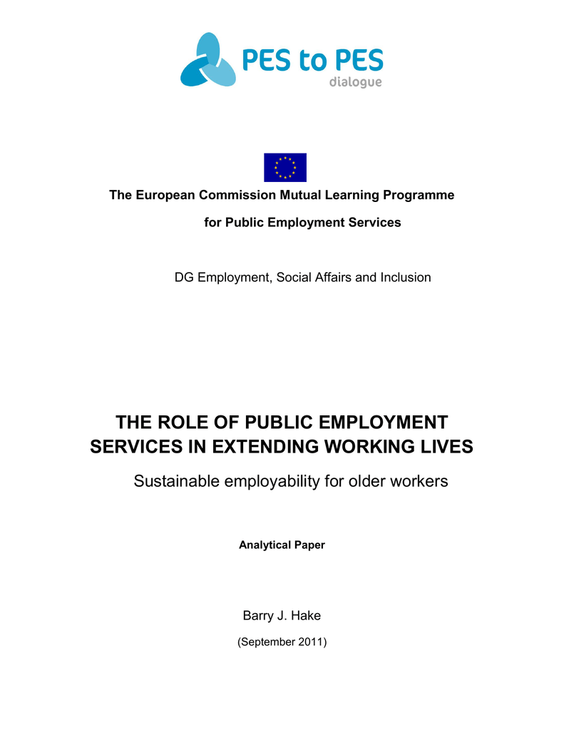 The European Commission Mutual Learning Programme for Public Employment Services DG Employment, Social Affairs and Inclusion THE ROLE OF PUBLIC EMPLOYMENT SERVICES IN EXTENDING WORKING LIVES Sustainable employability for older workers Analytical Paper Barry J. Hake (September 2011) CONTENTS EXECUTIVE SUMMARY ................................................................................................1 1. INTRODUCTION: DEMOGRAPHIC CHANGE AND EXTENDING WORKING LIVES – POLICY TRENDS AND CHALLENGE FOR PES .......................................................2 2. PES PROVISION FOR OLDER WORKERS: SERVICES AND MEASURES FOR OLDER WORKERS AND EMPLOYERS .......................................................................4 2.1 PES services for older unemployed or inactive individuals need to deal with challenges relating to skills, psychological and physical factors ..................................4 2.2 PES services for older workers to maintain employability .....................................8 2.3 PES measures for employers .............................................................................. 12 3 PES AND THE ROLE OF STRATEGIC SERVICE PARTNERSHIPS ...................... 17 4 CONCLUSIONS: PES AND FLEXIBLE WORKING LIVES FOR OLDER WORKERS ............................................................................................................................. 20 REFERENCES ............................................................................................................. 22 Dr Barry J. Hake, Eurolearn Consultants, The Netherlands The information contained in this publication does not necessarily reflect the position or opinion of the European Commission EXECUTIVE SUMMARY In the coming decades, the European Union (EU) will face many challenges arising from fundamental demographic change towards ageing populations and ageing workforces. One of the key requirements facing the Member States is the need to secure higher levels of participation by older workers in the labour market. The labour force will consequently include increasing numbers of older workers who are often lower skilled or hold skills in need of updating. This analytical paper examines the role of Public Employment Services (PES) in extending the working lives of older workers aged 55 and above. Its main focus is on PES services and measures to assist older unemployed workers, maintaining employability among those older workers still in the labour market and work carried out with employers to help change often negative attitudes towards older workers. With regard to integration, PES focus lies on the creation of individualised pathways as evidence shows that older workers face significant difficulties in accessing the labour market without such in-depth assistance. Specific expertise is required among PES counsellors to help address motivational issues, perceptions about own ability to learn, as well as health and to provide tailored skills enhancement. PES have an important role to play in providing measures to recognise and enhance existing skills through training and other measures. Similar PES expertise is also required to provide services to employers to address negative attitudes towards older workers and to assist them with workforce planning and measures which can assist in maintaining employability and workability throughout working life. This often calls for strong partnerships with social partners and other organisations, in particular training providers and those responsible for the accreditation of prior learning. Successful PES measures aimed at extending working lives include assistance in providing access to in-work training through subsidies, training and retraining measures, help with the accreditation of prior learning and employer subsidies. 1 1. INTRODUCTION: DEMOGRAPHIC CHANGE AND EXTENDING WORKING LIVES – POLICY TRENDS AND CHALLENGE FOR PES Demographic change is one of the key challenges facing the European Union (EU) in the coming decades which gives rise to the policy issue of promoting higher levels of participation by older workers in the labour market. Fundamental demographic trends in the EU were first systematically addressed in the EC‟s Green Paper Confronting Demographic Change: New Solidarity between Generations in 2004. Throughout the EU, birth rates are falling, family sizes are shrinking with less than 1.5 children per household, fewer absolute numbers of young people are in initial education and entering the labour market than in previous generations, people are living longer, and national populations are growing very slowly or are actually in decline. Such demographic trends lay the foundations for the acceleration of the ageing of populations in the Member States. Of all the regions in the world, Europe has the highest population share aged over 65 at 15% and this will double to 30% by 2050. These fundamental demographic trends will cause increasing problems for European economies with potential labour and skill shortages, making it imperative to delay the effective age of labour market exit, as well as tapping into the potential of currently inactive individuals. In future, the labour force will consequently include increasing numbers of older workers who are often less-well qualified with low levels of initial education acquired some decades ago in industrial societies. This skills gap will put pressure on levels of productivity. At the same time as the problems of the greying of society become major items on political agendas, the particular problems associated with the funding of pensions are giving rise to calls for older workers to continue working longer and the postponement of retirement. This paper seeks to stimulate discussion on the role of Public Employment Services (PES) in the context of ongoing policy measures which seek to postpone labour market exit and extend the working lives of older people. It provides a basis for reflection about PES serv