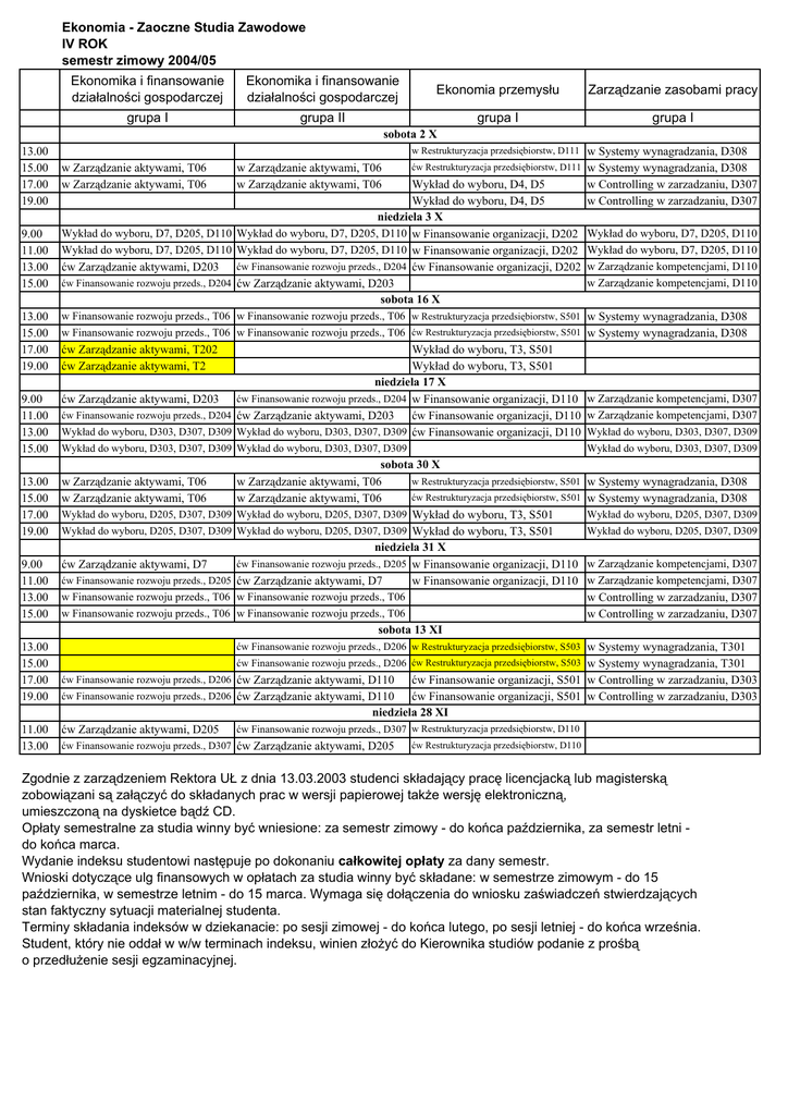 Ekonomia - Zaoczne Studia Zawodowe IV ROK semestr zimowy 2004/05 Ekonomika i finansowanie działalności gospodarczej Ekonomika i finansowanie działalności gospodarczej Ekonomia przemysłu Zarządzanie zasobami pracy grupa I grupa II grupa I grupa I w Restrukturyzacja przedsiębiorstw, D111 w Systemy wynagradzania, D308 w Systemy wynagradzania, D308 w Controlling w zarzadzaniu, D307 w Controlling w zarzadzaniu, D307 sobota 2 X 13.00 15.00 17.00 19.00 9.00 11.00 13.00 15.00 13.00 15.00 17.00 19.00 9.00 11.00 13.00 15.00 13.00 15.00 17.00 19.00 9.00 11.00 13.00 15.00 w Zarządzanie aktywami, T06 w Zarządzanie aktywami, T06 w Zarządzanie aktywami, T06 w Zarządzanie aktywami, T06 ćw Restrukturyzacja przedsiębiorstw, D111 Wykład do wyboru, D4, D5 Wykład do wyboru, D4, D5 niedziela 3 X Wykład do wyboru, D7, D205, D110 Wykład do wyboru, D7, D205, D110 w Finansowanie organizacji, D202 Wykład do wyboru, D7, D205, D110 Wykład do wyboru, D7, D205, D110 w Finansowanie organizacji, D202 ćw Zarządzanie aktywami, D203 ćw Finansowanie rozwoju przeds., D204 ćw Finansowanie organizacji, D202 ćw Finansowanie rozwoju przeds., D204 ćw Zarządzanie aktywami, D203 sobota 16 X Wykład do wyboru, D7, D205, D110 Wykład do wyboru, D7, D205, D110 w Zarządzanie kompetencjami, D110 w Zarządzanie kompetencjami, D110 w Finansowanie rozwoju przeds., T06 w Finansowanie rozwoju przeds., T06 w Restrukturyzacja przedsiębiorstw, S501 w Systemy wynagradzania, D308 w Finansowanie rozwoju przeds., T06 w Finansowanie rozwoju przeds., T06 ćw Restrukturyzacja przedsiębiorstw, S501 w Systemy wynagradzania, D308 ćw Zarządzanie aktywami, T202 ćw Zarządzanie aktywami, T2 Wykład do wyboru, T3, S501 Wykład do wyboru, T3, S501 niedziela 17 X ćw Zarządzanie aktywami, D203 ćw Finansowanie rozwoju przeds., D204 w Finansowanie organizacji, D110 w Zarządzanie kompetencjami, D307 ćw Finansowanie rozwoju przeds., D204 ćw Zarządzanie aktywami, D203 ćw Finansowanie organizacji, D110 w Zarządzanie kompetencjami, D307 Wykład do wyboru, D303, D307, D309 Wykład do wyboru, D303, D307, D309 ćw Finansowanie organizacji, D110 Wykład do wyboru, D303, D307, D309 Wykład do wyboru, D303, D307, D309 Wykład do wyboru, D303, D307, D309 Wykład do wyboru, D303, D307, D309 sobota 30 X w Restrukturyzacja przedsiębiorstw, S501 w Zarządzanie aktywami, T06 w Zarządzanie aktywami, T06 ćw Restrukturyzacja przedsiębiorstw, S501 w Zarządzanie aktywami, T06 w Zarządzanie aktywami, T06 Wykład do wyboru, D205, D307, D309 Wykład do wyboru, D205, D307, D309 Wykład do wyboru, T3, S501 Wykład do wyboru, D205, D307, D309 Wykład do wyboru, D205, D307, D309 Wykład do wyboru, T3, S501 niedziela 31 X ćw Finansowanie rozwoju przeds., D205 w Finansowanie organizacji, D110 ćw Zarządzanie aktywami, D7 ćw Finansowanie rozwoju przeds., D205 ćw Zarządzanie aktywami, D7 w Finansowanie organizacji, D110 w Finansowanie rozwoju przeds., T06 w Finansowanie rozwoju przeds., T06 w Finansowanie rozwoju przeds., T06 w Finansowanie rozwoju przeds., T06 w Systemy wynagradzania, D308 w Systemy wynagradzania, D308 Wykład do wyboru, D205, D307, D309 Wykład do wyboru, D205, D307, D309 w Zarządzanie kompetencjami, D307 w Zarządzanie kompetencjami, D307 w Controlling w zarzadzaniu, D307 w Controlling w zarzadzaniu, D307 sobota 13 XI 13.00 15.00 17.00 19.00 11.00 13.00 ćw Finansowanie rozwoju przeds., D206 w Restrukturyzacja przedsiębiorstw, S503 w Systemy wynagradzania, T301 ćw Finansowanie rozwoju przeds., D206 ćw Restrukturyzacja przedsiębiorstw, S503 w Systemy wynagradzania, T301 ćw Finansowanie rozwoju przeds., D206 ćw Zarządzanie aktywami, D110 ćw Finansowanie organizacji, S501 w Controlling w zarzadzaniu, D303 ćw Finansowanie organizacji, S501 w Controlling w zarzadzaniu, D303 niedziela 28 XI ćw Finansowanie rozwoju przeds., D206 ćw Zarządzanie aktywami, D110 ćw Zarządzanie aktywami, D205 ćw Finansowanie rozwoju przeds., D307 w Restrukturyzacja przedsiębiorstw, D110 ćw Finansowanie rozwoju przeds., D307 ćw Zarządzanie aktywami, D205 ćw Restrukturyzacja przedsiębiorstw, D110 Zgodnie z zarządzeniem Rektora UŁ z dnia 13.03.2003 studenci składający pracę licencjacką lub magisterską zobowiązani są załączyć do składanych prac w wersji papierowej także wersję elektroniczną, umieszczoną na dyskietce bądź CD. Opłaty semestralne za studia winny być wniesione: za semestr zimowy - do końca października, za semestr letni do końca marca. Wydanie indeksu studentowi następuje po dokonaniu całkowitej opłaty za dany semestr. Wnioski dotyczące ulg finansowych w opłatach za studia winny być składane: w semestrze zimowym - do 15 października, w semestrze letnim - do 15 marca. Wymaga się dołączenia do wniosku zaświadczeń stwierdzających stan faktyczny sytuacji materialnej studenta. Terminy składania indeksów w dziekanacie: po sesji zimowej - do końca lutego, po sesji letniej - do końca września. Student, który nie oddał w w/w terminach indeksu, winien złożyć do Kierownika studiów podanie z prośbą o przedłużenie sesji egzaminacyjnej. spec. Ekonomika i finansowanie działalności gospodarczej WYKŁADY: Finansowanie rozwoju przedsiębiorstwa - 8 g. - prof. dr hab. Jan Duraj Zarządzanie aktywami - 8 g. - dr Zdzisław Pietraszczyk ĆWICZENIA: Finansowanie rozwoju przedsiębiorstwa - 12 g. - dr Agnieszka Janus - gr. 1,2 Zarządzanie aktywami - 12 g. - mgr Dorota Pasińska - gr. 1,2 Seminarium dyplomowe - 24 g. WYKŁADY DO WYBORU (12 g.): Rynek pracy w ujęciu regionalnym - prof. dr hab. Halina Mortimer-Szymczak - D110, D309, D309 Zarządzanie rozwojem państwa - dr Krystyna Kępa-Kejna - D205, D303, D205 Funkcjonowanie i rozwój handlowych spółek osobowych - dr Agnieszka Janus - D7, D307, D307 spec. Zarządzanie zasobami pracy WYKŁADY: Systemy wynagradzania - 16 g. - prof. dr hab. Stanisława Borkowska Controlling w zarządzaniu zasobami pracy - 12 g. - dr Witold Ratajczyk Wykład s