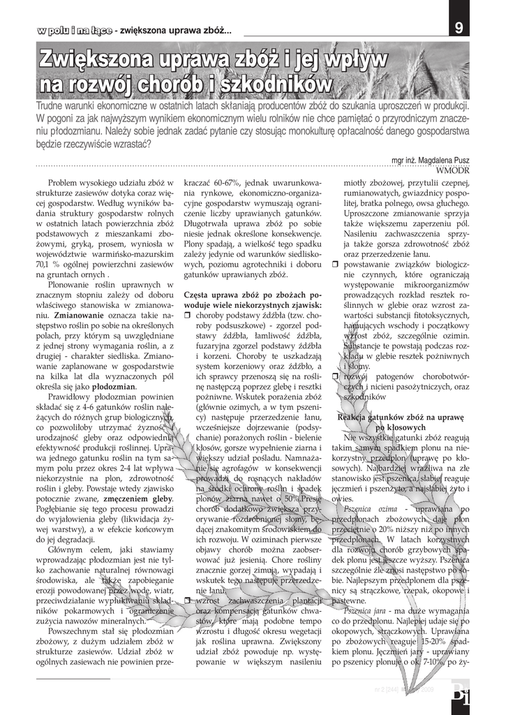 9 w polu i na łące - zwiększona uprawa zbóż... Zwiększona uprawa zbóż i jej wpływ na rozwój chorób i szkodników Trudne warunki ekonomiczne w ostatnich latach sk³aniaj¹ producentów zbó¿ do szukania uproszczeñ w produkcji. W pogoni za jak najwy¿szym wynikiem ekonomicznym wielu rolników nie chce pamiêtaæ o przyrodniczym znaczeniu p³odozmianu. Nale¿y sobie jednak zadaæ pytanie czy stosuj¹c monokulturê op³acalnoœæ danego gospodarstwa bêdzie rzeczywiœcie wzrastaæ? Problem wysokiego udzia³u zbó¿ w strukturze zasiewów dotyka coraz wiêcej gospodarstw. Wed³ug wyników badania struktury gospodarstw rolnych w ostatnich latach powierzchnia zbó¿ podstawowych z mieszankami zbo¿owymi, gryk¹, prosem, wynios³a w województwie warmiñsko-mazurskim 70,1 % ogólnej powierzchni zasiewów na gruntach ornych . Plonowanie roœlin uprawnych w znacznym stopniu zale¿y od doboru w³aœciwego stanowiska w zmianowaniu. Zmianowanie oznacza takie nastêpstwo roœlin po sobie na okreœlonych polach, przy którym s¹ uwzglêdniane z jednej strony wymagania roœlin, a z drugiej - charakter siedliska. Zmianowanie zaplanowane w gospodarstwie na kilka lat dla wyznaczonych pól okreœla siê jako p³odozmian. Prawid³owy p³odozmian powinien sk³adaæ siê z 4-6 gatunków roœlin nale¿¹cych do ró¿nych grup biologicznych, co pozwoli³oby utrzymaæ ¿yznoœæ i urodzajnoœæ gleby oraz odpowiedni¹ efektywnoœæ produkcji roœlinnej. Uprawa jednego gatunku roœlin na tym samym polu przez okres 2-4 lat wp³ywa niekorzystnie na plon, zdrowotnoœæ roœlin i gleby. Powstaje wtedy zjawisko potocznie zwane, zmêczeniem gleby. Pog³êbianie siê tego procesu prowadzi do wyja³owienia gleby (likwidacja ¿ywej warstwy), a w efekcie koñcowym do jej degradacji. G³ównym celem, jaki stawiamy wprowadzaj¹c p³odozmian jest nie tylko zachowanie naturalnej równowagi œrodowiska, ale tak¿e zapobieganie erozji powodowanej przez wodê, wiatr, przeciwdzia³anie wyp³ukiwaniu sk³adników pokarmowych i ograniczenie zu¿ycia nawozów mineralnych. Powszechnym sta³ siê p³odozmian zbo¿owy, z du¿ym udzia³em zbó¿ w strukturze zasiewów. Udzia³ zbó¿ w ogólnych zasiewach nie powinien prze- kraczaæ 60-67%, jednak uwarunkowania rynkowe, ekonomiczno-organizacyjne gospodarstw wymuszaj¹ ograniczenie liczby uprawianych gatunków. D³ugotrwa³a uprawa zbó¿ po sobie niesie jednak okreœlone konsekwencje. Plony spadaj¹, a wielkoœæ tego spadku zale¿y jedynie od warunków siedliskowych, poziomu agrotechniki i doboru gatunków uprawianych zbó¿. Czêsta uprawa zbó¿ po zbo¿ach powoduje wiele niekorzystnych zjawisk: choroby podstawy źdźb³a (tzw. choroby podsuszkowe) - zgorzel podstawy źdźb³a, ³amliwoœæ źdźb³a, fuzaryjna zgorzel podstawy źdźb³a i korzeni. Choroby te uszkadzaj¹ system korzeniowy oraz źdźb³o, a ich sprawcy przenosz¹ siê na roœlinê nastêpcz¹ poprzez glebê i resztki po¿niwne. Wskutek pora¿enia zbó¿ (g³ównie ozimych, a w tym pszenicy) nastêpuje przerzedzenie ³anu, wczeœniejsze dojrzewanie (podsychanie) pora¿onych roœlin - bielenie k³osów, gorsze wype³nienie ziarna i wiêkszy udzia³ poœladu. Namna¿anie siê agrofagów w konsekwencji prowadzi do rosn¹cych nak³adów na œrodki ochrony roœlin i spadek plonów ziarna nawet o 50%.Presjê chorób dodatkowo zwiêksza przyorywanie rozdrobnionej s³omy, bêd¹cej znakomitym œrodowiskiem do ich rozwoju. W oziminach pierwsze objawy chorób mo¿na zaobserwowaæ ju¿ jesieni¹. Chore roœliny znacznie gorzej zimuj¹, wypadaj¹ i wskutek tego nastêpuje przerzedzenie ³anu. wzrost zachwaszczenia plantacji oraz kompensacj¹ gatunków chwastów, które maj¹ podobne tempo wzrostu i d³ugoœæ okresu wegetacji jak roœlina uprawna. Zwiêkszony udzia³ zbó¿ powoduje np. wystêpowanie w wiêkszym nasileniu mgr in¿. Magdalena Pusz WMODR miot³y zbo¿owej, przytulii czepnej, rumianowatych, gwiazdnicy pospolitej, bratka polnego, owsa g³uchego. Uproszczone zmianowanie sprzyja tak¿e wiêkszemu zaperzeniu pól. Nasileniu zachwaszczenia sprzyja tak¿e gorsza zdrowotnoœæ zbó¿ oraz przerzedzenie ³anu. powstawanie zwi¹zków biologicznie czynnych, które ograniczaj¹ wystêpowanie mikroorganizmów prowadz¹cych rozk³ad resztek roœlinnych w glebie oraz wzrost zawartoœci substancji fitotoksycznych, hamuj¹cych wschody i pocz¹tkowy wzrost zbó¿, szczególnie ozimin. Substancje te powstaj¹ podczas rozk³adu w glebie resztek po¿niwnych i s³omy. rozwój patogenów chorobotwórczych i nicieni paso¿ytniczych, oraz szkodników Reakcja gatunków zbó¿ na uprawê po k³osowych Nie wszystkie gatunki zbó¿ reaguj¹ takim samym spadkiem plonu na niekorzystny przedplon (uprawê po k³osowych). Najbardziej wra¿liwa na z³e stanowisko jest pszenica, s³abiej reaguje jêczmieñ i pszen¿yto, a najs³abiej ¿yto i owies. Pszenica ozima - uprawiana po przedplonach zbo¿owych daje plon przeciêtnie o 20% ni¿szy ni¿ po innych przedplonach. W latach korzystnych dla rozwoju chorób grzybowych spadek plonu jest jeszcze wy¿szy. Pszenica szczególnie źle znosi nastêpstwo po sobie. Najlepszym przedplonem dla pszenicy s¹ str¹czkowe, rzepak, okopowe i pastewne. Pszenica jara - ma du¿e wymagania co do przedplonu. Najlepiej udaje siê po okopowych, str¹czkowych. Uprawiana po zbo¿owych reaguje 15-20% spadkiem plonu. Jêczmieñ jary - uprawiany po pszenicy plonuje o ok. 7-10%, po ¿ynr 2 [244] Luty 2009 10 w polu i na łące - zwiększona uprawa zbóż.... cie 10-13%, a bezpoœrednio po sobie nawet ponad 15% mniej po roœlinach niezbo¿owych. Obni¿ka plonu jêczmienia na glebach dobrych jest mniejsza ni¿ na glebach s³abszych. Jêczmieñ ozimy - gatunek ten uprawiany na glebach dobrych po pszenicy plonuje o ok. 8-12% ni¿ej ni¿ po roœlinach niezbo¿owych. Najlepiej plonuje po rzepaku, grochu, wczesnych ziemniakach, owsie, ale z regu³y stanowiska te przeznacza siê pod pszenicê ozim¹. Pszen¿yto ozime - po przed
