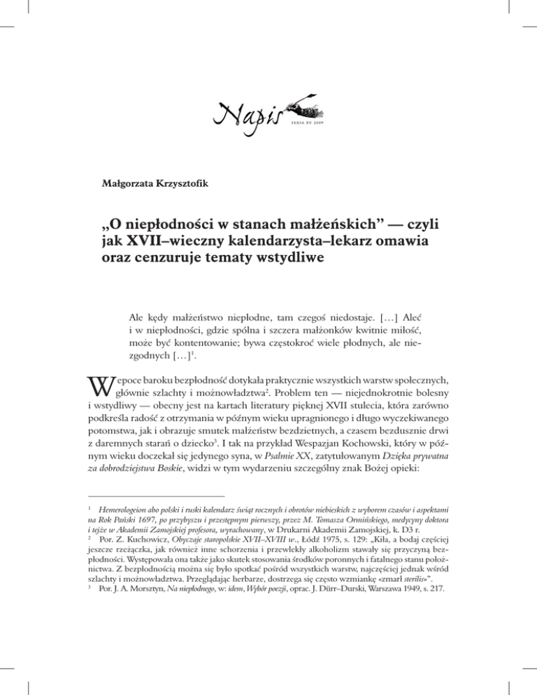 „O niepłodności w stanach małżeńskich”… Małgorzata Krzysztofik „O niepłodności w stanach małżeńskich” — czyli jak XVII–wieczny kalendarzysta–lekarz omawia oraz cenzuruje tematy wstydliwe Ale kędy małżeństwo niepłodne, tam czegoś niedostaje. […] Aleć i w niepłodności, gdzie spólna i szczera małżonków kwitnie miłość, może być kontentowanie; bywa częstokroć wiele płodnych, ale niezgodnych […]1. W epoce baroku bezpłodność dotykała praktycznie wszystkich warstw społecznych, głównie szlachty i możnowładztwa2. Problem ten — niejednokrotnie bolesny i wstydliwy — obecny jest na kartach literatury pięknej XVII stulecia, która zarówno podkreśla radość z otrzymania w późnym wieku upragnionego i długo wyczekiwanego potomstwa, jak i obrazuje smutek małżeństw bezdzietnych, a czasem bezdusznie drwi z daremnych starań o dziecko3. I tak na przykład Wespazjan Kochowski, który w późnym wieku doczekał się jedynego syna, w Psalmie XX, zatytułowanym Dzięka prywatna za dobrodziejstwa Boskie, widzi w tym wydarzeniu szczególny znak Bożej opieki: Hemerologeion abo polski i ruski kalendarz świąt rocznych i obrotów niebieskich z wyborem czasów i aspektami na Rok Pański 1697, po przybyszu i przestępnym pierwszy, przez M. Tomasza Ormińskiego, medycyny doktora i tejże w Akademii Zamojskiej profesora, wyrachowany, w Drukarni Akademii Zamojskiej, k. D3 r. 2 Por. Z. Kuchowicz, Obyczaje staropolskie XVII–XVIII w., Łódź 1975, s. 129: „Kiła, a bodaj częściej jeszcze rzeżączka, jak również inne schorzenia i przewlekły alkoholizm stawały się przyczyną bezpłodności. Występowała ona także jako skutek stosowania środków poronnych i fatalnego stanu położnictwa. Z bezpłodnością można się było spotkać pośród wszystkich warstw, najczęściej jednak wśród szlachty i możnowładztwa. Przeglądając herbarze, dostrzega się często wzmiankę «zmarł sterilis»”. 3 Por. J. A. Morsztyn, Na niepłodnego, w: idem, Wybór poezji, oprac. J. Dürr–Durski, Warszawa 1949, s. 217. 1 34 Małgorzata Krzysztofik Kiedy chce Pan, znosi z bezpotomnego sromotę niepłodności […] Choć utrapi ekspektatywą długo czekanego płodu: ale litując nagrodzi błogosławieństwem, że powiwszy syna, rośmieje się Sara w starości. Czego i ja doznawszy, za ten kawałek pociechy dziękuję–ć, Boże mój: i upadszy, sercem uniżonym wielbię Imię Twoje Święte4. Przywołanie tu żony Abrahama, cieszącej się macierzyństwem w starości, stanowi charakterystyczny przykład biblijnego uniwersalizmu w sposobie rozumienia rzeczywistości ziemskiej przez Kochowskiego — w Starym Testamencie niepłodność traktowana jest jako brak Bożego błogosławieństwa, trudne życiowe doświadczenie (por. Rdz 16, 1–6; Rdz 30, 1–13; 1 Sm 1, 4–11), kara Boska (por. Rdz 20, 18) i hańba (por. Rdz 16, 2). Posiadanie licznego potomstwa natomiast to wyraz wyjątkowej łaski Boga (por. Rdz 15, 5; Rdz 22, 17; Rdz 25, 21; Rdz 26, 3–4; Prz 17, 6; Ps 127, 3–5; Ps 128, 3)5. W zgoła odmienny sposób problem swojej niepłodności tłumaczy Jan Chryzostom Pasek, który w roku 1667 w Pamiętnikach notuje: miałem nadzieję, że też jeszcze i dla mnie P. Bóg da jakie chłopczysko; jakoż i byłoby było, gdyby była nie ludzka złość. Bo uczyniono jej (taka była fama), żeby więcej nie miała potomstwa; znajdowaliśmy w łóżku różne rzeczy i ja sam znalazłem spróchniałych sztuk kilka z trumny6. Autor, przedstawiciel mazowieckiej szlachty, jest przede wszystkim zabobonny i skłonny dawać wiarę pogłoskom: uznał, że to podrzucane do małżeńskiego łoża przez nieżyczliwych ludzi drzazgi z trumny spowodowały brak potomstwa, nie przypisywał natomiast w swej naiwności żadnego znaczenia faktowi, że ożenił się z kobietą już starą, bo 46–letnią, o której myślał, że ma najwyżej lat trzydzieści7. Zaprezentowane tu dwa sposoby rozumienia w XVII stuleciu zagadnienia niepłodności — biblijny Kochowskiego i zabobonny Paska, świadczą o mentalności popularnej tamtych czasów; natomiast obszar refleksji naukowej prezentuje zamieszczona w kalendarzu na rok 1686 rozprawa Stanisława Słowakowica O niepłodności w stanach małżeńskich (drugi tytuł na górnym marginesie: O przypadkach białogłowskich), napisana przez profesora akademickiego, a zarazem lekarza posiadającego padewski dyplom 4 Psalm XX (zatytułowany: Dzięka prywatna za dobrodziejstwa Boskie) z Psalmodii polskiej, cyt. za: W. Kochowski, Utwory poetyckie: wybór, oprac. M. Eustachiewicz, Wrocław 1991 (BN I 92), s. 417. 5 Na temat zagadnienia niepłodności w Biblii por. Słownik symboliki biblijnej. Obrazy, symbole, motywy, metafory, figury stylistyczne i gatunki literackie w Piśmie Świętym, L. Ryken, T. Longman III, tłum. Z. Kościuk, red. ks. W. Chrostowski, Warszawa 2004, s. 584–585. 6 J. Ch. Pasek, Pamiętniki, oprac. W. Czapliński, Wrocław 1968 (BN I 62), s. 406–407. 7 Por. ibidem, s. 406. „O niepłodności w stanach małżeńskich”… 35 doktora medycyny8. Próba oceny sensowności rozprawy Słowakowica z punktu widzenia dzisiejszej wiedzy naukowej to zagadnienie dla historyków medycyny; natomiast ośmieszanie bądź krytykowanie niejednokrotnie kuriozalnych zaleceń i przekonań nie prowadzi do żadnych praktycznych wniosków. Ich analiza jest dla badacza literatury bardzo istotna z innego względu — mianowicie są wyjątkowo cennym świadectwem mentalności swoich czasów, niejednokrotnie ułatwiającym zrozumienie pozamedycznych aspektów kultury i literatury. Już na początku wypowiedzi kalendarzysta zaznacza, że zagadnienie jest wstydliwe, delikatne i przez niektórych czytelników może być postrzegane jako wręcz nieprzyzwoite. Zadanie ma trudne, ponieważ nie chce nikogo urazić, o najbardziej intymnych sprawach postanawia więc pisać po łacinie, co tłumaczy w następujący sposób: Insuetudo, seu pruritus