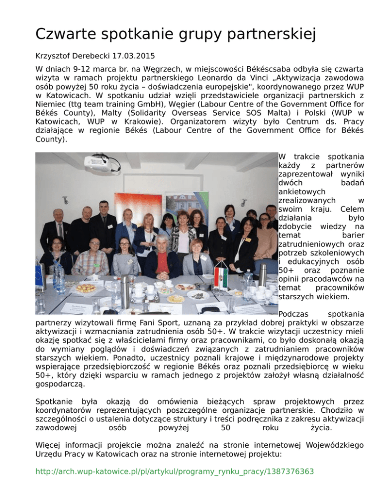 Czwarte spotkanie grupy partnerskiej Krzysztof Derebecki 17.03.2015 W dniach 9-12 marca br. na Węgrzech, w miejscowości Békéscsaba odbyła się czwarta wizyta w ramach projektu partnerskiego Leonardo da Vinci „Aktywizacja zawodowa osób powyżej 50 roku życia – doświadczenia europejskie", koordynowanego przez WUP w Katowicach. W spotkaniu udział wzięli przedstawiciele organizacji partnerskich z Niemiec (ttg team training GmbH), Węgier (Labour Centre of the Government Office for Békés County), Malty (Solidarity Overseas Service SOS Malta) i Polski (WUP w Katowicach, WUP w Krakowie). Organizatorem wizyty było Centrum ds. Pracy działające w regionie Békés (Labour Centre of the Government Office for Békés County). W trakcie spotkania każdy z partnerów zaprezentował wyniki dwóch badań ankietowych zrealizowanych w swoim kraju. Celem działania było zdobycie wiedzy na temat barier zatrudnieniowych oraz potrzeb szkoleniowych i edukacyjnych osób 50+ oraz poznanie opinii pracodawców na temat pracowników starszych wiekiem. Podczas spotkania partnerzy wizytowali firmę Fani Sport, uznaną za przykład dobrej praktyki w obszarze aktywizacji i wzmacniania zatrudnienia osób 50+. W trakcie wizytacji uczestnicy mieli okazję spotkać się z właścicielami firmy oraz pracownikami, co było doskonałą okazją do wymiany poglądów i doświadczeń związanych z zatrudnianiem pracowników starszych wiekiem. Ponadto, uczestnicy poznali krajowe i międzynarodowe projekty wspierające przedsiębiorczość w regionie Békés oraz poznali przedsiębiorcę w wieku 50+, który dzięki wsparciu w ramach jednego z projektów założył własną działalność gospodarczą. Spotkanie była okazją do omówienia bieżących spraw projektowych przez koordynatorów reprezentujących poszczególne organizacje partnerskie. Chodziło w szczególności o ustalenia dotyczące struktury i treści podręcznika z zakresu aktywizacji zawodowej osób powyżej 50 roku życia. Więcej informacji projekcie można znaleźć na stronie internetowej Wojewódzkiego Urzędu Pracy w Katowicach oraz na stronie internetowej projektu: http://arch.wup-katowice.pl/pl/artykul/programy_rynku_pracy/1387376363 http://www.activation50plus.eu/