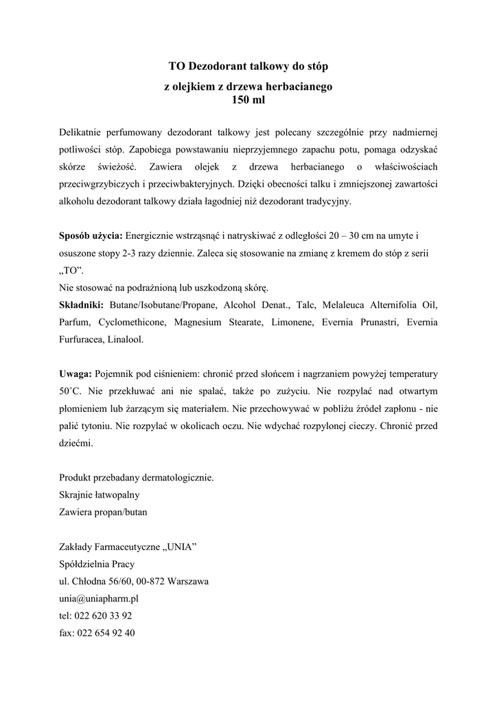 TO Dezodorant talkowy do stóp z olejkiem z drzewa herbacianego 150 ml Delikatnie perfumowany dezodorant talkowy jest polecany szczególnie przy nadmiernej potliwości stóp. Zapobiega powstawaniu nieprzyjemnego zapachu potu, pomaga odzyskać skórze świeŜość. Zawiera olejek z drzewa herbacianego o właściwościach przeciwgrzybiczych i przeciwbakteryjnych. Dzięki obecności talku i zmniejszonej zawartości alkoholu dezodorant talkowy działa łagodniej niŜ dezodorant tradycyjny. Sposób uŜycia: Energicznie wstrząsnąć i natryskiwać z odległości 20 – 30 cm na umyte i osuszone stopy 2-3 razy dziennie. Zaleca się stosowanie na zmianę z kremem do stóp z serii „TO”. Nie stosować na podraŜnioną lub uszkodzoną skórę. Składniki: Butane/Isobutane/Propane, Alcohol Denat., Talc, Melaleuca Alternifolia Oil, Parfum, Cyclomethicone, Magnesium Stearate, Limonene, Evernia Prunastri, Evernia Furfuracea, Linalool. Uwaga: Pojemnik pod ciśnieniem: chronić przed słońcem i nagrzaniem powyŜej temperatury 50˚C. Nie przekłuwać ani nie spalać, takŜe po zuŜyciu. Nie rozpylać nad otwartym płomieniem lub Ŝarzącym się materiałem. Nie przechowywać w pobliŜu źródeł zapłonu - nie palić tytoniu. Nie rozpylać w okolicach oczu. Nie wdychać rozpylonej cieczy. Chronić przed dziećmi. Produkt przebadany dermatologicznie. Skrajnie łatwopalny Zawiera propan/butan Zakłady Farmaceutyczne „UNIA” Spółdzielnia Pracy ul. Chłodna 56/60, 00-872 Warszawa [email protected] tel: 022 620 33 92 fax: 022 654 92 40