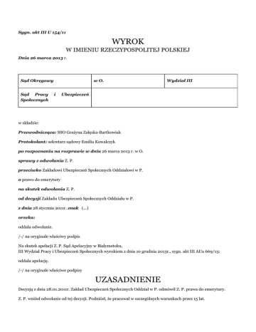 Sygn. akt III U 154/11 WYROK W IMIENIU RZECZYPOSPOLITEJ POLSKIEJ Dnia 26 marca 2013 r. Sąd Okręgowy Sąd Pracy Społecznych w O. i Wydział III Ubezpieczeń w składzie: Przewodnicząca: SSO Grażyna Załęska-Bartkowiak Protokolant: sekretarz sądowy Emilia Kowalczyk po rozpoznaniu na rozprawie w dniu 26 marca 2013 r. w O. sprawy z odwołania Z. P. przeciwko Zakładowi Ubezpieczeń Społecznych Oddziałowi w P. o prawo do emerytury na skutek odwołania Z. P. od decyzji Zakładu Ubezpieczeń Społecznych Oddziału w P. z dnia 28 stycznia 2011r. znak (...) orzeka: oddala odwołanie. /-/ na oryginale właściwy podpis Na skutek apelacji Z. P. Sąd Apelacyjny w Białymstoku, III Wydział Pracy i Ubezpieczeń Społecznych wyrokiem z dnia 10 grudnia 2013r., sygn. akt III AUa 669/13: oddala apelację. /-/ na oryginale właściwe podpisy UZASADNIENIE Decyzją z dnia 28.01.2011r. Zakład Ubezpieczeń Społecznych Oddział w P. odmówił Z. P. prawa do emerytury. Z. P. wniósł odwołanie od tej decyzji. Podniósł, że pracował w szczególnych warunkach przez 15 lat. W odpowiedzi na odwołanie organ rentowy wniósł o jego oddalenie. Wskazał, że Z. P. nie spełnia warunków do przyznania wcześniejszej emerytury, o których mowa w art.184 ustawy z dnia 17.12.1998r. o emeryturach i rentach z Funduszu Ubezpieczeń Społecznych, gdyż pomimo osiągnięcia wymaganego wieku emerytalnego 60 lat i legitymowania się 25-letnim ogólnym stażem pracy, nie posiada wymaganego 15-letniego okresu pracy w szczególnych warunkach. Sąd ustalił i zważył, co następuje: w dniu 29.10.2010r. Z. P. złożył w Oddziale ZUS wniosek o emeryturę z tytułu pracy w warunkach szczególnych. ZUS dokonał analizy stażu pracy Z. P. i uznał, że na dzień 01.01.1999r. wykazał on 31 lat, 5 miesięcy i 23 dni okresów składkowych i nieskładkowych. Natomiast ZUS nie uznał Z. P. żadnego okresu jako pracy świadczonej w szczególnych warunkach. Z. P. urodził się dnia (...) Zatem podstawą ubiegania się przez niego o prawo do emerytury jest art.184 ustawy o emeryturach i rentach z Funduszu Ubezpieczeń Społecznych w zw. z §4 rozporządzenia Rady Ministrów z dnia 07.02.1983r. w sprawie wieku emerytalnego pracowników zatrudnionych w szczególnych warunkach lub w szczególnym charakterze (Dz. U. Nr 8, poz. 43 z późn. zm.). Zgodnie z tymi przepisami w brzmieniu obowiązującym w dniu wydania zaskarżonej decyzji - prawo do emerytury przysługuje ubezpieczonemu urodzonemu po 31.12.1948r., jeżeli: - osiągnął wiek emerytalny wynoszący 60 lat dla mężczyzn, - nie przystąpił do otwartego funduszu emerytalnego lub złożył wniosek o przekazanie środków zgromadzonych na rachunku w OFE, za pośrednictwem Zakładu na dochody budżetu państwa, - rozwiązał stosunek pracy, w przypadku ubezpieczonego będącego pracownikiem, - w dniu 01.01.1999r. udowodnił 25-letni okres składkowy i nieskładkowy, w tym co najmniej 15 lat pracy w szczególnych warunkach. W niniejszej sprawie spór pomiędzy stronami sprowadzał się do kwestii, czy Z. P. na dzień 01.01.1999r. zgromadził 15 lat pracy w szczególnych warunkach. W niniejszym postępowaniu odwołujący wykazywał, że pracował w szczególnych warunkach w okresie od dnia 01.09.1977r. do dnia 27.10.1994r., gdy był zatrudniony w Fabryce (...) S.A. Na okoliczność tej pracy odwołujący złożył do ZUS świadectwo wykonywania pracy w szczególnych warunkach z dnia 27.10.2010r., z którego wynika, że w w/w okresie pracował stale i w pełnym wymiarze czasu pracy na stanowisku wymienionym w wykazie A dziale XIV poz.24, a stanowiskami, przy których Z. P. pełnił nadzór inżynieryjnotechniczny był: szlifierz, krajacz metali tarczą ścierną (stanowiska wymienione w wykazie A, dziale III poz.78), oczyszczacz mechaniczny (wykaz A, dział III, poz.80) i hartownik (wykaz A, dział III, poz.67) – k.9 a.e. Natomiast z dodatkowych wyjaśnień zakładu pracy z dnia 20.12.2010r. wynikało, że odwołujący był w tym okresie mistrzem, a następnie mistrzem w wydziale zaplecza technicznego. ZUS nie uznał tego okresu, gdyż stwierdził, że do obowiązków odwołującego należały również czynności administracyjno-biurowe, co powodowało przebywanie z dala od stanowisk, na których była wykonywana praca w szczególnych warunkach. Na okoliczność charakteru pracy odwołującego w spornym okresie Sąd dysponował dowodami w postaci dokumentów znajdujących się w aktach osobowych Z. P. (dokumenty przy piśmie k.11), zeznaniami świadków oraz odwołującego oraz trzema opiniami sporządzonymi przez biegłych z zakresu bhp. Z zeznań odwołującego wynika, że został przyjęty do (...) w 1977r. na stanowisko tokarza. Następnie został mistrzem na Wydziale Produkcji Narzędzi, była to obróbka mechaniczna. Jego stanowisko pracy było na hali produkcyjnej, na której znajdowały się takie maszyny jak: szlifierki, piece hartownicze, maszyny do cięcia metalu tarczą ścierną, elektrodrążarki, były także frezarki i tokarki. Z zeznań odwołującego wynika, że sprawował nadzór nad szlifierkami, piecami hartowniczymi i drążarkami. Do jego obowiązków należało pokazanie dokumentacji technicznej przy maszynie, aby wskazać jak poustawiać tę maszynę. Zeznał, że niekiedy musiał sam stanąć przy maszynie, aby pokazać jak wykonywać niektóre prace. Jako mistrz miał swoje miejsce na hali. Jego szafka z dokumentami stała na hali obok maszyn. Nadto kontrolował jakość wykonania części, nadzorował produkcję: od cięcia tarczą ścierną materiału poprzez oczyszczenie lub piaskowanie tego materiału, zahartowanie aż do skończenia wyrobu. Jako prace biurowe, które musiał wykonywać, wskazał: wypełnianie kartotek behapowskich pracowników, sporządzanie list na dodatki szkodliwe dla pracowników, list na mleko dla pracowników pracujących w warunkach szkodliwych, sporządzanie miesięcznych sprawozdań, które dotyczyły tego, ile dany pr