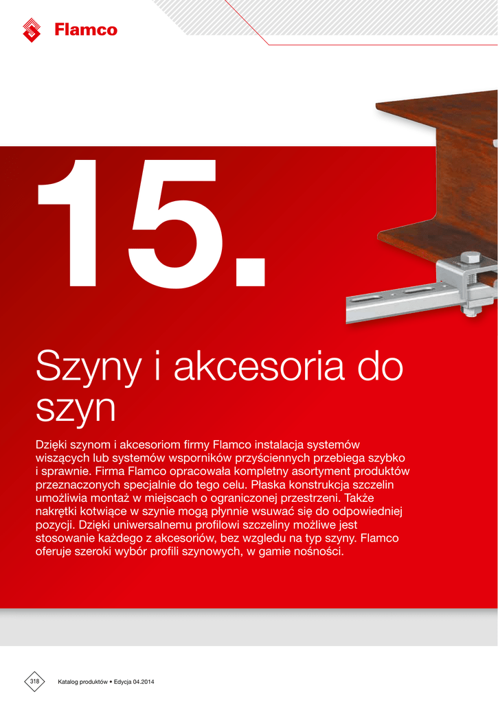 15. Szyny i akcesoria do szyn Dzięki szynom i akcesoriom firmy Flamco instalacja systemów wiszących lub systemów wsporników przyściennych przebiega szybko i sprawnie. Firma Flamco opracowała kompletny asortyment produktów przeznaczonych specjalnie do tego celu. Płaska konstrukcja szczelin umożliwia montaż w miejscach o ograniczonej przestrzeni. Także nakrętki kotwiące w szynie mogą płynnie wsuwać się do odpowiedniej pozycji. Dzięki uniwersalnemu profilowi szczeliny możliwe jest stosowanie każdego z akcesoriów, bez wzgledu na typ szyny. Flamco oferuje szeroki wybór profili szynowych, w gamie nośności. 318 Katalog produktów • Edycja 04.2014 15 Szyny i akcesoria do szyn Katalog produktów • Edycja 04.2014 319 SZYNA • Zastosowanie: do montażu jednego lub więcej zawieszeń. Wymiary szyn R Flamco D B T Ø5 H 10 H E E D B 30 20 S S R 0-2 / R 4-8 R3 Typ R0 R1 R2 R3 R4 R6 R7 R8 320 Katalog produktów • Edycja 04.2014 Wymiary H [mm] B [mm] 18 15 20 40 46 60 41 21 28 30,5 34 34 35 40 41 41 D [mm] 1,25 2 2,4 2,4 2,5 3 2 1,8 E [mm] S [mm] T [mm] 9 8 10,5 23 30 21 11 14 14,5 14,5 14,5 14,5 14,5 14,5 14,5 8,5 10,5 10,5 10,5 13,5 13,5 13,5 13,5 15 Szyny i akcesoria do szyn Szyna montażowa R • Materiał: stal, ST 02 Z 275 NA. • Zalecane do współpracy z innym osprzętem montażowym. Typ R 1 Ocynkowane ogniowo * R 1 Ocynkowane ogniowo * R 2 Ocynkowane ogniowo * R 8 Ocynkowane ogniowo R 8 Ocynkowane ogniowo R 4 Ocynkowane ogniowo R 4 Ocynkowane ogniowo R 6 Ocynkowane ogniowo R 7 Ocynkowane ogniowo * R 7 Ocynkowane ogniowo * R 2 Stal czarna * R 2 Ocynkowane ogniowo * L [m] Ø [cm2] 3 2 2 2 3 3 2 2 2 3 2 3 1,09 1,09 1,45 1,50 1,50 2,92 2,92 4,57 2,46 2,46 1,45 1,45 Obciążenie punktowe Maks. Obciążenie obciążenie zrywające [N] [N] 2000 2000 2500 1480 1480 2500 2500 3000 2000 2000 2500 2500 6000 6000 7500 4450 4450 7500 7500 9000 6000 6000 7500 7500 Mb [Ncm] ** Ix [cm4] Wx Waga [cm3] [kg/m] 6300 6300 10750 14400 14400 47700 47700 98300 41700 41700 10750 10750 0,315 0,315 0,705 0,957 0,957 6,914 6,914 18,548 5,381 5,381 0,705 0,705 0,394 0,394 0,672 0,9 0,9 2,981 2,981 6,144 2,606 2,606 0,672 0,672 0,85 0,85 1,27 1,32 1,32 2,35 2,35 3,6 1,98 1,98 1,27 1,27 Numer katalogowy 780 m 520 m 440 m 304 m 456 m 480 m 352 m 208 m 456 m 684 m 440 m 660 m 50310 50010 50011 50218 50318 50313 50013 50017 50029 50019 50001 50311 * Dostępne w każdej wymaganej długości aż do 6 metrów ** Maksymalny moment zginający SZYNA MONTAŻOWA - WYPEŁNIONA R1i Szyna montażowa wypełniona/ kotwa • Czarne wykończenie szyny • Polistyrenowa listwa wypełniająca szynę, zabezpieczająca przed wprowadzeniem do jej wnętrza wylewanego betonu. Listwa wypełniająca łatwo usuwana po betonowaniu. • Kotwa Ai do betonowania listwy R1i • Śruba M 5 i podkładka kotwy cynkowane elektrolitycznie G H F E D B M5 S Typ R1i Ai Katalog produktów • Edycja 04.2014 Wymiary D [mm] B [mm] H [mm] E [mm] S [mm] L. [m] F [mm] G [mm] 2 - 30 - 17 - 7 - 14,5 - 2 - 75 85 Numer katalogowy 10 10 50003 50101 321 ZAKOŃCZENIA SZYN H RD Zakończenia szyn A Typ RD 1 RD 2 RD 4 RD 6 RD 7 RD 8 322 Katalog produktów • Edycja 04.2014 D Dla szyny R1 R 2/3 R4 R6 R7 R8 B Wymiary A [mm] B [mm] D [mm] H [mm] 12 12 14 14 14 14 15 20 35 41 40 30 5 5 5 5 5 5 30 35 46 60 40 40 Numer katalogowy 100 100 100 100 100 100 50501 50502 50504 50506 50507 50508 15 Szyny i akcesoria do szyn PODKŁADKI Podkładka S S S..SR S..s B A C Typ Przyłącze A S 8 S 10 S 12 S 16 S 20 S 6s S 8s S 10s S 6 SR S 8 SR S 10 SR S 12 SR S 16 SR Wymiary M 8 M 10 M 12 M 16 M 20 M 6 M 8 M 10 M 6 M 8 M 10 M 12 M 16 B [mm] C [mm] 18 22 28 33 40 25 28 28 40 40 40 40 40 1,5 1,5 2,0 2,0 2,5 2,0 2,0 2,0 3,0 3,5 3,5 5,0 6,5 Numer katalogowy 250 250 1000 250 250 1000 1000 1000 25 25 25 25 25 70802 70803 70804 70805 70806 70811 70812 70813 70831 70832 70833 70834 70835 NAKRĘTKI Nakrętka M Typ M 10 M 12 M 16 M 20 Rozmiar klucza [SW] Przyłącze Wysokość [mm] 17 19 24 30 M 10 M 12 M 16 M 20 Rozmiar klucza [SW] Przyłącze Wysokość [mm] 13 17 M 8 M 10 3 4 8 10 13 16 Numer katalogowy 1000 500 250 100 70203 70204 70205 70206 Nakrętka M..h Typ M 8h M 10h Katalog produktów • Edycja 04.2014 Numer katalogowy 1000 1000 70102 70103 323