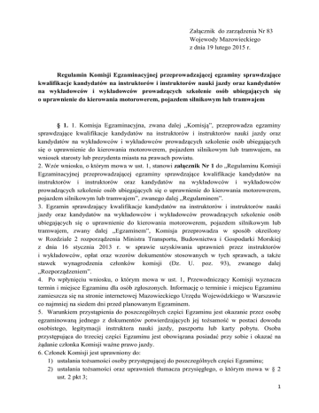 Załącznik do zarządzenia Nr 83 Wojewody Mazowieckiego z dnia 19 lutego 2015 r. Regulamin Komisji Egzaminacyjnej przeprowadzającej egzaminy sprawdzające kwalifikacje kandydatów na instruktorów i instruktorów nauki jazdy oraz kandydatów na wykładowców i wykładowców prowadzących szkolenie osób ubiegających się o uprawnienie do kierowania motorowerem, pojazdem silnikowym lub tramwajem § 1. 1. Komisja Egzaminacyjna, zwana dalej „Komisją”, przeprowadza egzaminy sprawdzające kwalifikacje kandydatów na instruktorów i instruktorów nauki jazdy oraz kandydatów na wykładowców i wykładowców prowadzących szkolenie osób ubiegających się o uprawnienie do kierowania motorowerem, pojazdem silnikowym lub tramwajem, na wniosek starosty lub prezydenta miasta na prawach powiatu. 2. Wzór wniosku, o którym mowa w ust. 1, stanowi załącznik Nr 1 do „Regulaminu Komisji Egzaminacyjnej przeprowadzającej egzaminy sprawdzające kwalifikacje kandydatów na instruktorów i instruktorów oraz kandydatów na wykładowców i wykładowców prowadzących szkolenie osób ubiegających się o uprawnienie do kierowania motorowerem, pojazdem silnikowym lub tramwajem”, zwanego dalej „Regulaminem”. 3. Egzamin sprawdzający kwalifikacje kandydatów na instruktorów i instruktorów nauki jazdy oraz kandydatów na wykładowców i wykładowców prowadzących szkolenie osób ubiegających się o uprawnienie do kierowania motorowerem, pojazdem silnikowym lub tramwajem, zwany dalej „Egzaminem”, Komisja przeprowadza w sposób określony w Rozdziale 2 rozporządzenia Ministra Transportu, Budownictwa i Gospodarki Morskiej z dnia 16 stycznia 2013 r. w sprawie uzyskiwania uprawnień przez instruktorów i wykładowców, opłat oraz wzorów dokumentów stosowanych w tych sprawach, a także stawek wynagrodzenia członków komisji (Dz. U. poz. 93), zwanego dalej „Rozporządzeniem”. 4. Po wpłynięciu wniosku, o którym mowa w ust. 1, Przewodniczący Komisji wyznacza termin i miejsce Egzaminu dla osób zgłoszonych. Informację o terminie i miejscu Egzaminu zamieszcza się na stronie internetowej Mazowieckiego Urzędu Wojewódzkiego w Warszawie co najmniej na siedem dni przed planowanym Egzaminem. 5. Warunkiem przystąpienia do poszczególnych części Egzaminu jest okazanie przez osobę egzaminowaną jednego z dokumentów potwierdzających jej tożsamość w postaci dowodu osobistego, legitymacji instruktora nauki jazdy, paszportu lub karty pobytu. Osoba przystępująca do trzeciej części Egzaminu jest obowiązana posiadać przy sobie i okazać na żądanie członka Komisji ważne prawo jazdy. 6. Członek Komisji jest uprawniony do: 1) ustalania tożsamości osoby przystępującej do poszczególnych części Egzaminu; 2) ustalania tożsamości oraz uprawnień tłumacza przysięgłego, o którym mowa w § 2 ust. 2 pkt 3; 1 3) sprawdzania czy kandydat na instruktora lub instruktor nauki jazdy przystępujący do trzeciej części Egzaminu posiada ważne prawo jazdy odpowiedniej kategorii. 7. Przewodniczy Komisji, w razie gdy zachodzi uzasadnione przypuszczenie, że osoba egzaminowana znajduje się w stanie nietrzeźwości lub w stanie po użyciu alkoholu lub środka działającego podobnie do alkoholu, wzywa organy uprawnione do przeprowadzania badania osoby egzaminowanej w celu ustalenia zawartości alkoholu lub środka działającego podobnie do alkoholu w jej organizmie. 8. Komisja nie dopuszcza osoby do Egzaminu, jeżeli: 1) nie jest możliwe ustalenie tożsamości osoby zgłaszającej się na Egzamin; 2) nie jest możliwe ustalenie tożsamości oraz uprawnień tłumacza przysięgłego; 3) osoba zgłaszająca się na Egzamin: a) nie okazała ważnego prawa jazdy odpowiedniej kategorii, w przypadku, o którym mowa w ust. 6 pkt 3, b) odmówiła poddania się badaniu, o którym mowa w ust. 7, c) zaproponowała członkowi Komisji przyjęcie korzyści majątkowej lub osobistej w zamian za uzyskanie pozytywnego wyniku Egzaminu. 9. Przyczynę niedopuszczenia osoby do Egzaminu Przewodniczący Komisji umieszcza w protokole egzaminacyjnym, którego wzór określa załącznik Nr 2 do Regulaminu. § 2. 1. Egzamin przeprowadza się: 1) zgodnie z Rozporządzeniem oraz trybem określonym w Regulaminie; 2) w Mazowieckim Urzędzie Wojewódzkim w Warszawie – część pierwszą i drugą Egzaminu dla kandydatów na instruktorów i instruktorów nauki jazdy oraz kandydatów na wykładowców i wykładowców prowadzących szkolenie osób ubiegających się o uprawnienie do kierowania motorowerem, pojazdem silnikowym lub tramwajem; 3) w Wojewódzkim Ośrodku Ruchu Drogowego – część pierwszą i drugą Egzaminu dla kandydatów na instruktorów i instruktorów nauki jazdy oraz kandydatów na wykładowców i wykładowców prowadzących szkolenie osób ubiegających się o uprawnienie do kierowania motorowerem, pojazdem silnikowym lub tramwajem; 4) w Wojewódzkim Ośrodku Ruchu Drogowego – część trzecią Egzaminu dla kandydatów na instruktorów i instruktorów prowadzących szkolenie osób ubiegających się o uprawnienie do kierowania motorowerem lub pojazdem silnikowym; 5) w Tramwajach Warszawskich Sp. z o. o - część pierwszą, drugą lub trzecią Egzaminu dla kandydatów na instruktorów i instruktorów nauki jazdy prowadzących szkolenie osób ubiegających się o uprawnienie do kierowania tramwajem. 2. W Egzaminie ma prawo uczestniczyć: 1) osoba sprawująca nadzór nad pracą Komisji w charakterze obserwatora; 2) osoba upoważniona przez Wojewodę Mazowieckiego w charakterze obserwatora; 2 3) tłumacz przysięgły, którego udział na własny koszt zapewnia sobie osoba egzaminowana, jeżeli nie włada językiem polskim w stopniu umożliwiającym odbycie Egzaminu. § 3. 1. Komisja przeprowadza Egzamin w składzie pięcioosobowym, z udziałem: 1) Przewodniczącego Komisji; 2) trzech członków Komisji; 3) Sekretarza Komisji. 2. Do obowiązków Przewodniczącego Komisji należy w szczególności: 