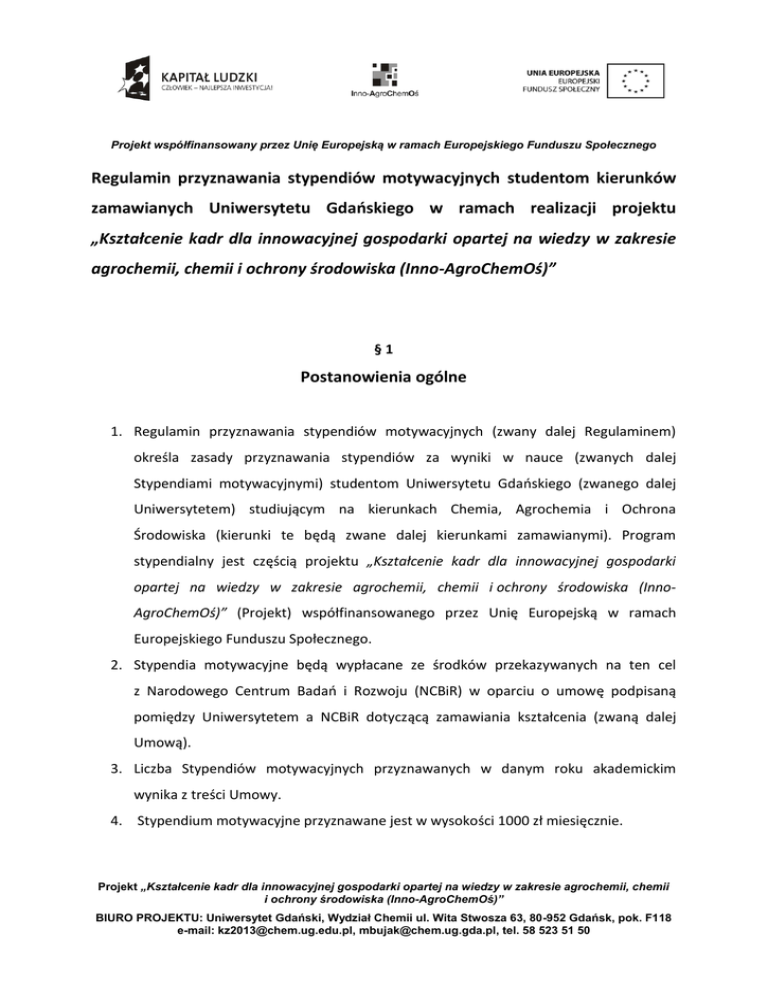 Projekt współfinansowany przez Unię Europejską w ramach Europejskiego Funduszu Społecznego Regulamin przyznawania stypendiów motywacyjnych studentom kierunków zamawianych Uniwersytetu Gdańskiego w ramach realizacji projektu „Kształcenie kadr dla innowacyjnej gospodarki opartej na wiedzy w zakresie agrochemii, chemii i ochrony środowiska (Inno-AgroChemOś)” §1 Postanowienia ogólne 1. Regulamin przyznawania stypendiów motywacyjnych (zwany dalej Regulaminem) określa zasady przyznawania stypendiów za wyniki w nauce (zwanych dalej Stypendiami motywacyjnymi) studentom Uniwersytetu Gdańskiego (zwanego dalej Uniwersytetem) studiującym na kierunkach Chemia, Agrochemia i Ochrona Środowiska (kierunki te będą zwane dalej kierunkami zamawianymi). Program stypendialny jest częścią projektu „Kształcenie kadr dla innowacyjnej gospodarki opartej na wiedzy w zakresie agrochemii, chemii i ochrony środowiska (InnoAgroChemOś)” (Projekt) współfinansowanego przez Unię Europejską w ramach Europejskiego Funduszu Społecznego. 2. Stypendia motywacyjne będą wypłacane ze środków przekazywanych na ten cel z Narodowego Centrum Badań i Rozwoju (NCBiR) w oparciu o umowę podpisaną pomiędzy Uniwersytetem a NCBiR dotyczącą zamawiania kształcenia (zwaną dalej Umową). 3. Liczba Stypendiów motywacyjnych przyznawanych w danym roku akademickim wynika z treści Umowy. 4. Stypendium motywacyjne przyznawane jest w wysokości 1000 zł miesięcznie. Projekt „Kształcenie kadr dla innowacyjnej gospodarki opartej na wiedzy w zakresie agrochemii, chemii i ochrony środowiska (Inno-AgroChemOś)” BIURO PROJEKTU: Uniwersytet Gdański, Wydział Chemii ul. Wita Stwosza 63, 80-952 Gdańsk, pok. F118 e-mail: [email protected], [email protected], tel. 58 523 51 50 Projekt współfinansowany przez Unię Europejską w ramach Europejskiego Funduszu Społecznego §2 Komisje stypendialne 1. Wnioski o przyznanie Stypendium motywacyjnego rozpatruje komisja (zwana dalej Komisją Stypendialną) powołana przez Dziekana Wydziału. 2. W skład Komisji Stypendialnej wchodzą: a) Prodziekan ds. Studiów Wydziału Chemii UG; b) Kierownik merytoryczny ds. realizacji zadania nr 1; c) Kierownik Projektu; d) Asystent Kierownika Projektu. §3 Zasady przyznawania Stypendiów motywacyjnych 1. Do ubiegania się o Stypendium motywacyjne uprawnione są jedynie osoby, które w roku akademickim 2012/2013 lub 2013/2014 podjęły studia stacjonarne po raz pierwszy w życiu. 2. W roku akademickim 2012/2013 stypendium motywacyjne mogą ubiegać się jedynie osoby przyjęte na pierwszy rok studiów stacjonarnych I stopnia kierunków zamawianych z rocznika A (przyjętych z rekrutacji z 2012 roku). 3. O przyznanie Stypendium nie mogą ubiegać się absolwenci innych kierunków studiów niestacjonarnych oraz studenci, którzy zaliczyli przynajmniej pierwszy rok studiów niestacjonarnych na dowolnym kierunku studiów. Projekt „Kształcenie kadr dla innowacyjnej gospodarki opartej na wiedzy w zakresie agrochemii, chemii i ochrony środowiska (Inno-AgroChemOś)” BIURO PROJEKTU: Uniwersytet Gdański, Wydział Chemii ul. Wita Stwosza 63, 80-952 Gdańsk, pok. F118 e-mail: [email protected], [email protected], tel. 58 523 51 50 Projekt współfinansowany przez Unię Europejską w ramach Europejskiego Funduszu Społecznego 4. W kolejnych latach o Stypendium motywacyjne mogą ubiegać się: a) w roku akademickim 2013/2014 – studenci drugiego roku studiów stacjonarnych I stopnia kierunku zamawianego z rocznika A (z rekrutacji w roku 2012) oraz studenci pierwszego roku studiów stacjonarnych I stopnia kierunku zamawianego z rocznika B (z rekrutacji w roku 2013) na okres 9 miesięcy; b) w roku akademickim 2014/2015– studenci drugiego roku studiów stacjonarnych I stopnia kierunku zamawianego z rocznika B (z rekrutacji w roku 2013) i trzeciego roku studiów stacjonarnych I stopnia kierunku zamawianego z rocznika A (z rekrutacji w roku 2012) na okres 9 miesięcy; c) w roku akademickim 2015 w miesiącach od września do grudnia - studenci trzeciego roku studiów stacjonarnych I stopnia kierunku zamawianego z rocznika B (z rekrutacji w roku 2013) na okres 4 miesięcy. 5. Warunkiem ubiegania się o Stypendium motywacyjne po pierwszym roku studiów oraz po drugim roku studiów jest zaliczenie odpowiednio pierwszego i drugiego roku studiów na kierunku zamawianym i uzyskanie wpisu na następny rok akademicki. 6. Student ubiega się o Stypendium motywacyjne poprzez złożenie w dziekanacie Wydziału Chemii odpowiedniego wniosku w terminie ogłoszonym na stronie www Projektu. 7. Komisja Stypendialna podejmuje decyzję o przyznaniu Stypendiów motywacyjnych w ciągu 10 dni od upływu ostatecznego terminu składania wniosków w danym roku akademickim na podstawie listy rankingowej osób ubiegających się o Stypendium motywacyjne. 8. Podstawą ustalenia listy rankingowej dla studentów pierwszego roku są wyniki uzyskane w procesie rekrutacji na pierwszy rok studiów. Rozpatrywane będą tylko te osoby które Projekt „Kształcenie kadr dla innowacyjnej gospodarki opartej na wiedzy w zakresie agrochemii, chemii i ochrony środowiska (Inno-AgroChemOś)” BIURO PROJEKTU: Uniwersytet Gdański, Wydział Chemii ul. Wita Stwosza 63, 80-952 Gdańsk, pok. F118 e-mail: [email protected], [email protected], tel. 58 523 51 50 Projekt współfinansowany przez Unię Europejską w ramach Europejskiego Funduszu Społecznego złożyły deklaracje przystąpienia do programu stypendialnego (załącznik nr 1 i nr 2). 9. W przypadku, gdy nie jest możliwe wyłonienie określonej w Umowie liczby najlepszych studentów pierwszego roku, z powodu równej liczby punktów na liście rankingowej, Komisja Stypendialna będzie brała pod uwagę wynik uzyskany dla przedmiotu posiadającego najwyższy mnożnik określony w zasadach rekrutacji na kierunek zamawiany. 10. Podstawą ustalenia listy rankingowej dla studentów drugiego roku jest średnia ocen uzyskany