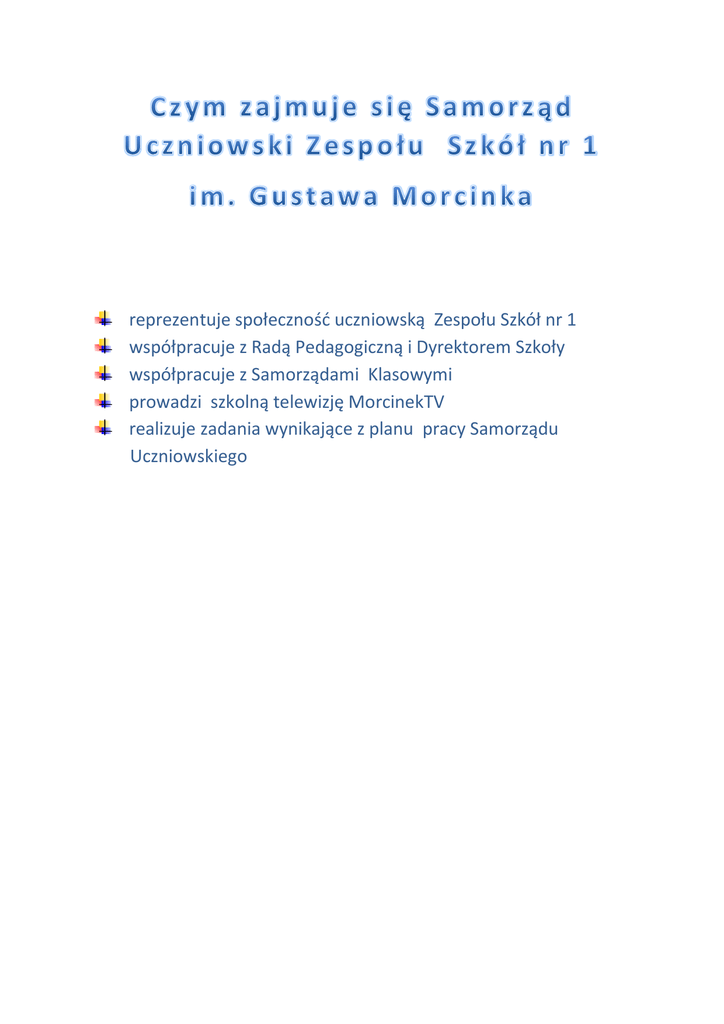 reprezentuje społeczność uczniowską Zespołu Szkół nr 1 współpracuje z Radą Pedagogiczną i Dyrektorem Szkoły współpracuje z Samorządami Klasowymi prowadzi szkolną telewizję MorcinekTV realizuje zadania wynikające z planu pracy Samorządu Uczniowskiego