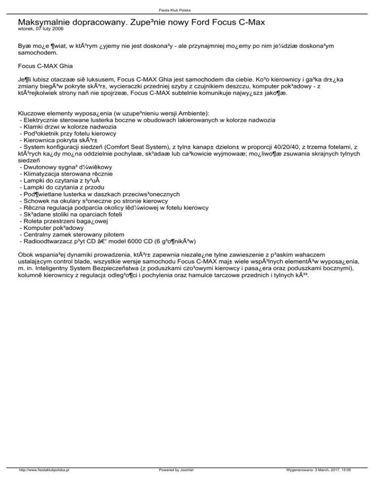 Fiesta Klub Polska Maksymalnie dopracowany. Zupe³nie nowy Ford Focus C-Max wtorek, 07 luty 2006 Byæ mo¿e ¶wiat, w którym ¿yjemy nie jest doskona³y - ale przynajmniej mo¿emy po nim je¼dziæ doskona³ym samochodem. Focus C-MAX Ghia Je¶li lubisz otaczaæ siê luksusem, Focus C-MAX Ghia jest samochodem dla ciebie. Ko³o kierownicy i ga³ka dr±¿ka zmiany biegów pokryte skór±, wycieraczki przedniej szyby z czujnikiem deszczu, komputer pok³adowy - z którejkolwiek strony nañ nie spojrzeæ, Focus C-MAX subtelnie komunikuje najwy¿sz± jako¶æ. Kluczowe elementy wyposa¿enia (w uzupe³nieniu wersji Ambiente): - Elektrycznie sterowane lusterka boczne w obudowach lakierowanych w kolorze nadwozia - Klamki drzwi w kolorze nadwozia - Pod³okietnik przy fotelu kierowcy - Kierownica pokryta skór± - System konfiguracji siedzeñ (Comfort Seat System), z tyln± kanap± dzielon± w proporcji 40/20/40, z trzema fotelami, z których ka¿dy mo¿na oddzielnie pochylaæ, sk³adaæ lub ca³kowicie wyjmowaæ; mo¿liwo¶æ zsuwania skrajnych tylnych siedzeñ - Dwutonowy sygna³ d¼wiêkowy - Klimatyzacja sterowana rêcznie - Lampki do czytania z ty³u - Lampki do czytania z przodu - Pod¶wietlane lusterka w daszkach przeciws³onecznych - Schowek na okulary s³oneczne po stronie kierowcy - Rêczna regulacja podparcia okolicy lêd¼wiowej w fotelu kierowcy - Sk³adane stoliki na oparciach foteli - Roleta przestrzeni baga¿owej - Komputer pok³adowy - Centralny zamek sterowany pilotem - Radioodtwarzacz p³yt CD – model 6000 CD (6 g³o¶ników) Obok wspania³ej dynamiki prowadzenia, któr± zapewnia niezale¿ne tylne zawieszenie z p³askim wahaczem ustalaj±cym control blade, wszystkie wersje samochodu Focus C-MAX maj± wiele wspólnych elementów wyposa¿enia, m. in. Inteligentny System Bezpieczeñstwa (z poduszkami czo³owymi kierowcy i pasa¿era oraz poduszkami bocznymi), kolumnê kierownicy z regulacj± odleg³o¶ci i pochylenia oraz hamulce tarczowe przednich i tylnych kó³. http://www.fiestaklubpolska.pl Powered by Joomla! Wygenerowano: 3 March, 2017, 15:05