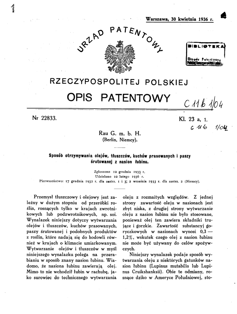 Warszawa, 30 kwietnia 1936 r. ,v o PAT^^o ■hłliotkka) J- Orzętiw Patentowa RZECZYPOSPOLITEJ POLSKIEJ OPIS PATENTOWY Nr 22833. CMkwk KI. 23 a, l. C44b Rau G. m. b. H. (Berlin, Niemcy). Sposób otrzymywania olejów, tłuszczów, kuchów prasowanych i paszy śrutowanej z nasion łubinu. Zgłoszono 12 grudnia 1933 r« Udzielono 22 lutego 1936 r. Pierwszeństwo: 17 grudnia 1932 r. dla zastrz. 1 i 3; 2 września 1933 r. dla zastrz. 2 (Niemcy). Przemysł tłuszczowy i olejowy jest za¬ leżny w dużym stopniu od przeróbki ro¬ ślin, rosnących tylko w krajach zwrotni¬ kowych lub podzwrotnikowych, np. soi. Wynalazek niniejszy dotyczy wytwarzania olejów i tłuszczów, kuchów prasowanych, paszy śrutowanej i podobnych produktów z roślin, które nadają się do hodowli rów¬ nież w krajach o klimacie umiarkowanym. Wytwarzanie olejów i tłuszczów w myśl niniejszego wynalazku polega na przera¬ bianiu w sposób znany nasion łubinu. Wia¬ oleju z rozmaitych względów. Z jednej strony zawartość oleju w nasionach jest zbyt niska, z drugiej strony wytwarzanie oleju z nasion łubinu nie było stosowane, ponieważ olej ten zawiera składniki tru¬ jące i gorzkie. Zawartość substancyj go¬ ryczkowych w nasionach wynosi 0,3 — 1,2%, wskutek czego olej z nasion łubinu nie może być używany do celów spożyw¬ czych. Niniejszy wynalazek podaje sposób wy¬ twarzania oleju z niektórych gatunków na¬ domo, że nasiona łubinu zawierają olej. Mimo to nie wchodził! łubin w rachubę, ja¬ sion łubinu (Lupinus mutabilis lub Lupi- ko surowiec do technicznego wytwarzania snące dziko w Ameryce Południowej, sto- nus Cruikshanksii). Obie te odmiany, ro¬ i/oil sowane były dotychczas, jako ozdoba w nikami i następne odparowanie rozpu¬ ogrodach i nie wchodziły w rachubę, jako szczalnika. rośliny uprawne. Wymienione dwa gatun¬ Oleje, tak otrzymane, mogą być użyte jako tłuszcze jadalne, jako smary i do wszelkich innych celów technicznych. Ku¬ ki łubinu zawierają w swoich nasionach, jak wykazały badania, około 14% oleju. Próby uprawy tych gatunków łubinu w chy z nasion albo pozostałości po ekstrak¬ krajach o umiarkowanym klimacie dały wy¬ cji stosuje się do najróżniejszych niki zupełnie zadowalające. Do uprawy łubinu wybiera się drogą selekcji nasiona, posiadające substancje goryczkowe w ilościach minimalnych (mniej niż 3%) lub) wcale pozbawione tych składników trujących. W korzystnych przy¬ padkach zawartość alkaloidów nie prze¬ kracza 0,01 %. Oleje, wytwarzane z powyż¬ szych gatunków łubinu, wykazują jeszcze np. jako nawozy lub jako paszę dla bydła. mniejszą zawartość składników trujących. Również dzięki selekcji można otrzy¬ mać nasiona wspomnianych gatunków łubi¬ nu, zawierające do 16% oleju. Drogą se¬ lekcji łubinu niebieskiego lub żółtego (Lupinus angustifolius, Lupinus liteus i Lupi¬ celów, Zastrzeżenia patentowe. 1. Sposób otrzymywania olejów i tłu¬ szczów, kuchów prasowanych, paszy, śruto¬ wanej z nasion łubinu, znamienny tern, że wytłacza się lub ekstrahuje nasiona łubi¬ nu, pozbawione alkaloidów i zawierające dużo oleju, otrzymane zapomocą hodowli selekcyjnej. 2. Sposób według zastrz. 1, znamien¬ ny tern, że używa się nasion Lupinus mutabilis i Lupinus Cruikshanksii, zawierajଠcych ponad 16% oleju. nus albus), zawierającego' w swych nasio¬ 3. Sposób według zastrz. 1, znamien¬ nach 5 —■ 7%i oleju, otrzymuje się nasiona o zawartościi oleju powyżej 12%. Takie same wyniki otrzymuje się przy selekcji nasion łubinu: Lupinus thermis, Lupinus polyphillus i Lupinus perennis. Olej i tłuszcz z nasion wyżej wspomnia¬ nych łubinów otrzymuje się zwykłym spo¬ sobem przez rozdrabnianie nasion łubinu w odpowiednich urządzeniach i następne pra¬ sowanie przy ewentualnem ogrzewaniu al¬ ny tern, że używa się nasion Lupinus albus, Lupinus luteus, Lupinus angustifolius, za¬ wierających ponad 12% oleju. 4. Sposób według zastrz. 1, znamien¬ ny tern, że używa się nasion Lupinus pe¬ rennis, Lupinus thermis i Lupinus polyphilluc, zawierających ponad 12% oleju. bo ekstrakcję odpowiedniemi rozpuszczal¬ Druk L. Bogusławskiego i Ski, Warszawa. Rau G. m. b. H. Zastępca: Inż, F. Winnicki, rzecznik patentowy.