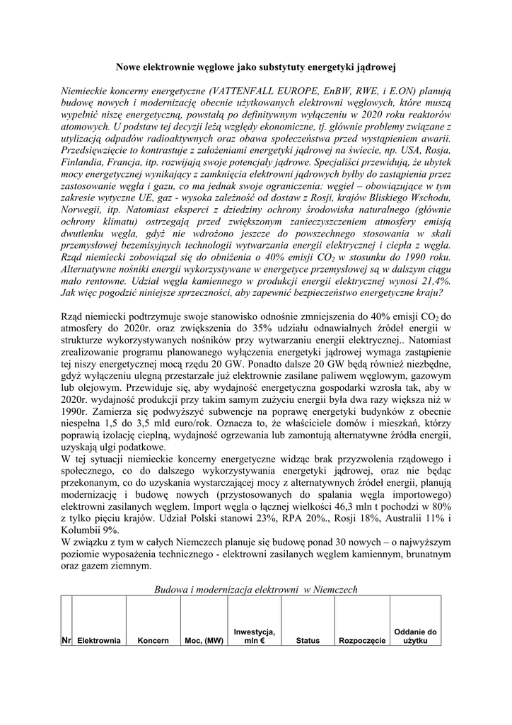 Nowe elektrownie węglowe jako substytuty energetyki jądrowej Niemieckie koncerny energetyczne (VATTENFALL EUROPE, EnBW, RWE, i E.ON) planują budowę nowych i modernizację obecnie użytkowanych elektrowni węglowych, które muszą wypełnić niszę energetyczną, powstałą po definitywnym wyłączeniu w 2020 roku reaktorów atomowych. U podstaw tej decyzji leżą względy ekonomiczne, tj. głównie problemy związane z utylizacją odpadów radioaktywnych oraz obawa społeczeństwa przed wystąpieniem awarii. Przedsięwzięcie to kontrastuje z założeniami energetyki jądrowej na świecie, np. USA, Rosja, Finlandia, Francja, itp. rozwijają swoje potencjały jądrowe. Specjaliści przewidują, że ubytek mocy energetycznej wynikający z zamknięcia elektrowni jądrowych byłby do zastąpienia przez zastosowanie węgla i gazu, co ma jednak swoje ograniczenia: węgiel – obowiązujące w tym zakresie wytyczne UE, gaz - wysoka zależność od dostaw z Rosji, krajów Bliskiego Wschodu, Norwegii, itp. Natomiast eksperci z dziedziny ochrony środowiska naturalnego (głównie ochrony klimatu) ostrzegają przed zwiększonym zanieczyszczeniem atmosfery emisją dwutlenku węgla, gdyż nie wdrożono jeszcze do powszechnego stosowania w skali przemysłowej bezemisyjnych technologii wytwarzania energii elektrycznej i ciepła z węgla. Rząd niemiecki zobowiązał się do obniżenia o 40% emisji CO2 w stosunku do 1990 roku. Alternatywne nośniki energii wykorzystywane w energetyce przemysłowej są w dalszym ciągu mało rentowne. Udział węgla kamiennego w produkcji energii elektrycznej wynosi 21,4%. Jak więc pogodzić niniejsze sprzeczności, aby zapewnić bezpieczeństwo energetyczne kraju? Rząd niemiecki podtrzymuje swoje stanowisko odnośnie zmniejszenia do 40% emisji CO2 do atmosfery do 2020r. oraz zwiększenia do 35% udziału odnawialnych źródeł energii w strukturze wykorzystywanych nośników przy wytwarzaniu energii elektrycznej.. Natomiast zrealizowanie programu planowanego wyłączenia energetyki jądrowej wymaga zastąpienie tej niszy energetycznej mocą rzędu 20 GW. Ponadto dalsze 20 GW będą również niezbędne, gdyż wyłączeniu ulegną przestarzałe już elektrownie zasilane paliwem węglowym, gazowym lub olejowym. Przewiduje się, aby wydajność energetyczna gospodarki wzrosła tak, aby w 2020r. wydajność produkcji przy takim samym zużyciu energii była dwa razy większa niż w 1990r. Zamierza się podwyższyć subwencje na poprawę energetyki budynków z obecnie niespełna 1,5 do 3,5 mld euro/rok. Oznacza to, że właściciele domów i mieszkań, którzy poprawią izolację cieplną, wydajność ogrzewania lub zamontują alternatywne źródła energii, uzyskają ulgi podatkowe. W tej sytuacji niemieckie koncerny energetyczne widząc brak przyzwolenia rządowego i społecznego, co do dalszego wykorzystywania energetyki jądrowej, oraz nie będąc przekonanym, co do uzyskania wystarczającej mocy z alternatywnych źródeł energii, planują modernizację i budowę nowych (przystosowanych do spalania węgla importowego) elektrowni zasilanych węglem. Import węgla o łącznej wielkości 46,3 mln t pochodzi w 80% z tylko pięciu krajów. Udział Polski stanowi 23%, RPA 20%., Rosji 18%, Australii 11% i Kolumbii 9%. W związku z tym w całych Niemczech planuje się budowę ponad 30 nowych – o najwyższym poziomie wyposażenia technicznego - elektrowni zasilanych węglem kamiennym, brunatnym oraz gazem ziemnym. Budowa i modernizacja elektrowni w Niemczech Nr Elektrownia Koncern Moc, (MW) Inwestycja, mln € Status Rozpoczęcie Oddanie do użytku 1 BoA 2 RWE 1120 1100 w trakcie budowy 2006 2009 2 BoA 3 RWE 1120 1100 w trakcie budowy 2006 2010 3 Walsum 10 Steag 790 800 w trakcie budowy 2006 2010 4 Boxberg R Vattenfall 675 800 w trakcie budowy 2006 2011 5 Datteln 4 E-ON 1100 1200 w trakcie budowy 2007 2011 6 Moorburg 1 Vattenfall 840 850 zatwierdzona 2007 2011 7 Moorburg 2 Vattenfall 840 850 zatwierdzona 2007 2011 8 Mainz KMW 820 950 zatwierdzona 2008 2012 9 Brunsbüttel Electrabel 800 800 zatwierdzona 2008 2011 10 Westfalen D RWE 850 1000 zatwierdzona 2008 2011 11 Westfalen E RWE 850 1000 zatwierdzona 2008 2012 12 Herne 5 Steag 790 800 zatwierdzona 2008 2011 13 Dörpen BKW 900 1000 zatwierdzona 2009 2013 14 Lubmin Dong Energy 800 800 zatwierdzona 2008 2012 15 Karlsruhe EnBW 912 1000 zatwierdzona 2008 2011 16 GKM 8 GKM 900 1000 zatwierdzona 2009 2013 17 Ensdorf 4 RWE 850 1000 planowana 2008 2011 18 Ensdorf 5 RWE 850 1000 planowana 2008 2012 19 Lünen Trianel 820 1000 planowana 2008 2011 20 Staudinger E-ON 1200 1200 planowana 2008 2012 21 Third Unit E-ON 1100 1200 planowana 2009 2013 22 Stade Elecrabel 800 1000 planowana 2009 2012 23 BoA 4 RWE 1100 1400 planowana 2010 2014 24 BoA 5 RWE 1100 1400 planowana 2011 2015 25 Berlin Vattenfall 800 800 wstępny plan 2009 2012 26 Brunsbüttel Südweststrom 800 800 wstępny plan 2009 2012 27 Brunsbüttel Südweststrom 800 800 wstępny plan 2010 2013 28 CO2-free Unit RWE 450 1000 wstępny plan 2010 2014 29 CO2-free Unit E.ON 500 1000 wstępny plan 2010 2014 30 Lausward SWD 400 500 wstępny plan 2010 2012 31 Third Unit Steag 790 800 wstępny plan 2009 2012 32 Emden nieznany 900 900 wstępny plan nieokreślony nieokreślony 33 Uerdingen Trianel 820 800 wstępny plan 2009 2013 Bremen SWB 0 0 anulowana Köln Niehl RheinEnergie 0 0 anulowana Oceniając niniejsze przedsięwzięcie w aspekcie ochrony środowiska naturalnego będzie to trudny do uzyskania przyzwolenia społecznego problem, gdyż obecne elektrownie zasilane węglem kamiennym i brunatnym, w trakcie wytwarzania energii elektrycznej stanowią 40% udział w całkowitej emisji CO2 do atmosfery. Uwzględniając budowę dodatkowych elektrowni węglowych – nawet z całym systemem oddzielania/odfiltrowania ze spalin CO2 udział energetyki węglowej w emisjach dwutlenku węgla będzie jeszcze wyższy. Eksperci z koncernu energetycznego EWE Oldenburg uważają, że „bez budowy nowych 