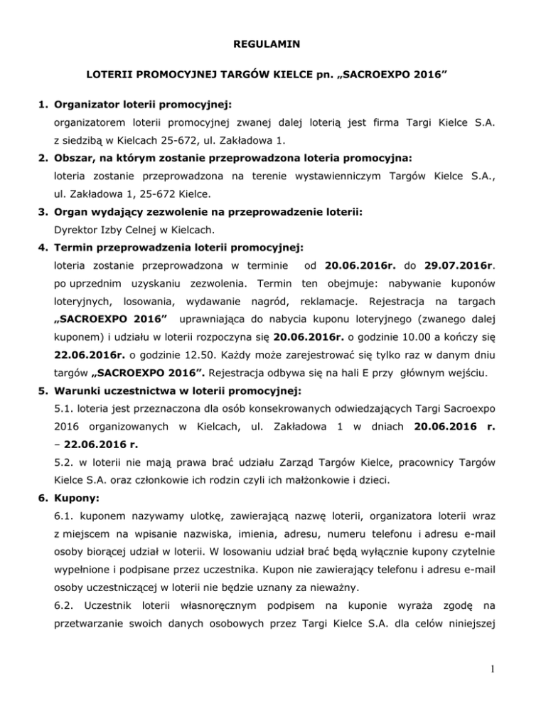 REGULAMIN LOTERII PROMOCYJNEJ TARGÓW KIELCE pn. „SACROEXPO 2016” 1. Organizator loterii promocyjnej: organizatorem loterii promocyjnej zwanej dalej loterią jest firma Targi Kielce S.A. z siedzibą w Kielcach 25-672, ul. Zakładowa 1. 2. Obszar, na którym zostanie przeprowadzona loteria promocyjna: loteria zostanie przeprowadzona na terenie wystawienniczym Targów Kielce S.A., ul. Zakładowa 1, 25-672 Kielce. 3. Organ wydający zezwolenie na przeprowadzenie loterii: Dyrektor Izby Celnej w Kielcach. 4. Termin przeprowadzenia loterii promocyjnej: loteria zostanie przeprowadzona w terminie od 20.06.2016r. do 29.07.2016r. po uprzednim ten loteryjnych, uzyskaniu losowania, „SACROEXPO 2016” zezwolenia. wydawanie Termin nagród, obejmuje: reklamacje. nabywanie Rejestracja kuponów na targach uprawniająca do nabycia kuponu loteryjnego (zwanego dalej kuponem) i udziału w loterii rozpoczyna się 20.06.2016r. o godzinie 10.00 a kończy się 22.06.2016r. o godzinie 12.50. Każdy może zarejestrować się tylko raz w danym dniu targów „SACROEXPO 2016”. Rejestracja odbywa się na hali E przy głównym wejściu. 5. Warunki uczestnictwa w loterii promocyjnej: 5.1. loteria jest przeznaczona dla osób konsekrowanych odwiedzających Targi Sacroexpo 2016 organizowanych w Kielcach, ul. Zakładowa 1 w dniach 20.06.2016 r. – 22.06.2016 r. 5.2. w loterii nie mają prawa brać udziału Zarząd Targów Kielce, pracownicy Targów Kielce S.A. oraz członkowie ich rodzin czyli ich małżonkowie i dzieci. 6. Kupony: 6.1. kuponem nazywamy ulotkę, zawierającą nazwę loterii, organizatora loterii wraz z miejscem na wpisanie nazwiska, imienia, adresu, numeru telefonu i adresu e-mail osoby biorącej udział w loterii. W losowaniu udział brać będą wyłącznie kupony czytelnie wypełnione i podpisane przez uczestnika. Kupon nie zawierający telefonu i adresu e-mail osoby uczestniczącej w loterii nie będzie uznany za nieważny. 6.2. Uczestnik loterii własnoręcznym podpisem na kuponie wyraża zgodę na przetwarzanie swoich danych osobowych przez Targi Kielce S.A. dla celów niniejszej 1 loterii zgodnie z ustawą z dnia 29 sierpnia 1997 roku o ochronie danych osobowych (Dz. U. z 2014 r., poz.1182 t.j.). 7. Nadzór nad Loterią: 7.1. Nad prawidłowością urządzania loterii czuwać będzie Komisja Nadzorującą powołana przez Organizatora, pracująca zgodnie z Regulaminem Komisji Nadzorującej. Komisja pracować będzie pod nadzorem osoby posiadającej stosowne świadectwo zawodowe wydane przez Ministra Finansów. Komisja będzie sporządzać protokoły z losowań nagród z podaniem wyników Loterii. Uczestnik Loterii może na swoje żądanie zapoznać się z protokołami w siedzibie Organizatora Loterii. W Skład Komisji Nadzorującej wchodzą: Michał Bogucki – specjalista ds. marketingu, Barbara Sipa – specjalista ds. public relations, Beata Ewa Wentura – Dudek - osoba sprawująca nadzór nad prawidłowym przebiegiem loterii posiadająca świadectwo zawodowe wydane przez Ministra Finansów. 8. Zasady prowadzenia loterii promocyjnej: warunkiem uczestnictwa w loterii jest łączne spełnienie poniższych warunków: 8.1. odwiedzenie w terminie 20.06.2016 r. – 22.06.2016r. Targów Sacroexpo 2016 organizowanych przez Targi Kielce S.A., bycie osobą konsekrowaną, rejestracja na targach „SACROEXPO 2016” uprawniająca do nabycia kuponu loteryjnego. 8.2. wypełnienie kuponu loteryjnego zwanego dalej kuponem zgodnie z pkt 6.1. Regulaminu. 8.3. wrzucenie wypełnionego kuponu zgodnie z pkt 6.1. Regulaminu do jednej z dwóch urn loteryjnych, znajdujących się na stoisku Franciszkańskiego Biura TurystycznoPielgrzymkowego Patron Travel, Hala E, nr stoiska 72. Każda urna loteryjna oznaczona jest napisem. Jedna urna oznaczona jest napisem: loteria promocyjna SACROEXPO 2016 – kategoria siostry zakonne. Druga urna oznaczona jest napisem: loteria promocyjna SACROEXPO 2016 – kategoria księża, zakonnicy. 8.4. W niniejszej loterii odbędą się dwa losowania nagród w dniach: 21.06.2016 r., i 22.06.2016 r. W losowaniu w dniu 21.06.2016 r. o godzinie 14.00 wezmą udział kupony wrzucone do poszczególnych urn loteryjnych w terminie od 20.06.2016 r. do 21.06.2016 r. do godziny 13.55. Losowanie nagród odbędzie się osobno z każdej urny. 2 W losowaniu w dniu 22.06.2016 r. o godzinie 13.00 wezmą udział kupony wrzucone do urn loteryjnych w terminie od 20.06.2016 r. do 22.06.2016 r. do godziny 12.55. Losowanie nagród odbędzie się osobno z każdej urny. Losowania odbędą się ręcznie, bezpośrednio z urny, przez osobę poproszoną spośród publiczności przez prowadzącego losowanie. Losowania odbędą się na stoisku Franciszkańskiego Biura Turystyczno- Pielgrzymkowego Patron Travel, Hala E, nr stoiska E72 w dniach: 21.06.2016 r. o godzinie 14.00 oraz 22.06.2015 r. o godzinie 13.00. Wylosowany zwycięski kupon nie wraca ponownie do danej urny loteryjnej. 8.5. Jeżeli wylosowany kupon nie spełnia warunków wynikających z pkt 6.1. Regulaminu zostaje wykluczony z loterii i losowanie danej nagrody zostaje powtórzone. 9. Zwycięzcy: 9.1. Zwycięzcy loterii w poszczególnych kategoriach zostaną wyłonieni w kolejnych dniach w drodze losowań kuponów z urn loteryjnych. 10. Wyniki losowań 10.1. Wyniki losowań zostaną podane do wiadomości podczas losowania poprzez odczytanie imienia i nazwiska zwycięzcy. Wyniki losowań zostaną opublikowane w ciągu trzech dni roboczych od każdego losowania na stronie www.targikielce.pl 10.2. W przypadku nieobecności zwycięzców podczas losowania nagród, zostaną oni powiadomieni przez Organizatora o wygranej listami poleconymi za potwierdzeniem odbioru, wysłanymi w ciągu trzech dni roboczych od momentu losowania pod adres wskazany na kuponie. 11. Nagrody 11.1. Nagrodami w losowaniach będą : w losowaniu w dniu 21.06.2016 r. – w kategorii siostry zakonne 1 nagroda w postaci czterodniowego wyjazdu do Rzymu dla jednej osoby, do realizacji w termin