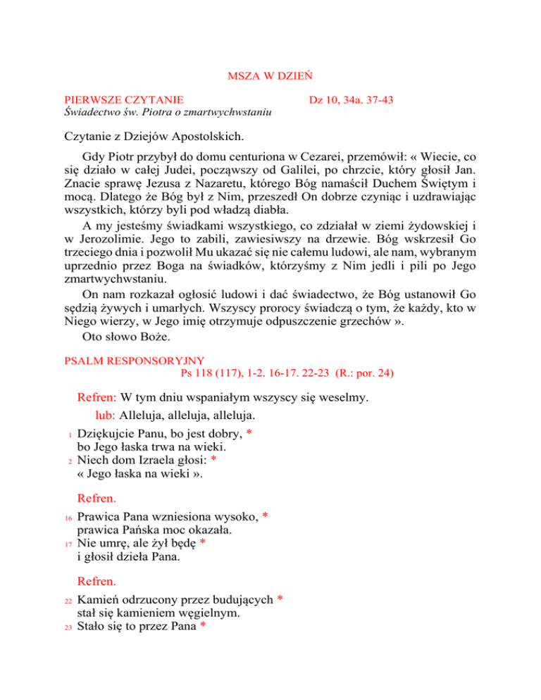 MSZA W DZIEŃ PIERWSZE CZYTANIE Świadectwo św. Piotra o zmartwychwstaniu Dz 10, 34a. 37-43 Czytanie z Dziejów Apostolskich. Gdy Piotr przybył do domu centuriona w Cezarei, przemówił: « Wiecie, co się działo w całej Judei, począwszy od Galilei, po chrzcie, który głosił Jan. Znacie sprawę Jezusa z Nazaretu, którego Bóg namaścił Duchem Świętym i mocą. Dlatego że Bóg był z Nim, przeszedł On dobrze czyniąc i uzdrawiając wszystkich, którzy byli pod władzą diabła. A my jesteśmy świadkami wszystkiego, co zdziałał w ziemi żydowskiej i w Jerozolimie. Jego to zabili, zawiesiwszy na drzewie. Bóg wskrzesił Go trzeciego dnia i pozwolił Mu ukazać się nie całemu ludowi, ale nam, wybranym uprzednio przez Boga na świadków, którzyśmy z Nim jedli i pili po Jego zmartwychwstaniu. On nam rozkazał ogłosić ludowi i dać świadectwo, że Bóg ustanowił Go sędzią żywych i umarłych. Wszyscy prorocy świadczą o tym, że każdy, kto w Niego wierzy, w Jego imię otrzymuje odpuszczenie grzechów ». Oto słowo Boże. PSALM RESPONSORYJNY Ps 118 (117), 1-2. 16-17. 22-23 (R.: por. 24) 1 2 16 17 22 23 Refren: W tym dniu wspaniałym wszyscy się weselmy. lub: Alleluja, alleluja, alleluja. Dziękujcie Panu, bo jest dobry, * bo Jego łaska trwa na wieki. Niech dom Izraela głosi: * « Jego łaska na wieki ». Refren. Prawica Pana wzniesiona wysoko, * prawica Pańska moc okazała. Nie umrę, ale żył będę * i głosił dzieła Pana. Refren. Kamień odrzucony przez budujących * stał się kamieniem węgielnym. Stało się to przez Pana * i cudem jest w naszych oczach. Refren. DRUGIE CZYTANIE Dążcie tam, gdzie jest Chrystus Kol 3, 1-4 Czytanie z Listu św. Pawła Apostoła do Kolosan. Bracia: Jeśliście razem z Chrystusem powstali z martwych, szukajcie tego, co w górze, gdzie przebywa Chrystus zasiadając po prawicy Boga. Dążcie do tego, co w górze, nie do tego, co na ziemi. Umarliście bowiem i wasze życie ukryte jest z Chrystusem w Bogu. Gdy się ukaże Chrystus, nasze życie, wtedy i wy razem z Nim ukażecie się w chwale. Oto słowo Boże. Albo do wyboru: DRUGIE CZYTANIE Wyrzućcie stary kwas 1 Kor 5, 6b-8 Czytanie z Pierwszego listu św. Pawła Apostoła do Koryntian. Bracia: Czyż nie wiecie, że odrobina kwasu całe ciasto zakwasza? Wyrzućcie więc stary kwas, abyście się stali nowym ciastem, jako że przaśni jesteście. Chrystus bowiem został złożony w ofierze jako nasza Pascha. Tak przeto odprawiajmy nasze święto nie przy użyciu starego kwasu, kwasu złości i przewrotności, lecz na przaśnym chlebie czystości i prawdy. Oto słowo Boże. SEKWENCJA Niech w święto radosne Paschalnej Ofiary Składają jej wierni uwielbień swych dary. Odkupił swe owce Baranek bez skazy, Pojednał nas z Ojcem i zmył grzechów zmazy. Śmierć zwarła się z życiem i w boju, o dziwy, Choć poległ Wódz życia, króluje dziś żywy. Maryjo, ty powiedz, coś w drodze widziała? Jam Zmartwychwstałego blask chwały ujrzała. Żywego już Pana widziałam, grób pusty, I świadków anielskich, i odzież, i chusty. Zmartwychwstał już Chrystus, Pan mój i nadzieja, A miejscem spotkania będzie Galileja. Wiemy, żeś zmartwychwstał, że ten cud prawdziwy, O Królu Zwycięzco, bądź nam miłościwy. Sekwencja obowiązuje w Niedzielę Zmartwychwstania Pańskiego. Można ją odmawiać w dni oktawy wielkanocnej. ŚPIEW PRZED EWANGELIĄ 1 Kor 5, 7b-8a Aklamacja: Alleluja, alleluja, alleluja. Chrystus został ofiarowany jako nasza Pascha. Odprawiajmy nasze święto w Panu. Aklamacja: Alleluja, alleluja, alleluja. EWANGELIA Apostołowie przy grobie Zmartwychwstałego J 20, 1-9 Słowa Ewangelii według świętego Jana. Pierwszego dnia po szabacie, wczesnym rankiem, gdy jeszcze było ciemno, Maria Magdalena udała się do grobu i zobaczyła kamień odsunięty od grobu. Pobiegła więc i przybyła do Szymona Piotra i do drugiego ucznia, którego Jezus miłował, i rzekła do nich: « Zabrano Pana z grobu i nie wiemy, gdzie Go położono ». Wyszedł więc Piotr i ów drugi uczeń i szli do grobu. Biegli oni obydwaj razem, lecz ów drugi uczeń wyprzedził Piotra i przybył pierwszy do grobu. A kiedy się nachylił, zobaczył leżące płótna, jednakże nie wszedł do środka. Nadszedł potem także Szymon Piotr, idący za nim. Wszedł on do wnętrza grobu i ujrzał leżące płótna oraz chustę, która była na Jego głowie, leżącą nie razem z płótnami, ale oddzielnie zwiniętą na jednym miejscu. Wtedy wszedł do wnętrza także i ów drugi uczeń, który przybył do grobu. Ujrzał i uwierzył. Dotąd bowiem nie rozumieli jeszcze Pisma, które mówi, że On ma powstać z martwych. Oto słowo Pańskie.