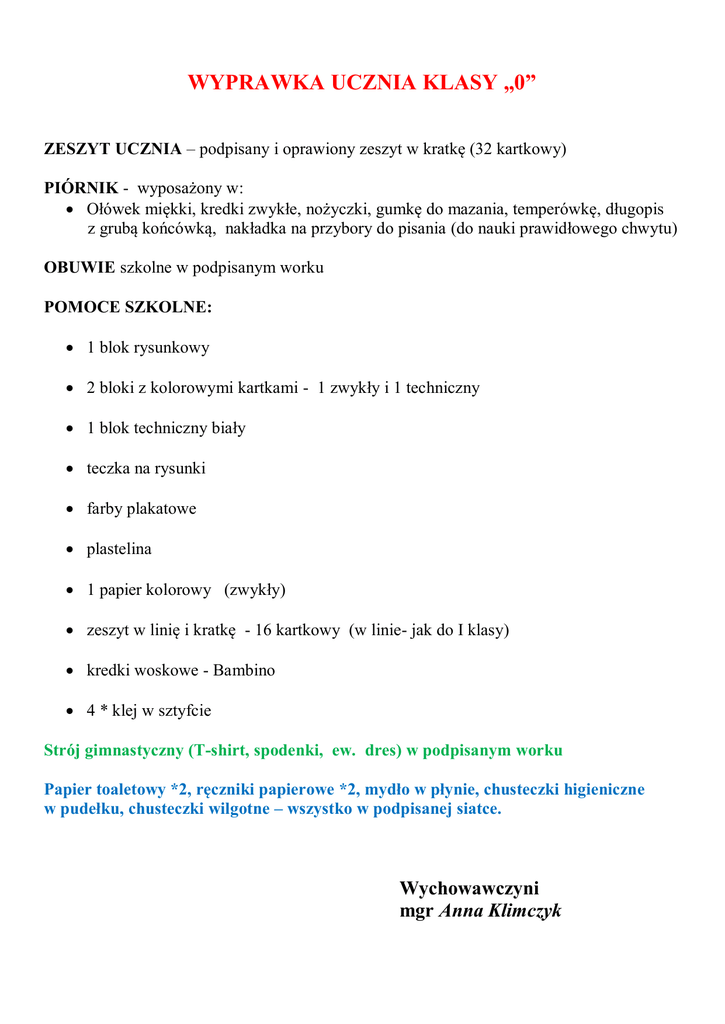 WYPRAWKA UCZNIA KLASY „0” ZESZYT UCZNIA – podpisany i oprawiony zeszyt w kratkę (32 kartkowy) PIÓRNIK - wyposażony w:  Ołówek miękki, kredki zwykłe, nożyczki, gumkę do mazania, temperówkę, długopis z grubą końcówką, nakładka na przybory do pisania (do nauki prawidłowego chwytu) OBUWIE szkolne w podpisanym worku POMOCE SZKOLNE:  1 blok rysunkowy  2 bloki z kolorowymi kartkami - 1 zwykły i 1 techniczny  1 blok techniczny biały  teczka na rysunki  farby plakatowe  plastelina  1 papier kolorowy (zwykły)  zeszyt w linię i kratkę - 16 kartkowy (w linie- jak do I klasy)  kredki woskowe - Bambino  4 * klej w sztyfcie Strój gimnastyczny (T-shirt, spodenki, ew. dres) w podpisanym worku Papier toaletowy *2, ręczniki papierowe *2, mydło w płynie, chusteczki higieniczne w pudełku, chusteczki wilgotne – wszystko w podpisanej siatce. Wychowawczyni mgr Anna Klimczyk