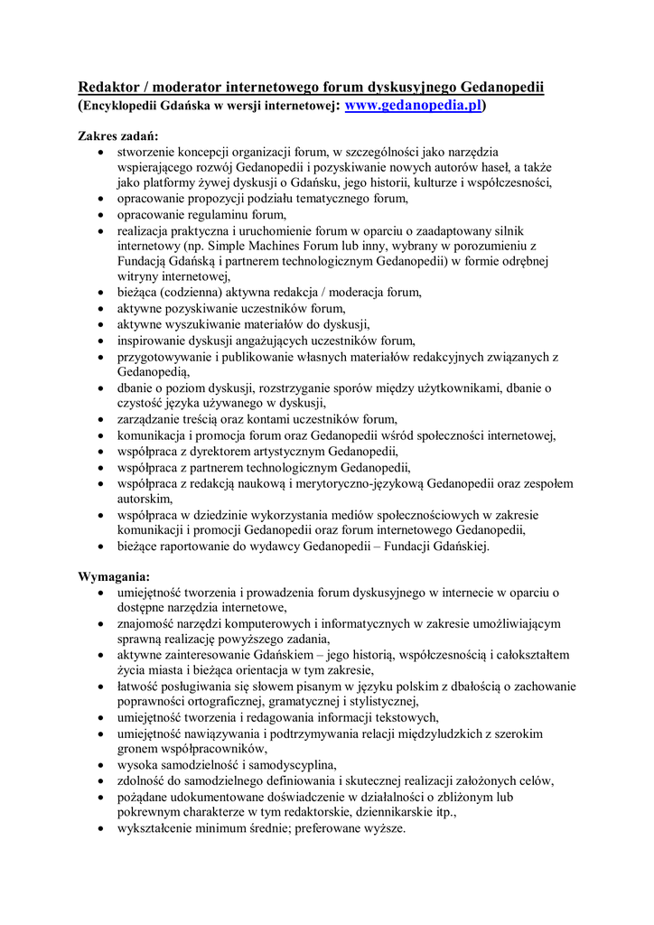 Redaktor / moderator internetowego forum dyskusyjnego Gedanopedii (Encyklopedii Gdańska w wersji internetowej: www.gedanopedia.pl) Zakres zadań: stworzenie koncepcji organizacji forum, w szczególności jako narzędzia wspierającego rozwój Gedanopedii i pozyskiwanie nowych autorów haseł, a także jako platformy żywej dyskusji o Gdańsku, jego historii, kulturze i współczesności, opracowanie propozycji podziału tematycznego forum, opracowanie regulaminu forum, realizacja praktyczna i uruchomienie forum w oparciu o zaadaptowany silnik internetowy (np. Simple Machines Forum lub inny, wybrany w porozumieniu z Fundacją Gdańską i partnerem technologicznym Gedanopedii) w formie odrębnej witryny internetowej, bieżąca (codzienna) aktywna redakcja / moderacja forum, aktywne pozyskiwanie uczestników forum, aktywne wyszukiwanie materiałów do dyskusji, inspirowanie dyskusji angażujących uczestników forum, przygotowywanie i publikowanie własnych materiałów redakcyjnych związanych z Gedanopedią, dbanie o poziom dyskusji, rozstrzyganie sporów między użytkownikami, dbanie o czystość języka używanego w dyskusji, zarządzanie treścią oraz kontami uczestników forum, komunikacja i promocja forum oraz Gedanopedii wśród społeczności internetowej, współpraca z dyrektorem artystycznym Gedanopedii, współpraca z partnerem technologicznym Gedanopedii, współpraca z redakcją naukową i merytoryczno-językową Gedanopedii oraz zespołem autorskim, współpraca w dziedzinie wykorzystania mediów społecznościowych w zakresie komunikacji i promocji Gedanopedii oraz forum internetowego Gedanopedii, bieżące raportowanie do wydawcy Gedanopedii – Fundacji Gdańskiej. Wymagania: umiejętność tworzenia i prowadzenia forum dyskusyjnego w internecie w oparciu o dostępne narzędzia internetowe, znajomość narzędzi komputerowych i informatycznych w zakresie umożliwiającym sprawną realizację powyższego zadania, aktywne zainteresowanie Gdańskiem – jego historią, współczesnością i całokształtem życia miasta i bieżąca orientacja w tym zakresie, łatwość posługiwania się słowem pisanym w języku polskim z dbałością o zachowanie poprawności ortograficznej, gramatycznej i stylistycznej, umiejętność tworzenia i redagowania informacji tekstowych, umiejętność nawiązywania i podtrzymywania relacji międzyludzkich z szerokim gronem współpracowników, wysoka samodzielność i samodyscyplina, zdolność do samodzielnego definiowania i skutecznej realizacji założonych celów, pożądane udokumentowane doświadczenie w działalności o zbliżonym lub pokrewnym charakterze w tym redaktorskie, dziennikarskie itp., wykształcenie minimum średnie; preferowane wyższe. Preferowana forma współpracy: Umowa cywilno-prawna. Współpraca na czas nieokreślony po okresie próbnym związanym ze skutecznym uruchomieniem forum. Fundacja Gdańska zastrzega sobie możliwość uzgodnienia innej formy współpracy w porozumieniu z preferowanym kandydatem. Miejsce współpracy: Praca o charakterze zdalnym z wykorzystaniem własnego narzędzia - komputera. Preferowane miejsce zamieszkania: Gdańsk lub najbliższe okolice - ze względu na konieczność utrzymywania bieżących kontaktów z wydawcą Gedanopedii i zespołem redakcyjnym Gedanopedii. Forma i zawartość ofert: Osoby zainteresowane współpracą prosimy o składanie ofert pisemnych zawierających: krótki list motywacyjny, CV, koncepcja realizacji i prowadzenia forum (nie dłuższa niż 2 strony A4) wraz z przewidywanym harmonogramem jej wdrożenia, propozycja stawki miesięcznej wynagrodzenia brutto z tytułu umowy cywilnoprawnej. Sposób i termin składania ofert: Oferty można nadsyłać w terminie do 23 września 2013 r. włącznie pod adresem e-mail [email protected] umieszczając w polu tematu dopisek „forum internetowe Gedanopedii – oferta współpracy” lub składać osobiście lub przesyłać pocztą pod adresem Fundacja Gdańska, ul. Szeroka 121/122 Gdańsk z dopiskiem jak wyżej. Decyduje data wpływu oferty do siedziby Fundacji Gdańskiej. Fundacja Gdańska zastrzega sobie prawo do kontaktu z wybranymi oferentami. Fundacja Gdańska zastrzega sobie prawo do ustalenia szczegółowych warunków współpracy w toku odrębnych uzgodnień z wybranym oferentem. Data publikacji: Gdańsk, 6 września 2013 r.
