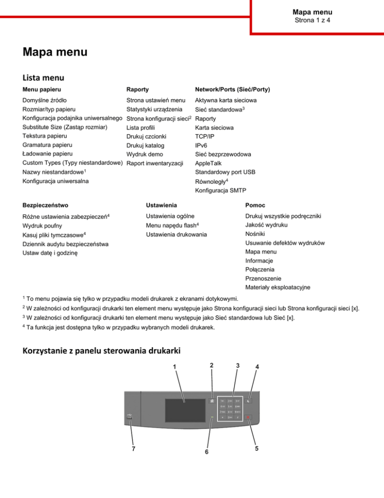 Mapa menu Strona 1 z 4 Mapa menu Lista menu Menu papieru Raporty Network/Ports (Sieć/Porty) Domyślne źródło Strona ustawień menu Aktywna karta sieciowa Rozmiar/typ papieru Statystyki urządzenia Sieć standardowa3 Konfiguracja podajnika uniwersalnego Strona konfiguracji sieci2 Raporty Substitute Size (Zastąp rozmiar) Karta sieciowa Lista profili Tekstura papieru TCP/IP Drukuj czcionki Gramatura papieru IPv6 Drukuj katalog Ładowanie papieru Sieć bezprzewodowa Wydruk demo Custom Types (Typy niestandardowe) Raport inwentaryzacji Nazwy AppleTalk niestandardowe1 Standardowy port USB Konfiguracja uniwersalna Równoległy4 Konfiguracja SMTP Bezpieczeństwo Ustawienia Różne ustawienia zabezpieczeń4 Ustawienia ogólne Menu napędu Wydruk poufny Kasuj pliki Pomoc Drukuj wszystkie podręczniki Jakość wydruku flash4 Nośniki Ustawienia drukowania tymczasowe4 Dziennik audytu bezpieczeństwa Usuwanie defektów wydruków Ustaw datę i godzinę Mapa menu Informacje Połączenia Przenoszenie Materiały eksploatacyjne 1 To menu pojawia się tylko w przypadku modeli drukarek z ekranami dotykowymi. 2 W zależności od konfiguracji drukarki ten element menu występuje jako Strona konfiguracji sieci lub Strona konfiguracji sieci [x]. 3 W zależności od konfiguracji drukarki ten element menu występuje jako Sieć standardowa lub Sieć [x]. 4 Ta funkcja jest dostępna tylko w przypadku wybranych modeli drukarek. Korzystanie z panelu sterowania drukarki 2 1 7 6 3 4 5 Mapa menu Strona 2 z 4 1 Użyj Działanie Wyświetlacz Wyświetlanie stanu drukarki i jej komunikatów. Konfigurowanie i obsługa drukarki. 2 Przycisk Strona główna Przejście do ekranu głównego. 3 Klawiatura Służy do wprowadzania cyfr, liter i symboli. 4 Przycisk Czuwanie Powoduje włączenie trybu czuwania lub hibernacji. Następujące czynności powodują wyjście drukarki z trybu czuwania: • • • • • Dotknięcie ekranu. Naciśnięcie dowolnego przycisku sprzętowego Otwieranie tacy lub przednich drzwiczek Wysłanie zadania drukowania z komputera. Wykonywanie operacji zerowania po włączeniu zasilania za pomocą głównego włącznika zasilania • Podłączenie urządzenia do portu USB 5 Przycisk Stop lub Anuluj Zatrzymanie działania drukarki. 6 Kontrolka Sprawdzenie stanu drukarki. 7 Port USB Podłączanie adaptera Bluetooth USB lub napędu flash do drukarki. Uwaga: Napędy flash obsługuje tylko port USB znajdujący się z przodu urządzenia. Opis kolorów kontrolki oraz przycisku czuwania Kolory kontrolki i przycisku czuwania na panelu sterowania drukarki informują o określonym stanie drukarki. Kontrolka Stan drukarki Wyłączona Drukarka jest wyłączona lub znajduje się w trybie hibernacji. Migające zielone światło Drukarka się nagrzewa, przetwarza dane lub drukuje zadanie. Ciągłe zielone światło Drukarka jest włączona, ale bezczynna. Migające czerwone światło Drukarka wymaga interwencji użytkownika. Kontrolka przycisku czuwania Stan drukarki Wyłączona Drukarka jest bezczynna lub jest w stanie gotowości. Ciągłe bursztynowe światło Drukarka jest w trybie czuwania. Migający kolor bursztynowy Drukarka jest wyprowadzana z — lub wprowadzana do stanu hibernacji. Migające bursztynowe światło włącza się na 0,1 sekundy Drukarka znajduje się w trybie hibernacji. i całkowicie wyłącza na 1,9 sekundy. Opis ekranu głównego Gdy drukarka jest włączona, na wyświetlaczu urządzenia jest wyświetlany ekran podstawowy, nazywany ekranem głównym. Przyciski oraz ikony ekranu głównego umożliwiają wykonanie określonej czynności. Uwaga: Wygląd ekranu głównego zależy od własnych ustawień ekranu, ustawień dokonanych przez administratora i aktywnych rozwiązań wbudowanych. Mapa menu Strona 3 z 4 1 8 Przycisk 2 7 3 6 4 5 Działanie 1 Zmień język Zmiana podstawowego język drukarki. 2 Zakładki Tworzenie, porządkowanie i zapisywanie zestawu zakładek (adresów URL) w postaci widoku drzewa folderów i łączy do plików. Uwaga: Widok drzewa nie zawiera zakładek utworzonych w ramach opcji Formularze i ulubione, a zawartych w drzewie nie można użyć z poziomu opcji Formularze i ulubione. 3 Zadania wstrzymane Wyświetlenie wszystkich aktualnie wstrzymanych zadań. 4 USB Umożliwia przeglądanie, wybieranie lub drukowanie zdjęć i dokumentów z pamięci typu flash. Uwaga: Ikona ta jest wyświetlana, wyłącznie gdy użytkownik powróci do ekranu głównego, a do drukarki podłączony jest dysk flash lub karta pamięci. 5 Menu Dostęp do menu drukarki. Uwaga: Menu są dostępne, tylko gdy drukarka znajduje się w stanie gotowości. 6 Pasek komunikatów o stanie drukarki • Wyświetlanie komunikatów o bieżącym stanie drukarki, takich jak Gotowa lub Zajęta. • Wyświetlanie komunikatów o warunkach pracy drukarki, takich jak Bęben pusty lub Niski poziom toneru w kasecie drukującej. • Wyświetlanie komunikatów o problemach wymagających interwencji użytkownika oraz dostarczanie instrukcji umożliwiających ich usunięcie. 7 Stan/Materiały eksploatacyjne • Wyświetla ostrzeżenie lub komunikat o błędzie, gdy do kontynuowania pracy drukarki wymagana jest interwencja użytkownika. • Umożliwia wyświetlenie szczegółowych informacji o danym ostrzeżeniu lub komunikacie i sposobie jego usunięcia. 8 Wskazówki Wyświetlanie informacji pomocy kontekstowej. Inne elementy, które mogą być także wyświetlane na ekranie głównym: Przycisk Działanie Wyszukaj wstrzymane zadania Wyszukiwanie aktualnie wstrzymanych zadań. Zadania według użytkownika Dostęp do zadań drukowania zapisanych przez użytkownika. Profile i rozwiązania Dostęp do profili i rozwiązań. Mapa menu Strona 4 z 4 Funkcje Funkcja Opis Alarm wymagający interwencji Ta ikona jest wyświetlana i zapala się czerwony wskaźnik, gdy w przypadku jakiejś funkcji wystąpi alarm wymagający interwencji. Ostrzeżenie Ta ikona jest wyświetlana, gdy wystąpi błąd. Adres IP drukarki Adres IP drukarki znajdu
