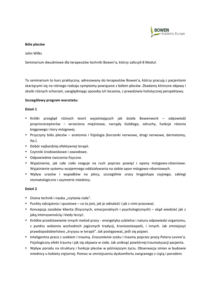 Bóle pleców John Wilks Seminarium dwudniowe dla terapeutów techniki Bowen’a, którzy zaliczyli 8 Moduł. To seminarium to kurs praktyczny, adresowany do terapeutów Bowen’a, którzy pracują z pacjentami skarżącymi się na różnego rodzaju symptomy powiązane z bólem pleców. Zbadamy kliniczne objawy i skutki różnych schorzeń, uwzględniając sposoby ich leczenia, z prawdziwie holistycznej perspektywy. Szczegółowy program warsztatu: Dzień 1 • Krótki przegląd różnych teorii wyjaśniających jak działa Bowenwork – odpowiedź proprioreceptorów – wrzeciona mięśniowe, narządy Goldiego, odruchy, funkcje rdzenia kręgowego i kory mózgowej. • Przyczyny bólu pleców – anatomia i fizjologia (korzonki nerwowe, drogi nerwowe, dermatomy, itp.). • Dobór najbardziej efektywnej terapii. • Czynniki środowiskowe i zawodowe. • Odpowiednie ćwiczenia fizyczne. • Wyjaśnienie, jak całe ciało reaguje na ruch poprzez powięź i opony mózgowo-‐rdzeniowe. Wyjaśnienie systemu wzajemnego oddziaływania na siebie opon mózgowo-‐rdzeniowych. • Wpływ urazów i wypadków na plecy, szczególnie urazy kręgosłupa szyjnego, zabiegi stomatologiczne i asymetrie miednicy. Dzień 2 • Ocena technik i nauka „czytania ciała”. • Punkty odciążenia i spustowe – co to jest, jak je odnaleźć i jak z nimi pracować. • Koncepcja zasobów klienta (fizycznych, emocjonalnych i psychologicznych) – skąd wiedzieć jak z jaką intensywnością i kiedy leczyć. • Krótkie przedstawienie innych metod pracy -‐ energetyka subtelna i natura odpowiedzi organizmu, z punktu widzenia wschodnich jogicznych tradycji, kranioosteopatii, i innych. Jak zmniejszyć prawdopodobieństwo „kryzysu w terapii”. Jak postępować, jeśli się pojawi. • Inteligentna praca z szokiem i traumą. Zrozumienie szoku i traumy poprzez pracę Petera Levine’a. Fizjologiczny efekt traumy i jak się objawia w ciele. Jak uniknąć powtórnej traumatyzacji pacjenta. • Wpływ porodu na struktury i funkcje pleców w późniejszym życiu. Obserwacja zmian w budowie miednicy u kobiety ciężarnej. Pomoc w zmniejszeniu dyskomfortu związanego z ciążą i porodem. • Zręczność w rozpoznawaniu miejsc połączeń krzyżowo-‐biodrowych. Kolejne testy dla rozpoznania wypadnięcia dysku (prolaps) i innych problemów. Podczas seminarium będzie czas na dyskusję. Celem tego seminarium jest przygotowanie Państwa do tworzenia bardziej efektywnych programów terapeutycznych dla pacjentów, dzięki dogłębnemu zrozumieniu etiologii różnych schorzeń, które wpływają na plecy, niektóre z nich (jak np. fibromialgia) są ledwo rozpoznane przez medycynę tradycyjną. W czasie seminarium będziemy korzystać z szerokiej gamy materiałów naukowych jak: wykresy, modele, szczegółowe rysunki anatomiczne, będziemy również uczyć się prostych testów „czytania ciała” i oceny technik dla zwiększenia efektów terapeutycznych. Na seminarium unikamy powielania materiału prezentowanego przez Ossie’go i Elaine podczas ich seminariów. Wybrane komentarze terapeutów techniki Bowen’a, którzy uczestniczyli w tym kursie: • Profesjonalne prezentacje prowadzone w bardzo życzliwej, humorystycznej i kreatywnej atmosferze. Najlepsze wyjaśnienie -‐ jak działa Bowenwork, jakie do tej pory słyszałem. • Dobrze mieć dodatkowe informacje. Uważam, że niektóre z prezentowanych informacji powinny być uwzględnione w podstawowym szkoleniu. • Dobra równowaga między praktyką a teorią. • Różnorodne informacje, przedstawione w bardzo interesujący sposób, zmuszające do myślenia. • Wspaniały warsztat. Dużo różnorodnych tematów, praktyki i myślenia. John Wilks przez całe życie interesuje się aspektami psychoterapeutycznymi pracy z ciałem, a szczególnie ich związkami z jogą i medytacją. Kiedy w roku 1995 odkrył technikę Bowena, praktykował bardzo intensywnie w różnych klinikach na południu Anglii. Był zarówno w zarządzie Stowarzyszenia Bowena w Anglii, jak również stowarzyszenia terapii kraniologicznej w Anglii. Jest wykształconym masażystą i refleksoterapeutą, a w swoich szkoleniach wykorzystuje sporo swojego doświadczenia medycznego.