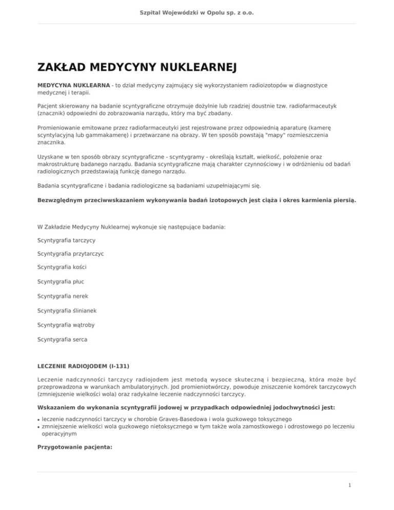 Szpital Wojewódzki w Opolu sp. z o.o. ZAKŁAD MEDYCYNY NUKLEARNEJ MEDYCYNA NUKLEARNA - to dział medycyny zajmujący się wykorzystaniem radioizotopów w diagnostyce medycznej i terapii. Pacjent skierowany na badanie scyntygraficzne otrzymuje dożylnie lub rzadziej doustnie tzw. radiofarmaceutyk (znacznik) odpowiedni do zobrazowania narządu, który ma być zbadany. Promieniowanie emitowane przez radiofarmaceutyki jest rejestrowane przez odpowiednią aparaturę (kamerę scyntylacyjną lub gammakamerę) i przetwarzane na obrazy. W ten sposób powstają "mapy" rozmieszczenia znacznika. Uzyskane w ten sposób obrazy scyntygraficzne - scyntygramy - określają kształt, wielkość, położenie oraz makrostrukturę badanego narządu. Badania scyntygraficzne mają charakter czynnościowy i w odróżnieniu od badań radiologicznych przedstawiają funkcję danego narządu. Badania scyntygraficzne i badania radiologiczne są badaniami uzupełniającymi się. Bezwzględnym przeciwwskazaniem wykonywania badań izotopowych jest ciąża i okres karmienia piersią. W Zakładzie Medycyny Nuklearnej wykonuje się następujące badania: Scyntygrafia tarczycy Scyntygrafia przytarczyc Scyntygrafia kości Scyntygrafia płuc Scyntygrafia nerek Scyntygrafia ślinianek Scyntygrafia wątroby Scyntygrafia serca LECZENIE RADIOJODEM (I-131) Leczenie nadczynności tarczycy radiojodem jest metodą wysoce skuteczną i bezpieczną, która może być przeprowadzona w warunkach ambulatoryjnych. Jod promieniotwórczy, powoduje zniszczenie komórek tarczycowych (zmniejszenie wielkości wola) oraz radykalne leczenie nadczynności tarczycy. Wskazaniem do wykonania scyntygrafii jodowej w przypadkach odpowiedniej jodochwytności jest: ● ● leczenie nadczynności tarczycy w chorobie Graves-Basedowa i wola guzkowego toksycznego zmniejszenie wielkości wola guzkowego nietoksycznego w tym także wola zamostkowego i odrostowego po leczeniu operacyjnym Przygotowanie pacjenta: 1 Szpital Wojewódzki w Opolu sp. z o.o. ● Zaleca się przed leczeniem odstawienie (pod nadzorem Lekarza Prowadzącego) następujących leków: 1. 2. 3. 4. ● ● leki hamujące pracę tarczycy (Metizol, Thyrozol, Thiamazol) na okres 7 dni leki wykrztuśne, suplementy diety, środki odkażające zawierające preparaty jodu na okres 1-2 tygodni preparaty amiodaronu (Opacorden, Cordarone) na okres 3-6 miesięcy po podaniu jodowych środków kontrastowych (w czasie tomografii komputerowej, koronarografii) leczenie radiojodem możliwe jest nie wcześniej niż po 4-6 tygodniach guzy tarczycy należy ocenić cytologicznie przed podaniem radiojodu – biopsja zmiany ogniskowej powinna być przeprowadzona co najmniej 14 dni przed planowanym leczeniem, chory na badanie zgłasza się po lekkim śniadaniu. Jeśli chory jest leczony z powodu chorób współistniejących, powinien zażyć odpowiednie zalecane leki. Przebieg leczenia: ● ● ● ● ● ● leczenie radiojodem jest procedurą dwudniową realizowaną w trybie ambulatoryjnym: pacjent w czasie pierwszej wizyty, na podstawie wywiadu, badania lekarskiego, wcześniej wykonanych badań obrazowych oraz oznaczeń stężenia hormonów we krwi, zostaje zakwalifikowany do leczenia radiojodem chory zgłasza się do Zakładu Medycyny Nuklearnej z dowodem osobistym, legitymacją ubezpieczeniową oraz skierowaniem na leczenie, które powinno zawierać opis problemu klinicznego w tym wyniki dotychczasowych badań laboratoryjnych oraz wynik badania USG tarczycy. W tym dniu chory otrzymuje kapsułkę zawierającą radioizotop w dawce diagnostycznej, którą połyka popijając obficie wodą. w dniu następnym wykonane jest badanie scyntygraficzne – chory zasiada przed gammakamerą - urządzeniem dokonującym pomieru aktywności promieniowania znad tarczycy. Badanie to trwa około 5 minut. Na podstawie scyntygrafii określa się jodochwytność i oblicza aktywność radiofarmaceutyku konieczną do leczenia chorego. W razie braku przeciwskazań w tym samym dniu przeprowadzane jest leczenie – chory otrzymuje kapsułkę zawierającą przeznaczony dla niego izotopu, którą popija obficie wodą, po przebytym leczeniu możliwe jest korzystanie z komunikacji zbiorowej do 2 godzin od podania izotopu – zatem zalecany jest transport własnym środkim lokomocji, zwłaszcza na większą odległość. po leczeniu radiojodem obowiązuje unikanie przez okres ok 14 dni dzieci do 18 roku życia i kobiet w ciąży Leczenie radiojodem na podstawie skierowania z Poradni Endokrynologicznej oraz POZ jest refundowane przez NFZ. Do aktualnie obowiązującego skierowania (zgodnie z wymogami NFZ) należy dołączyć poniższą ankietę. Załączniki: Ankieta do skierowania na badanie izotopowe Ankieta do skierowania na leczenie izotopowe 2